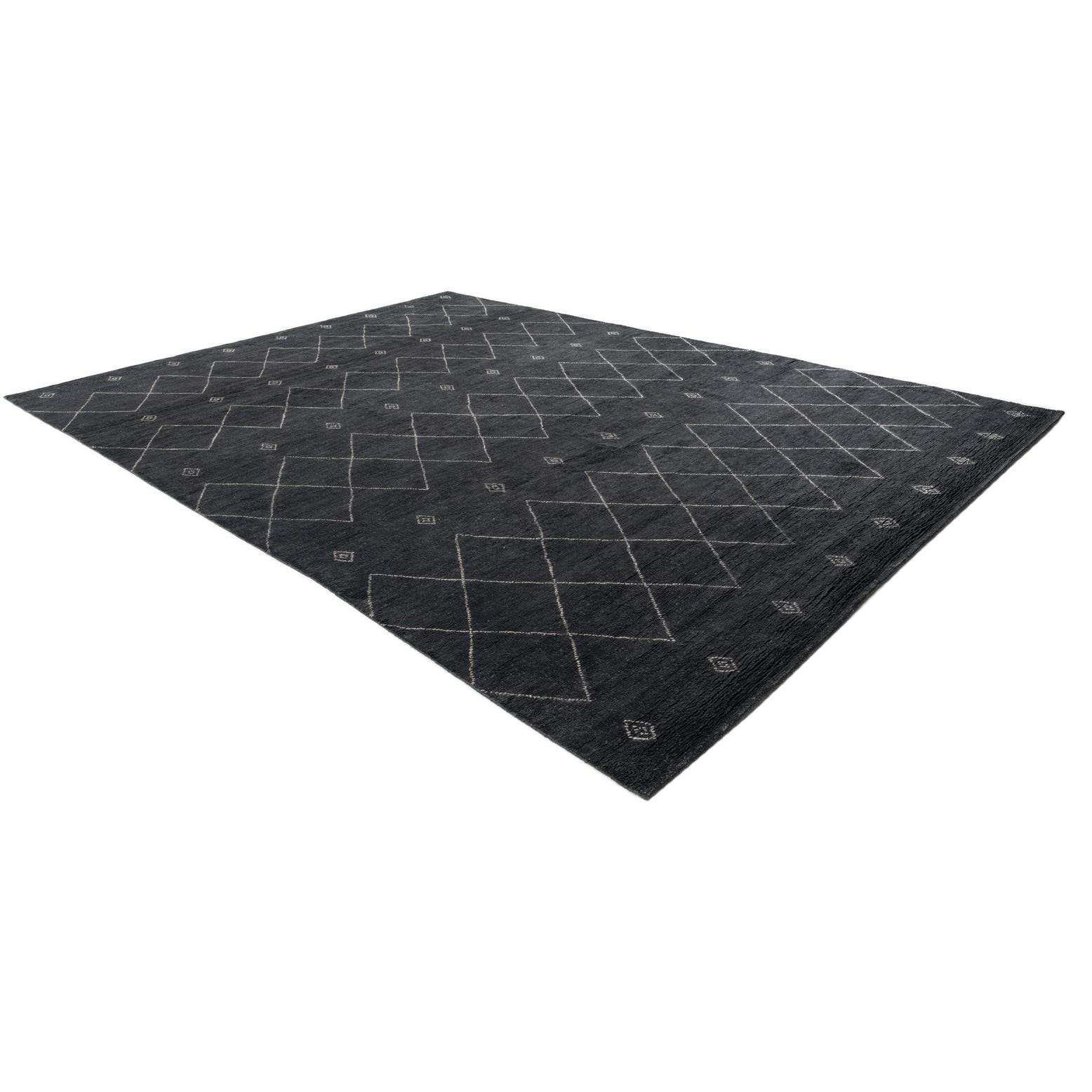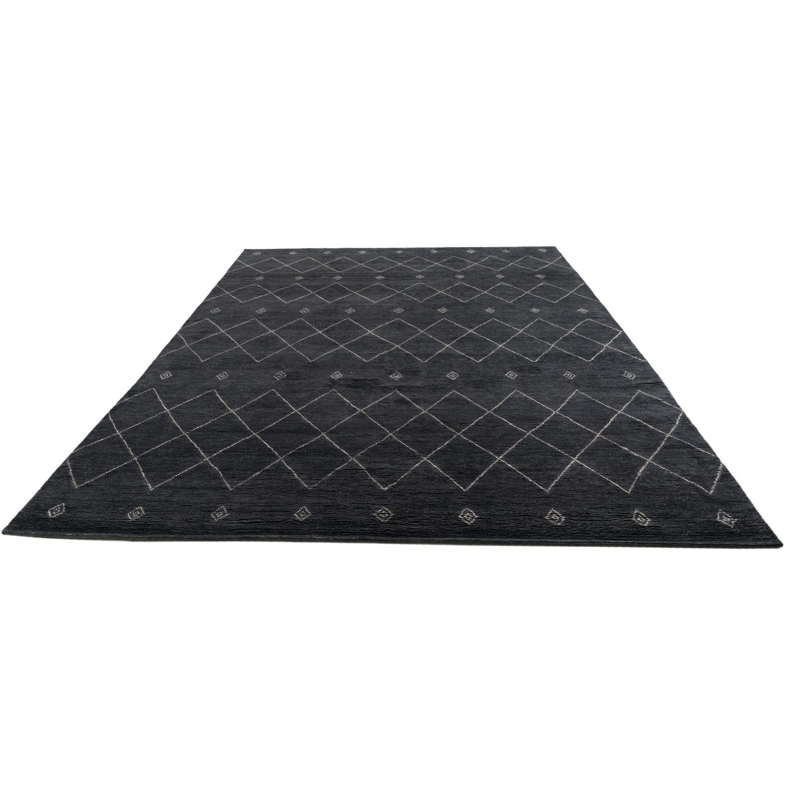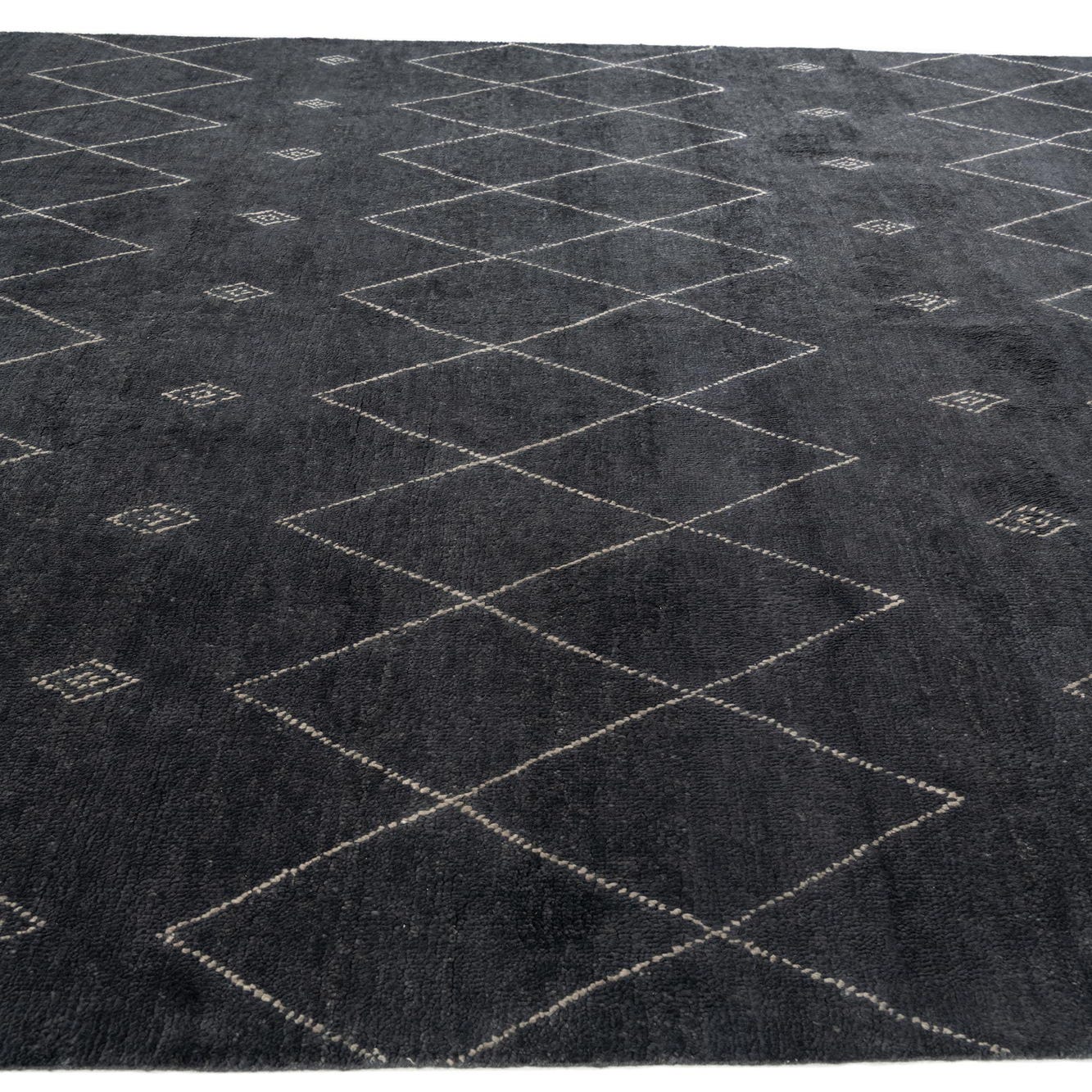 A 9x12 rectangular black wool rug with a modern diamond pattern in a lighter contrasting color.