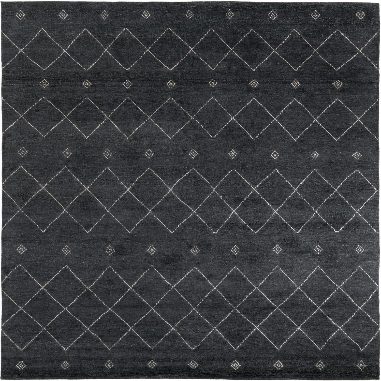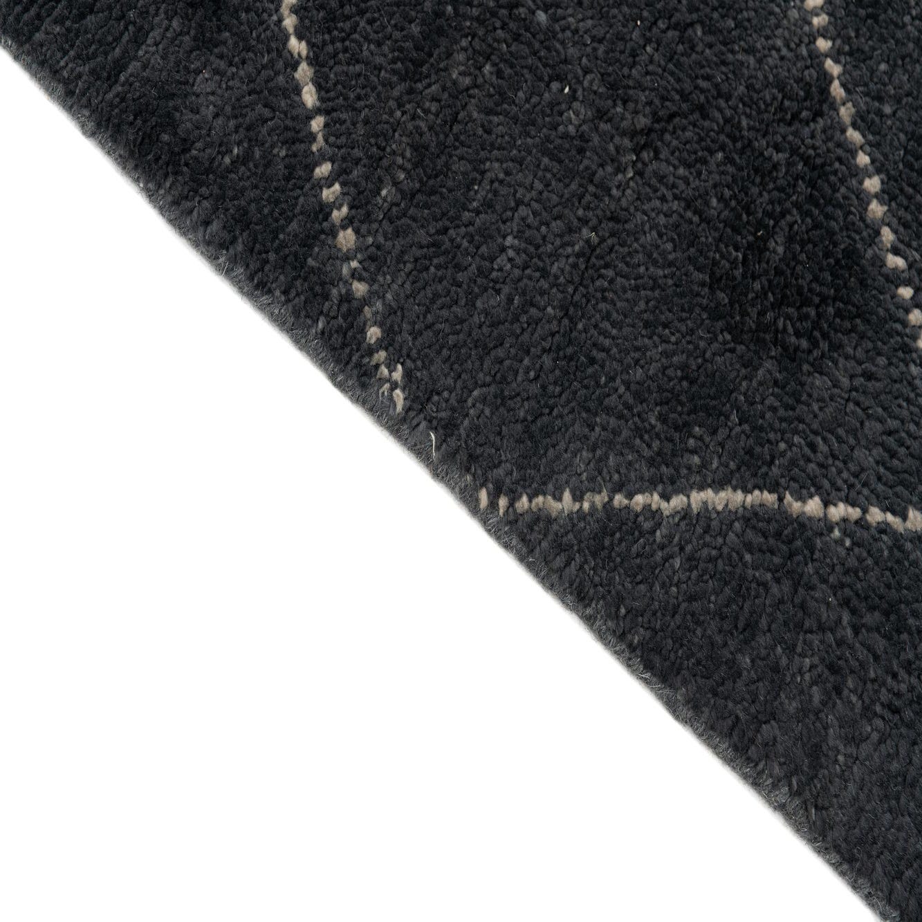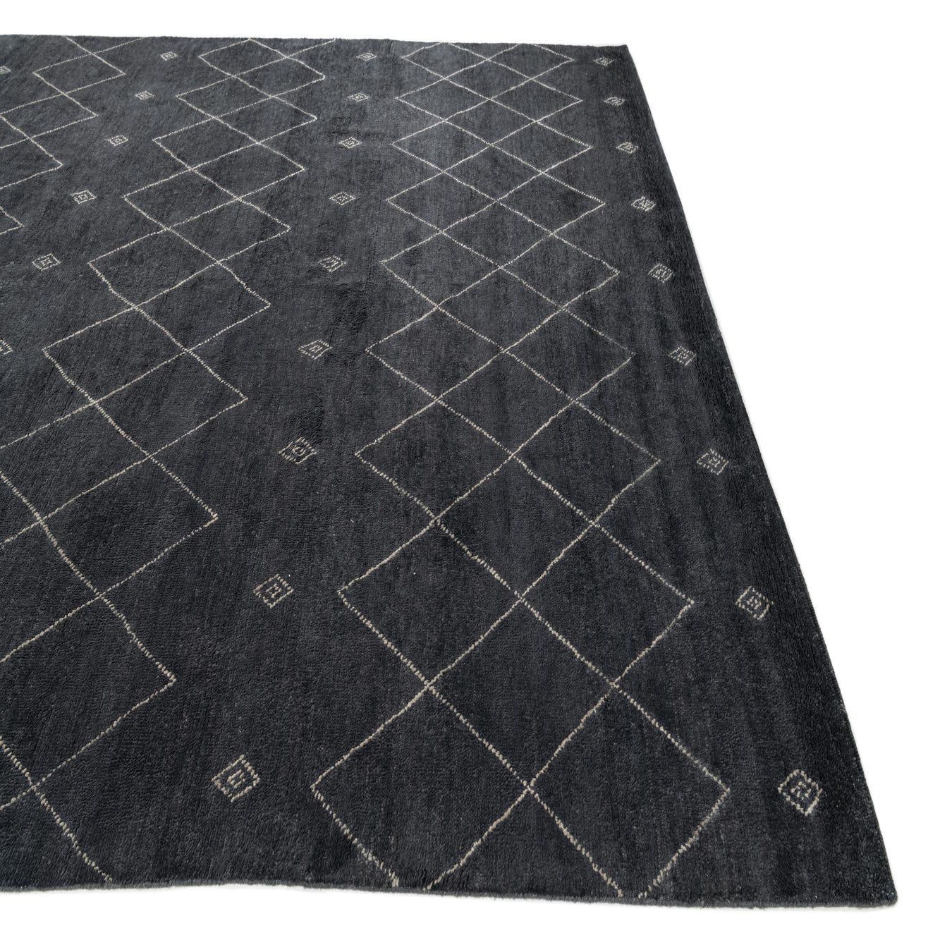 A 9x12 rectangular black wool rug with a modern diamond pattern in a lighter contrasting color.