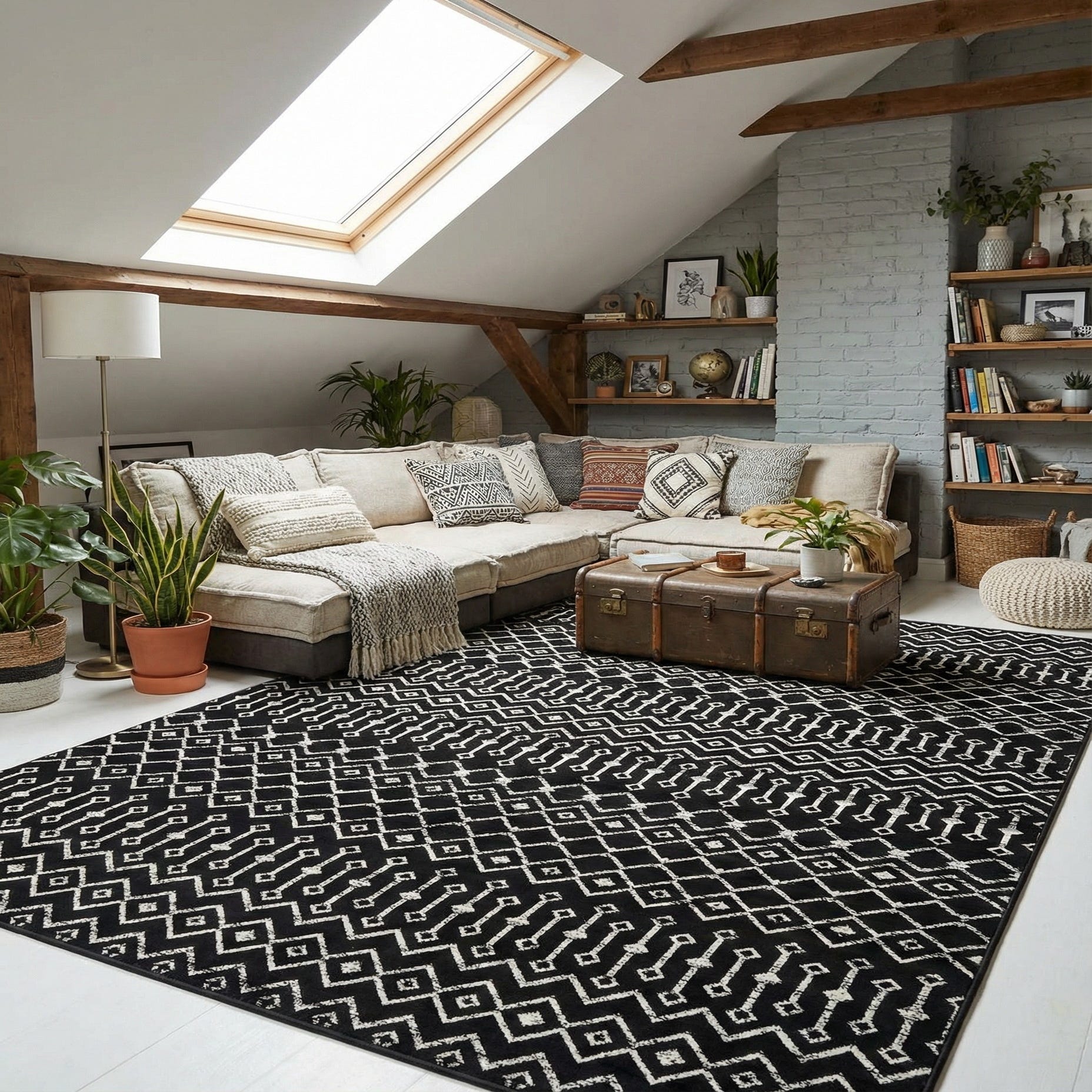 This rug works well in modern, minimalist, or industrial interiors where graphic black-and-white contrast adds definition. Place it to anchor a living room seating area, under a rectangular dining table, or layered at the foot of a bed to add structure without overpowering other finishes. Pair it with warm woods, matte metals, or natural linens for balance, or use it in a monochrome scheme to create a clean, graphic focal point.