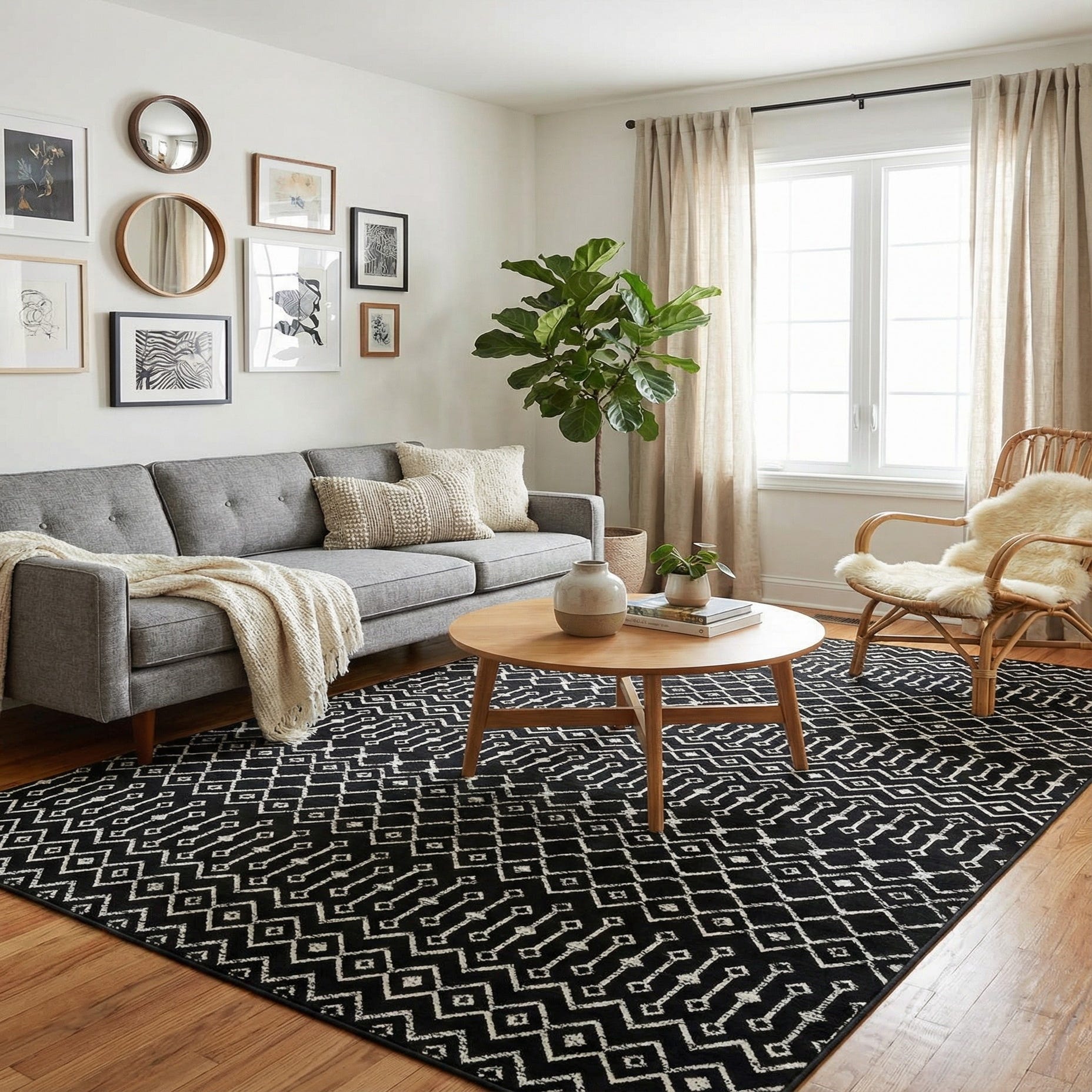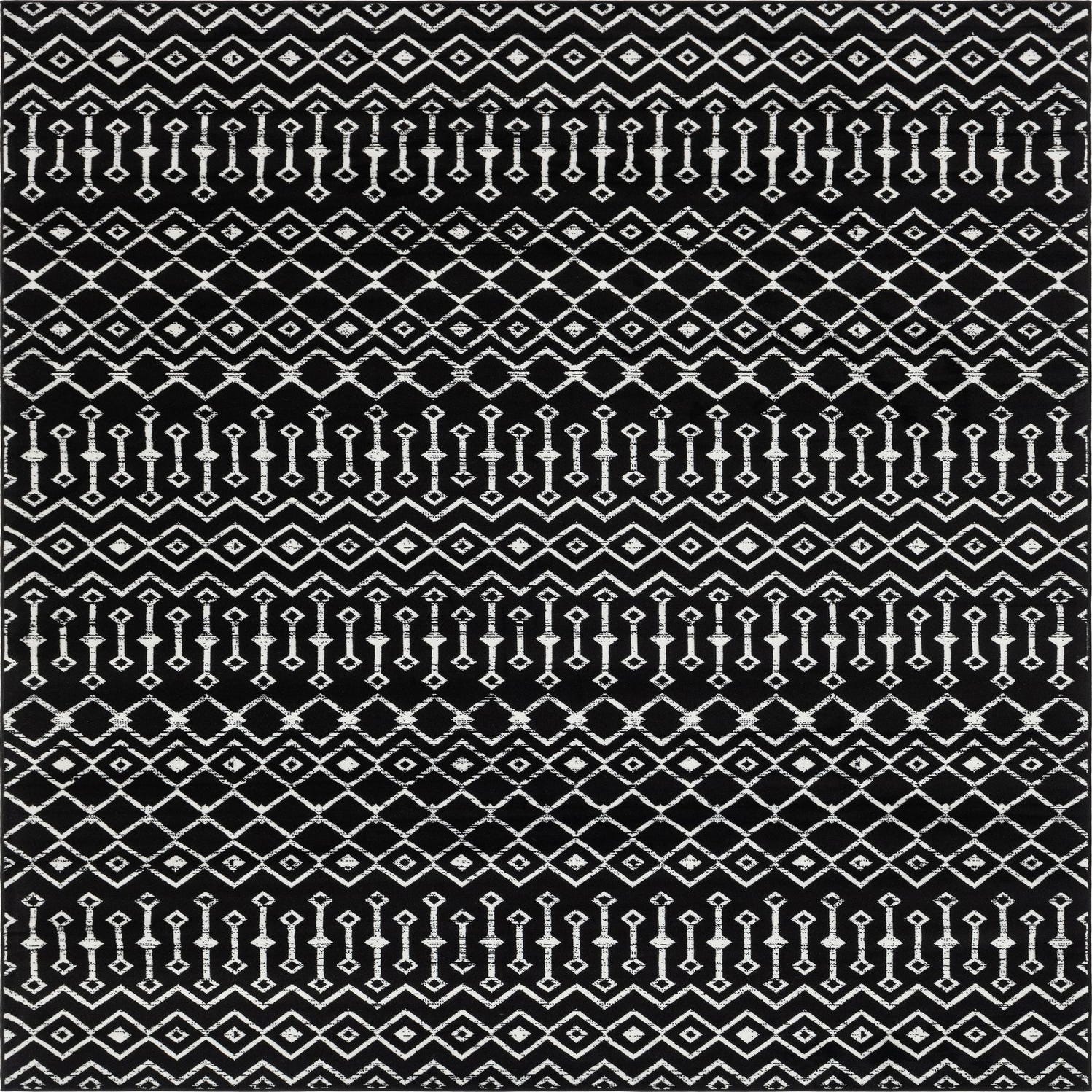 A 9x12 rectangular black area rug with a modern tribal trellis pattern in white, suitable for a living room.
