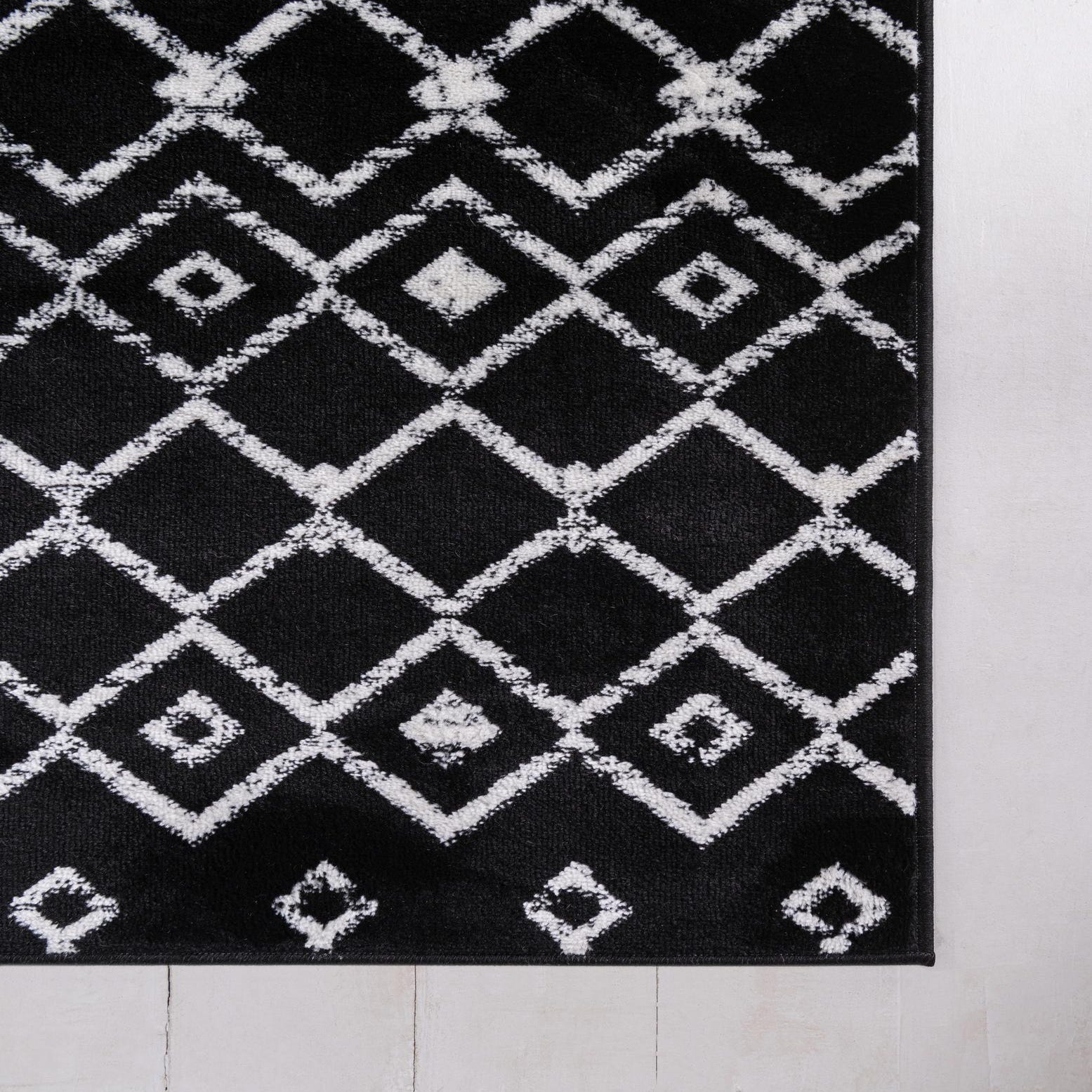 A bold black background provides a striking stage for an ivory trellis pattern rendered in alternating horizontal bands. Geometric diamonds and elongated, key-like motifs repeat across the field with a slightly distressed, hand-drawn look that gives the design subtle visual texture. Machine made from 100% polypropylene, the rug has a low-pile, slightly cushioned surface that feels smooth underfoot while maintaining crisp contrast between the black ground and ivory pattern.