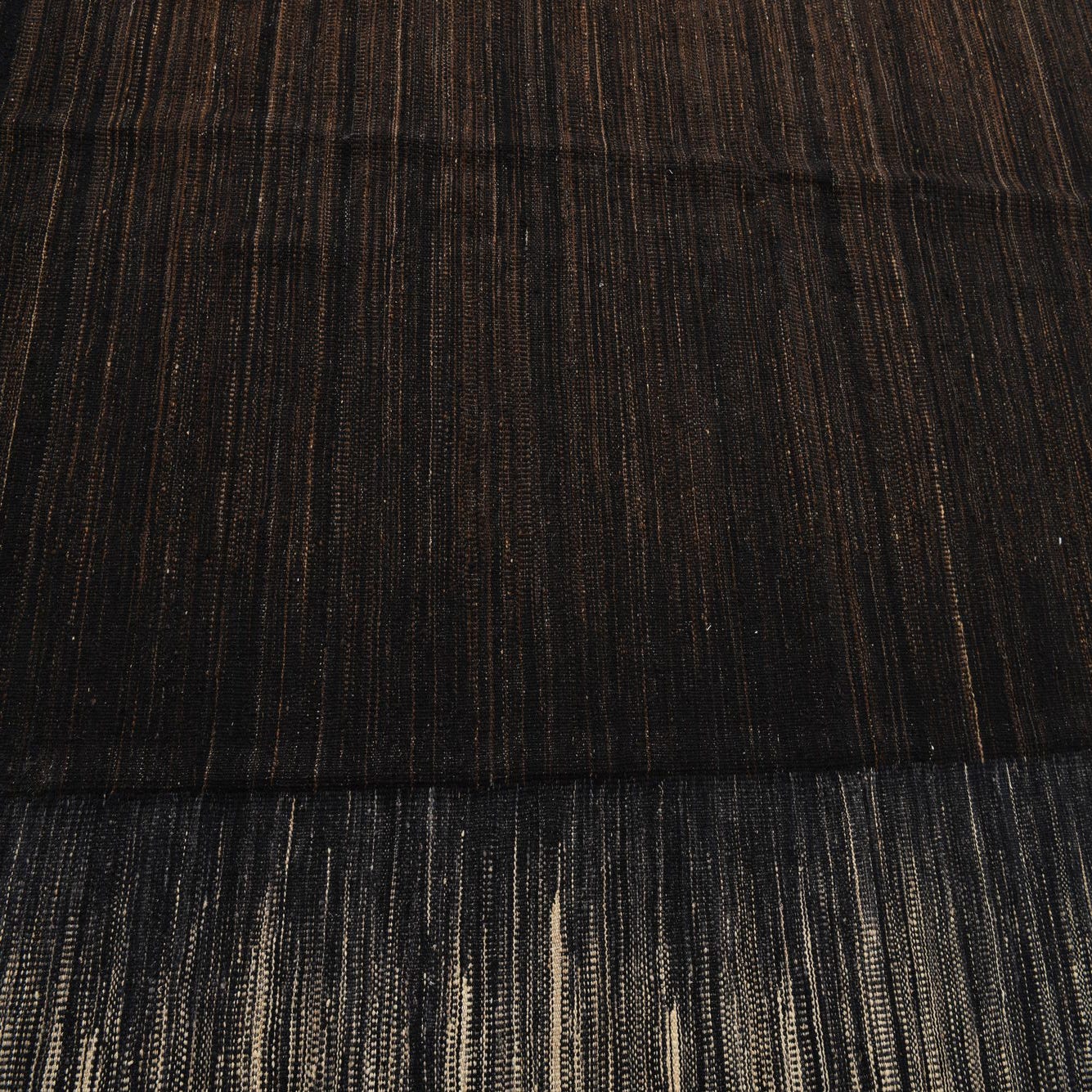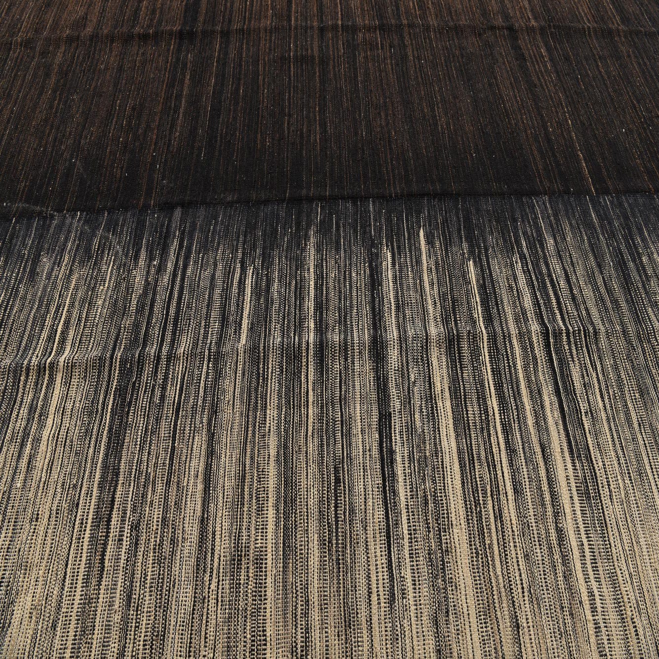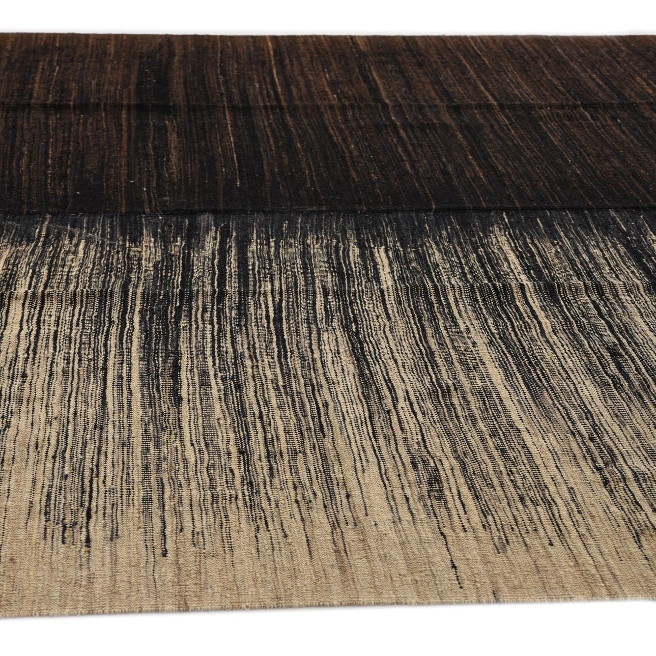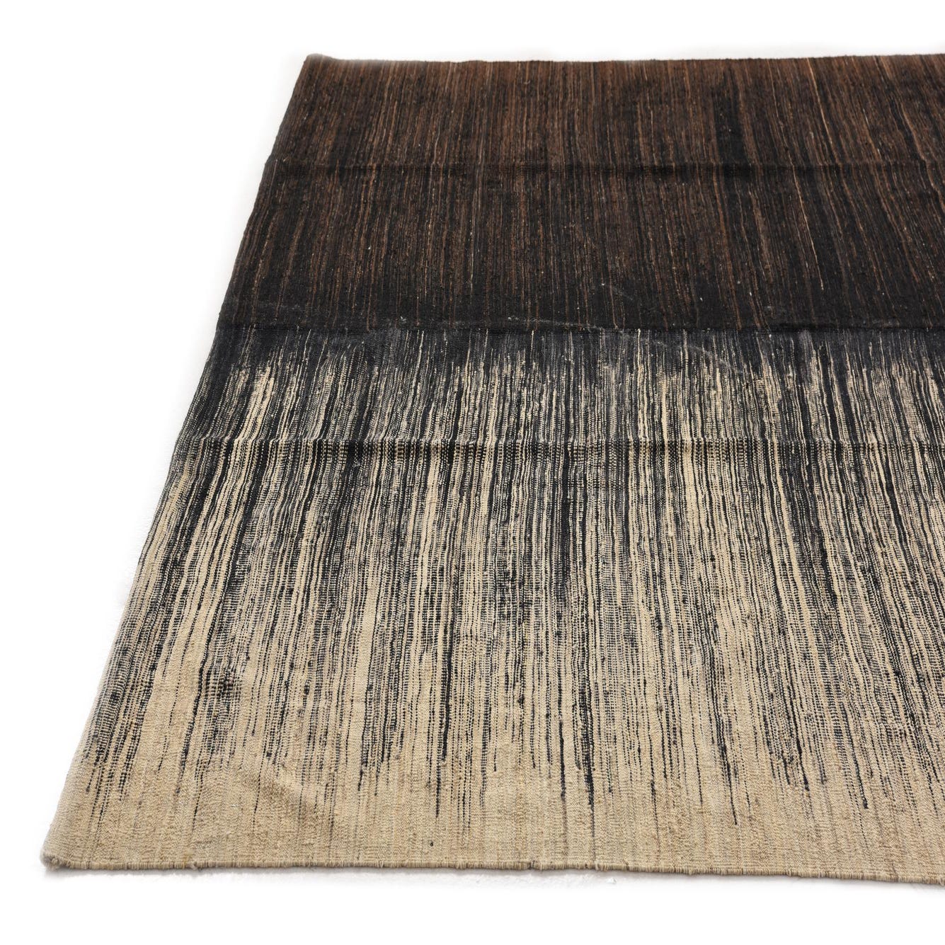 A 9x12 rectangular flatweave rug with a modern abstract design, transitioning from light beige to deep black.