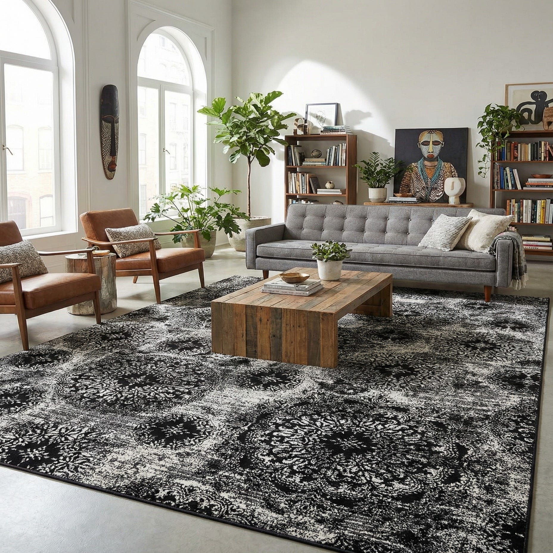 This rug works well as an anchor for a seating area or under a dining table, and pairs naturally with monochrome or high-contrast interiors. It complements clean-lined modern furniture, leather sofas and metal accents in an industrial loft, or can add a contemporary edge to a traditional living room. Lighter wood tones, brass or matte black finishes, and neutral textiles all harmonize with the black-and-ivory palette.