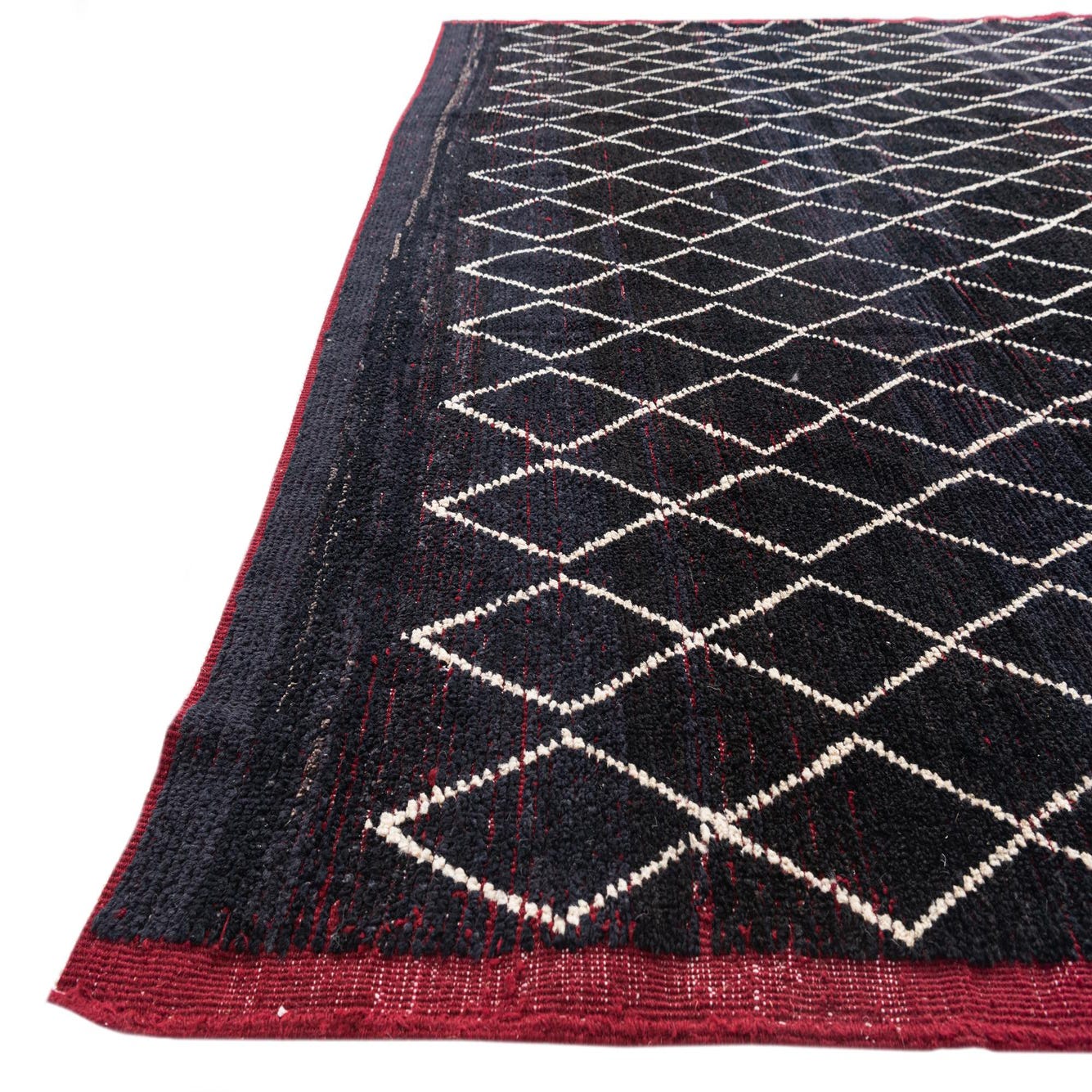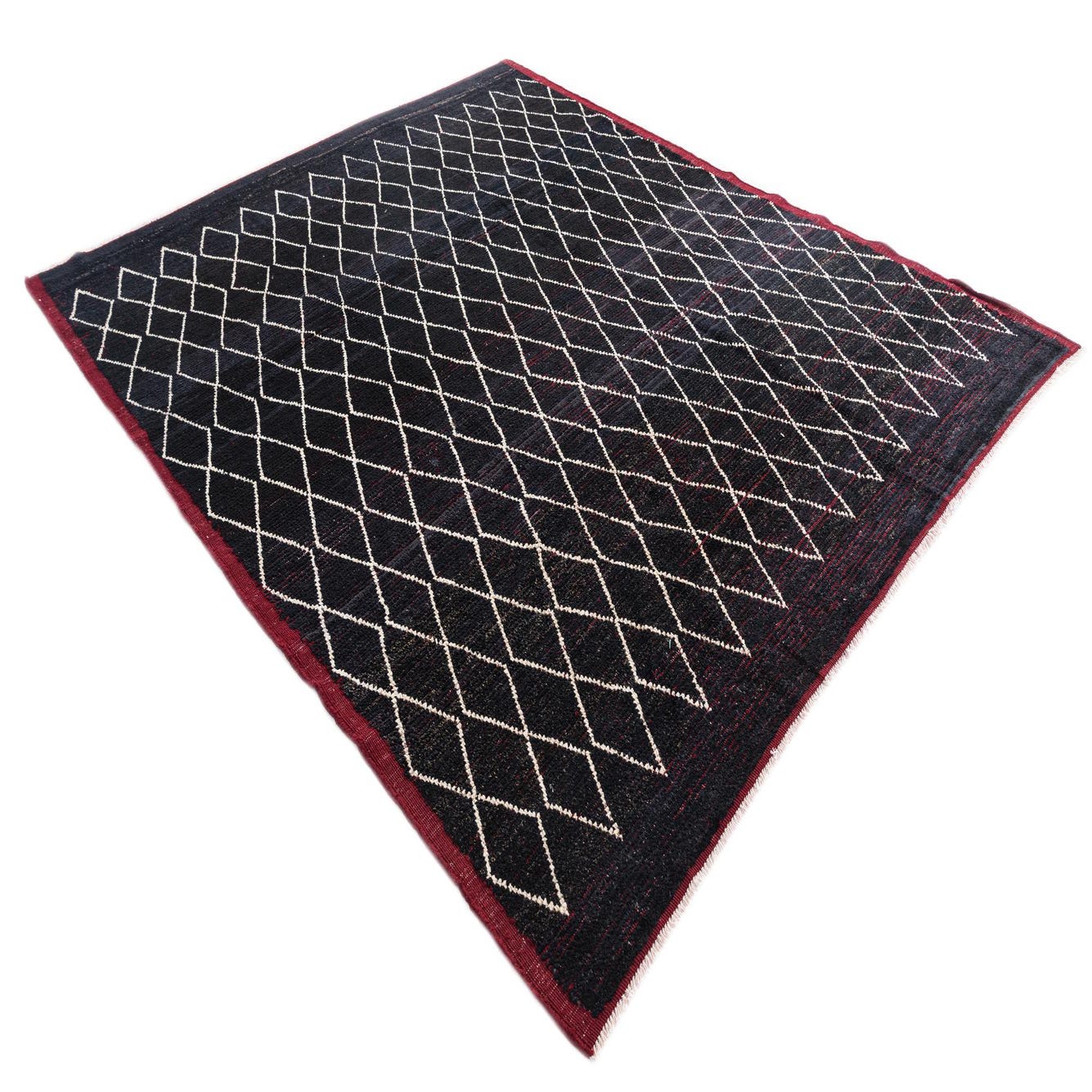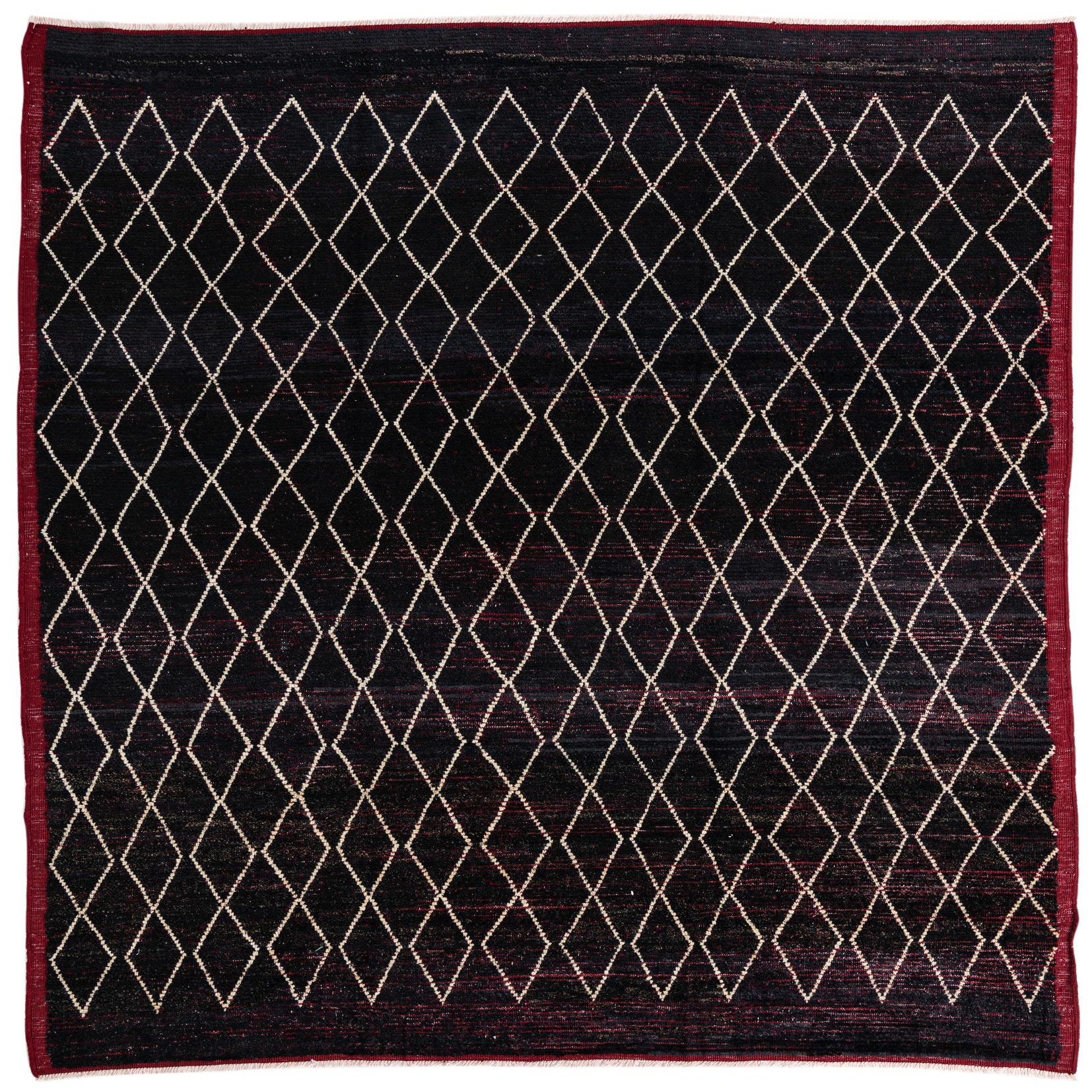A 9x12 rectangular black wool shag rug with a repeating white diamond tribal pattern and a deep red border.