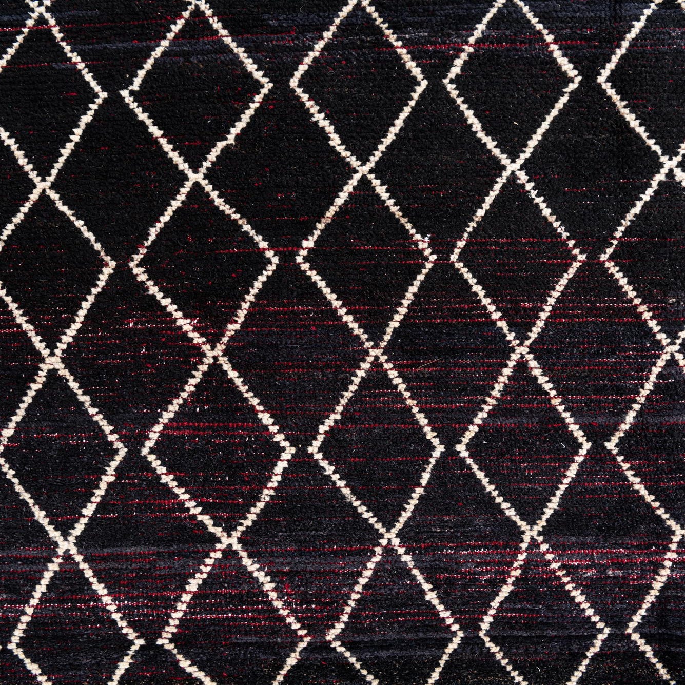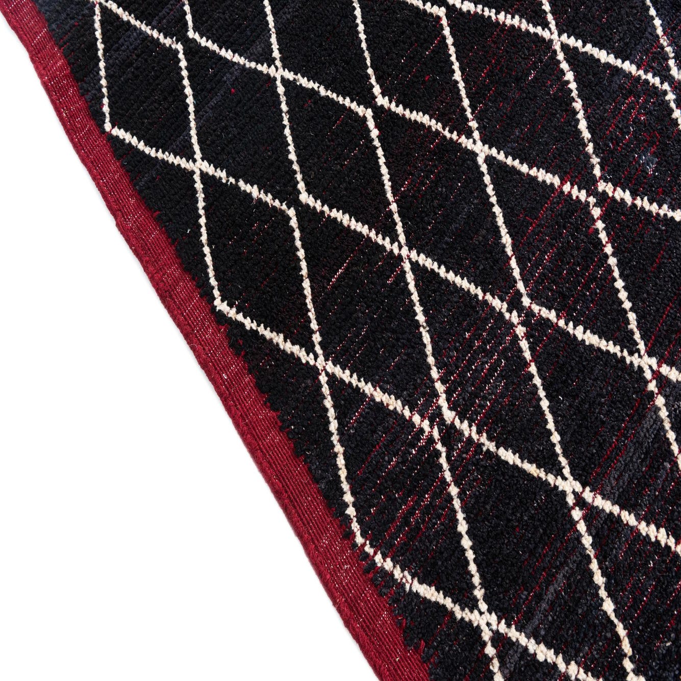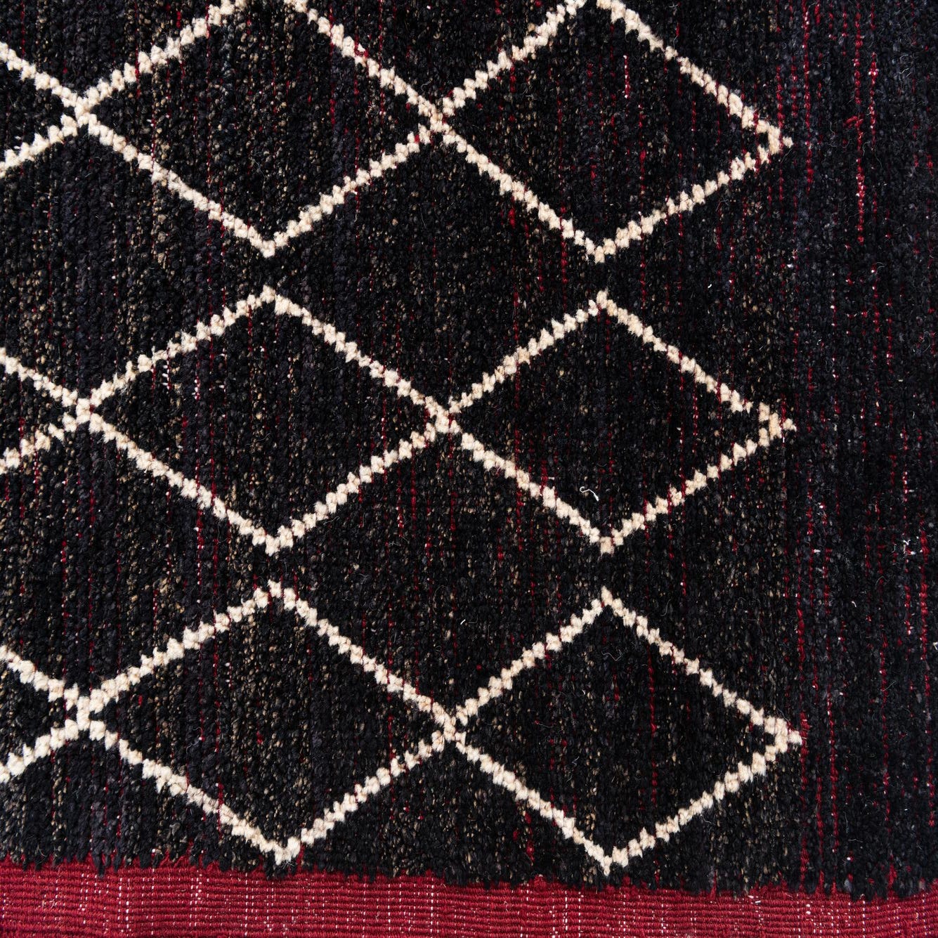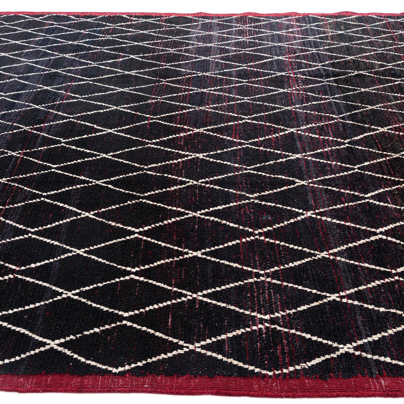 A 9x12 rectangular black wool shag rug with a repeating white diamond tribal pattern and a deep red border.