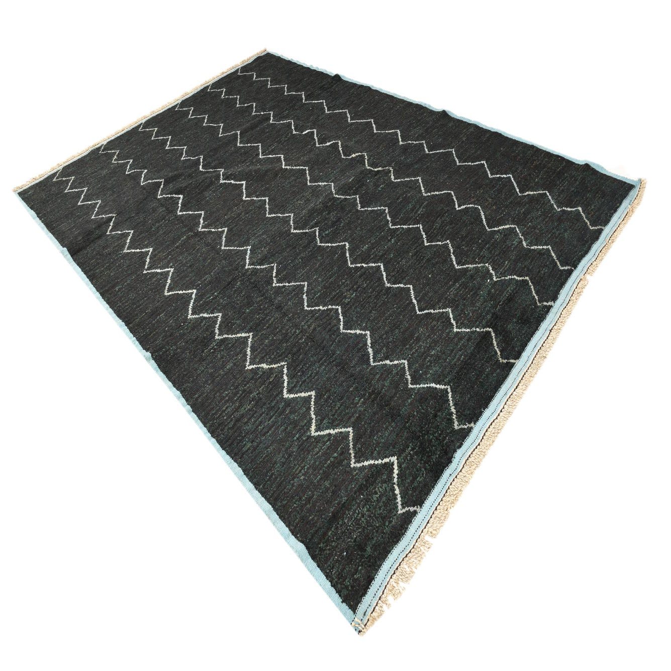 This hand-knotted Moroccan collection rug measures 9x12 and is crafted from 100% wool, offering a plush feel underfoot. Its background is predominantly black, providing a bold backdrop to the geometric pattern that characterizes the piece. The design features a series of repeating, interconnected light blue and ivory diamond motifs, creating a visually striking zigzag pattern that runs the length of the rug. Hints of green subtly outline the border, enhancing the overall design.
