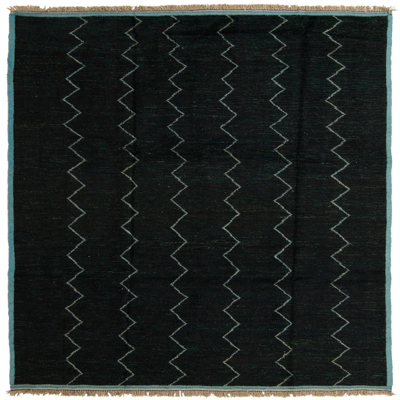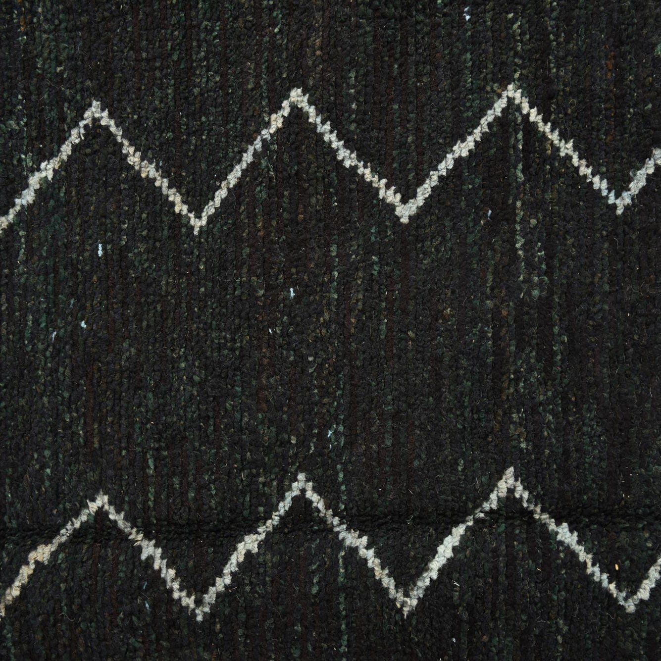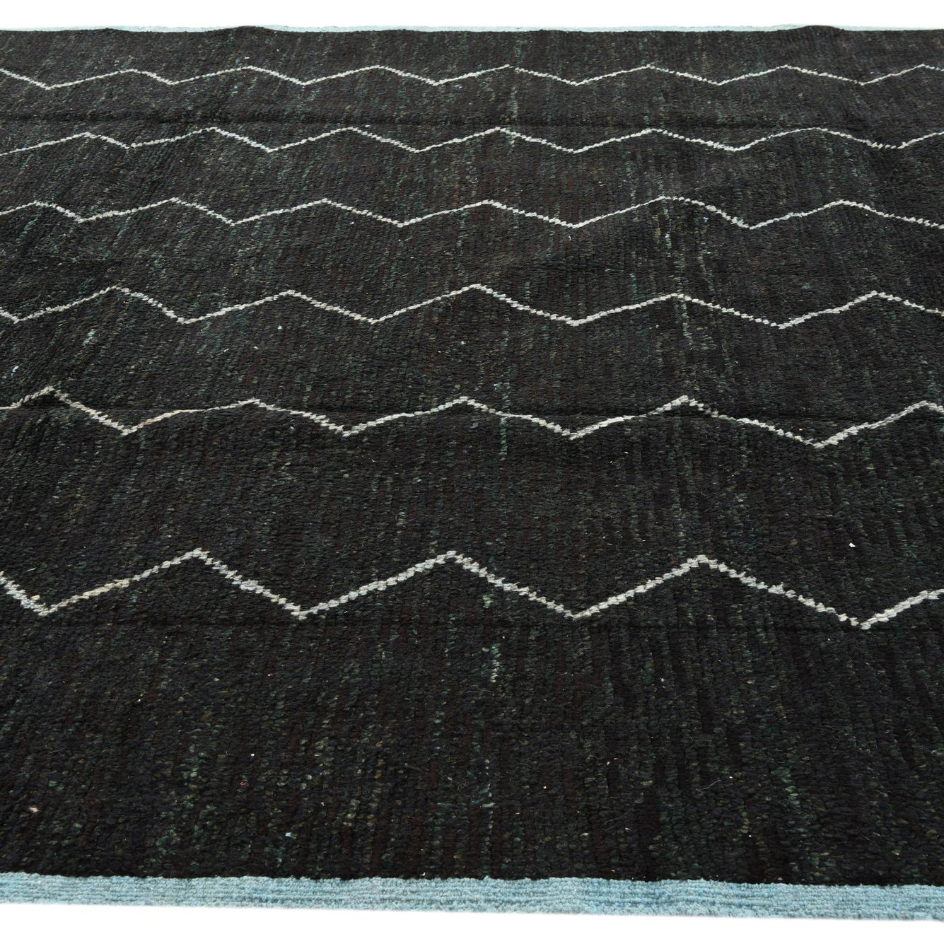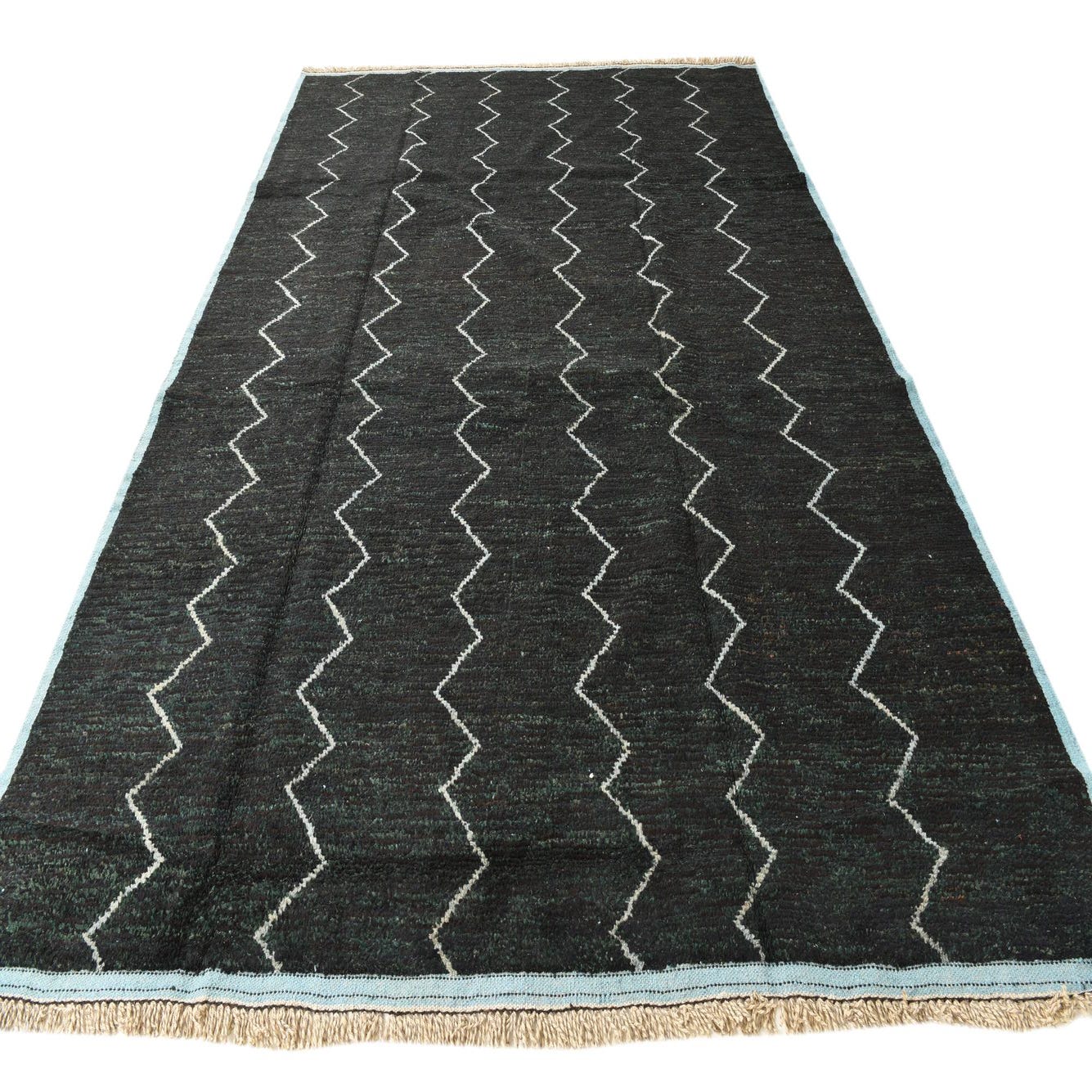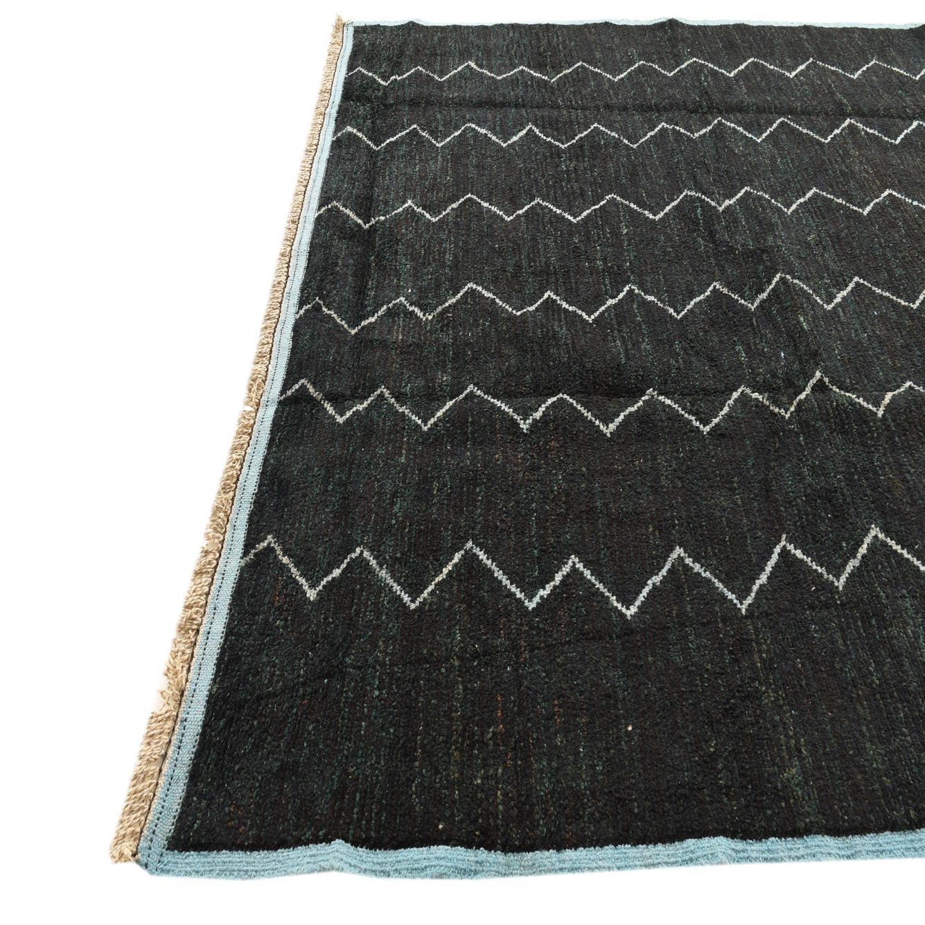 A 9x12 rectangular black Moroccan shag rug with vertical white zigzag lines and light blue border.