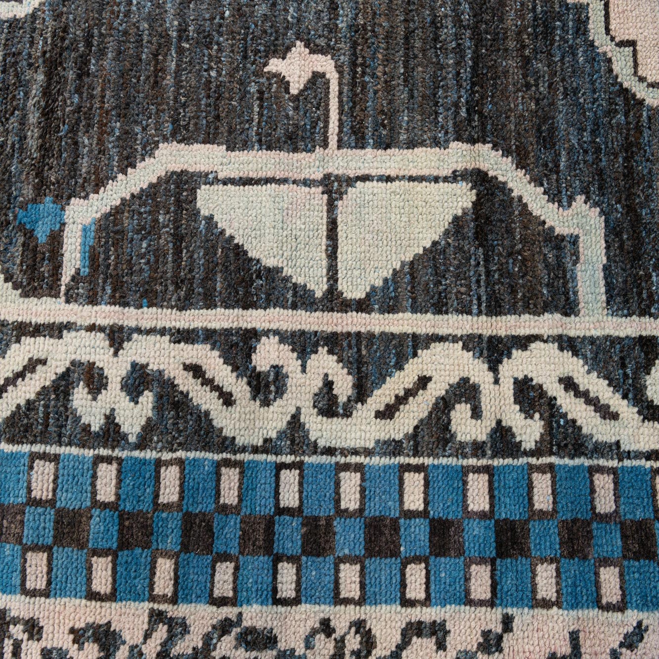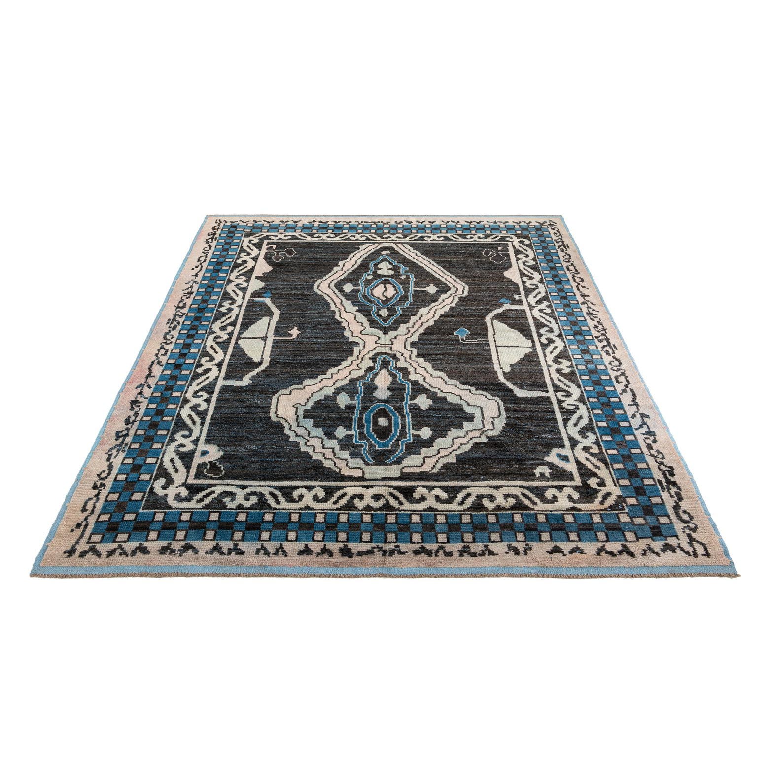 Primary color is Black. Colors in this rug include: Black, Blue, Light Blue, Ivory.
