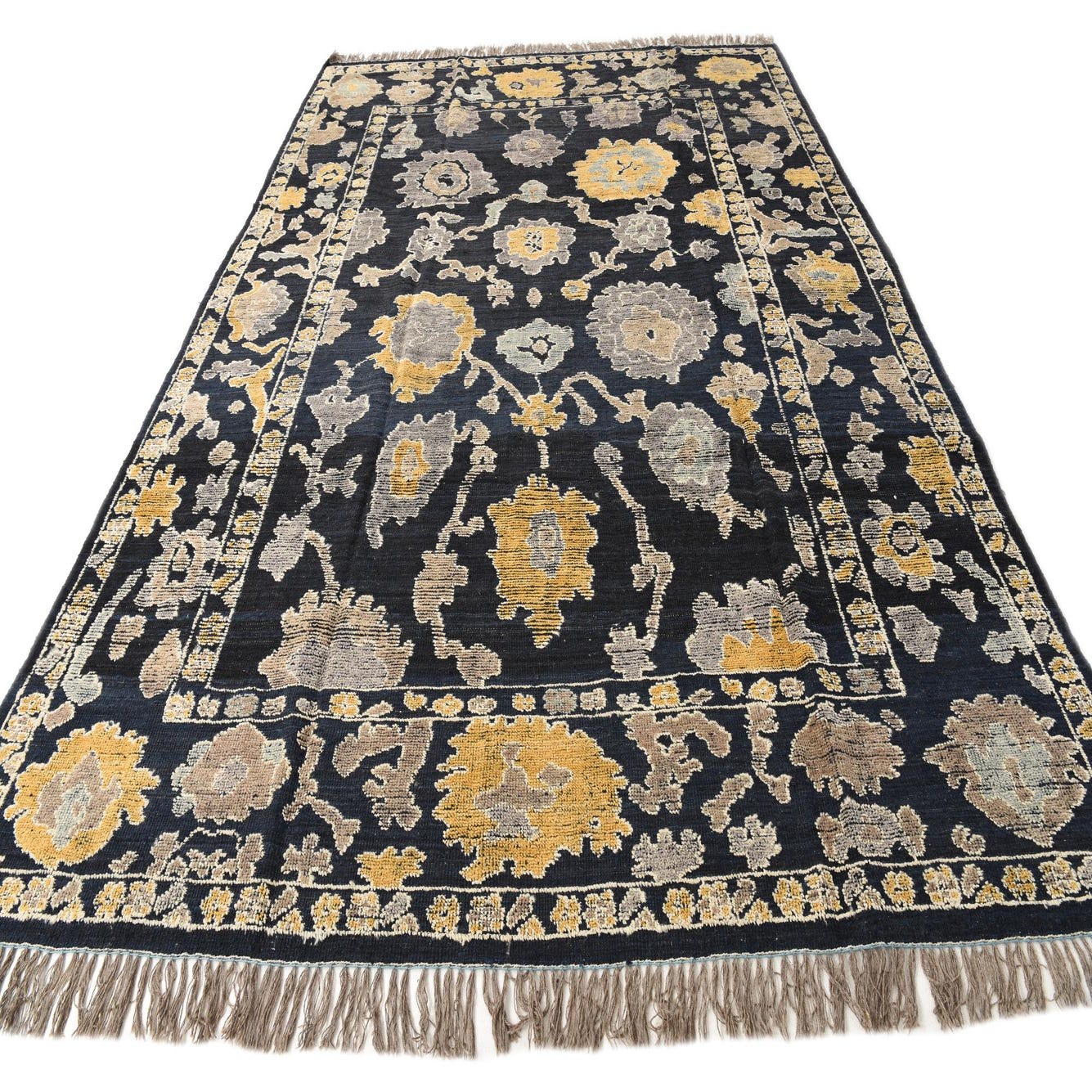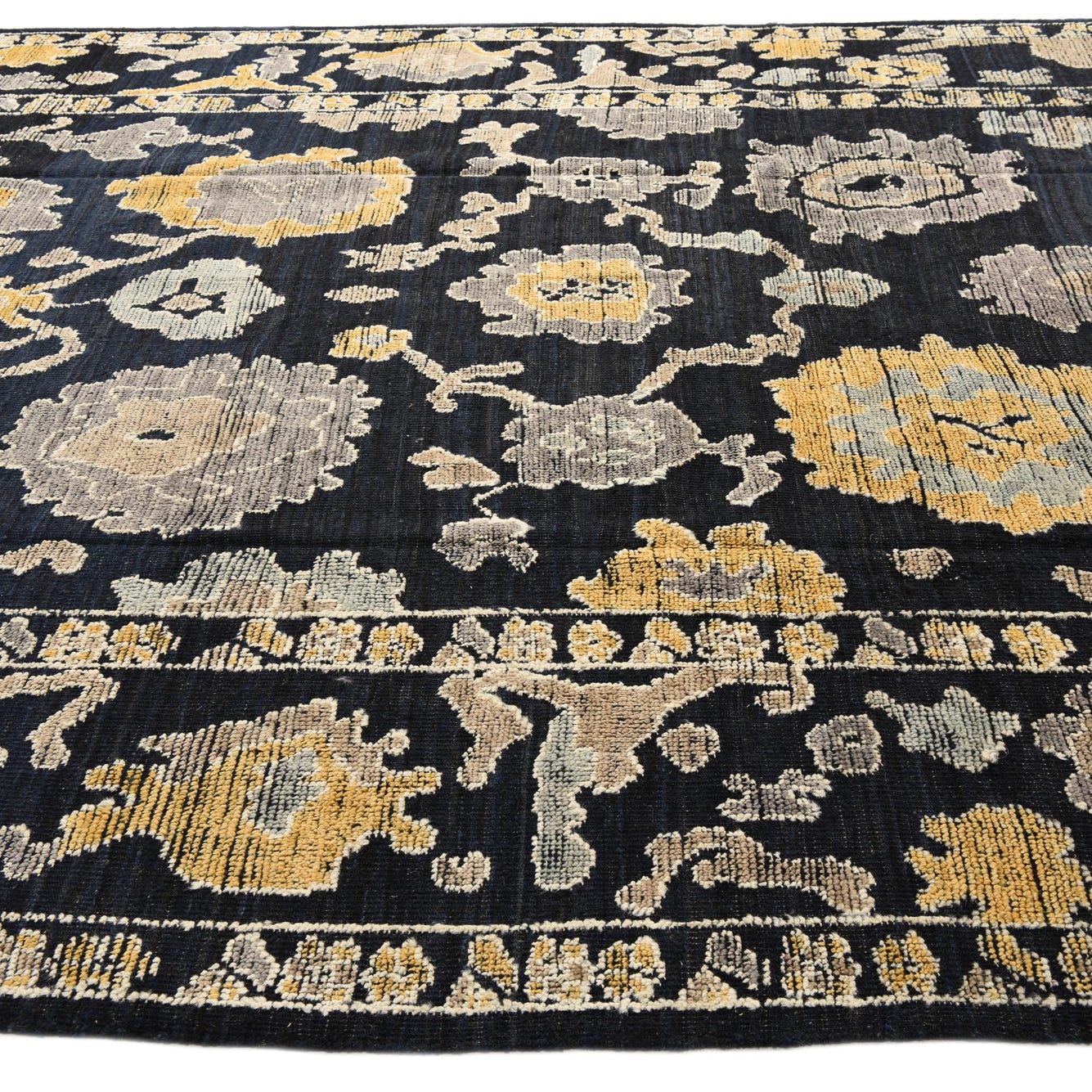 A 9x12 rectangular Oushak rug in black, featuring a modern abstract floral pattern in gold, grey, and light blue tones, with fringed ends.