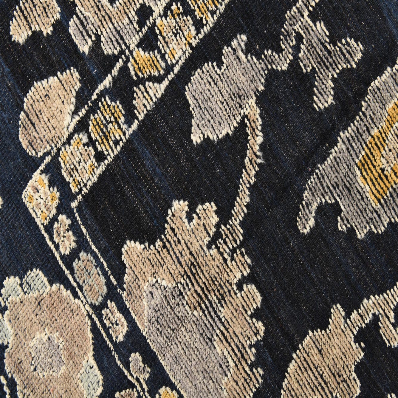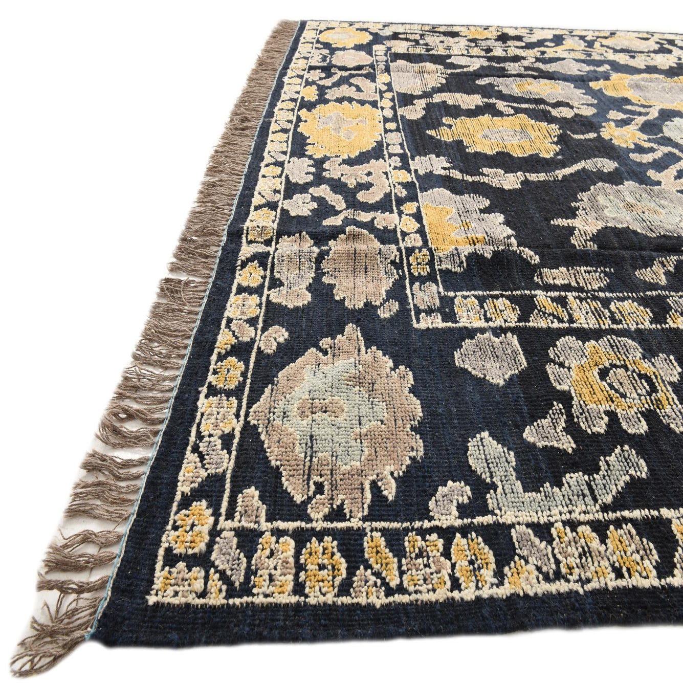 Primary color is Black. Colors in this rug include: Black, Gray, Ivory, Light Brown, Light Green, Navy Blue, Yellow.