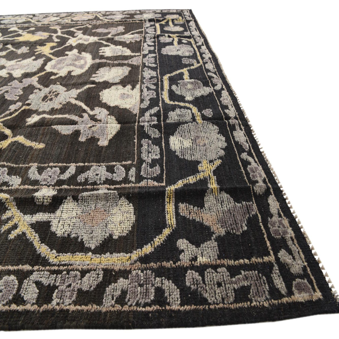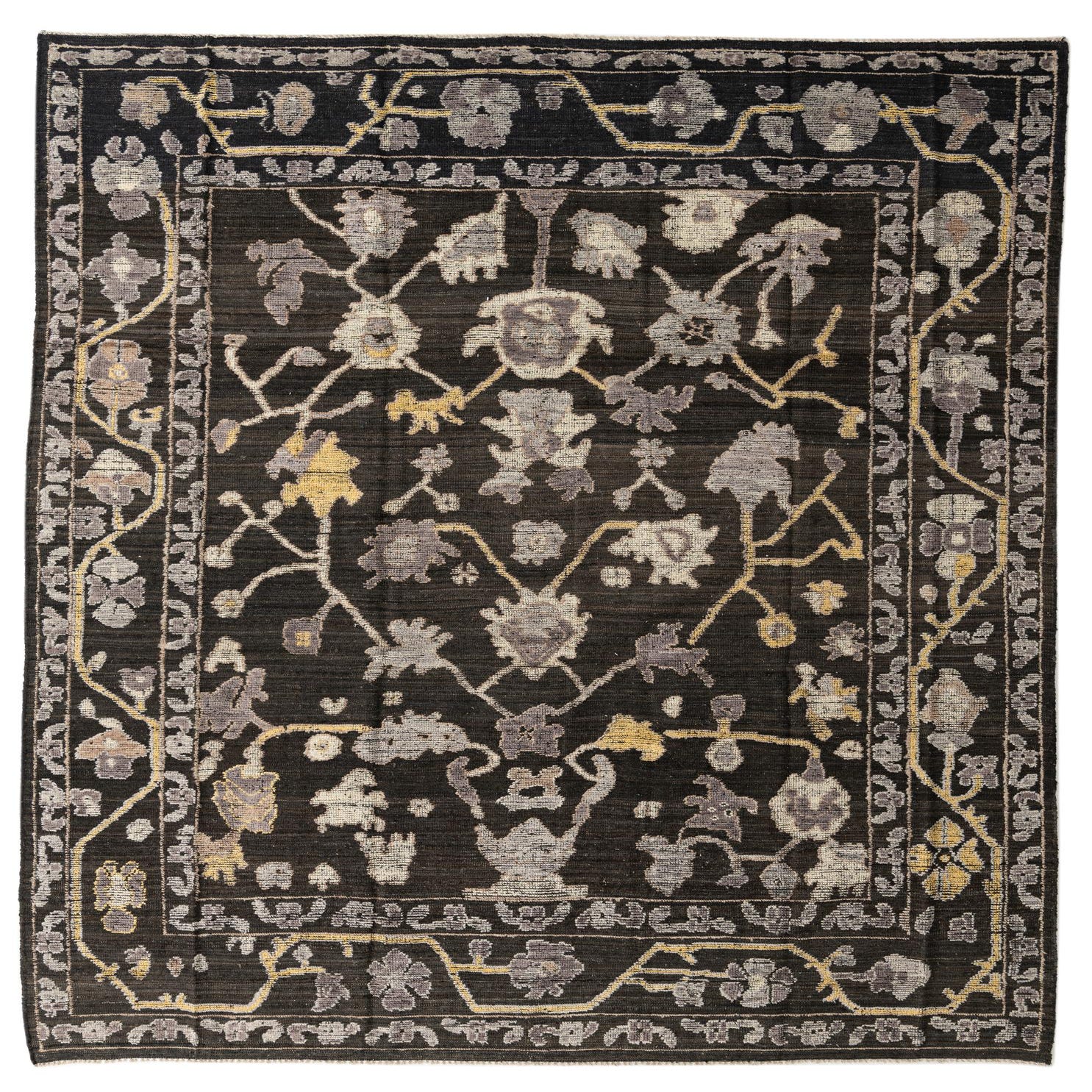 A 9x12 rectangular black Oushak rug with a modern floral pattern in grey, beige, and yellow.