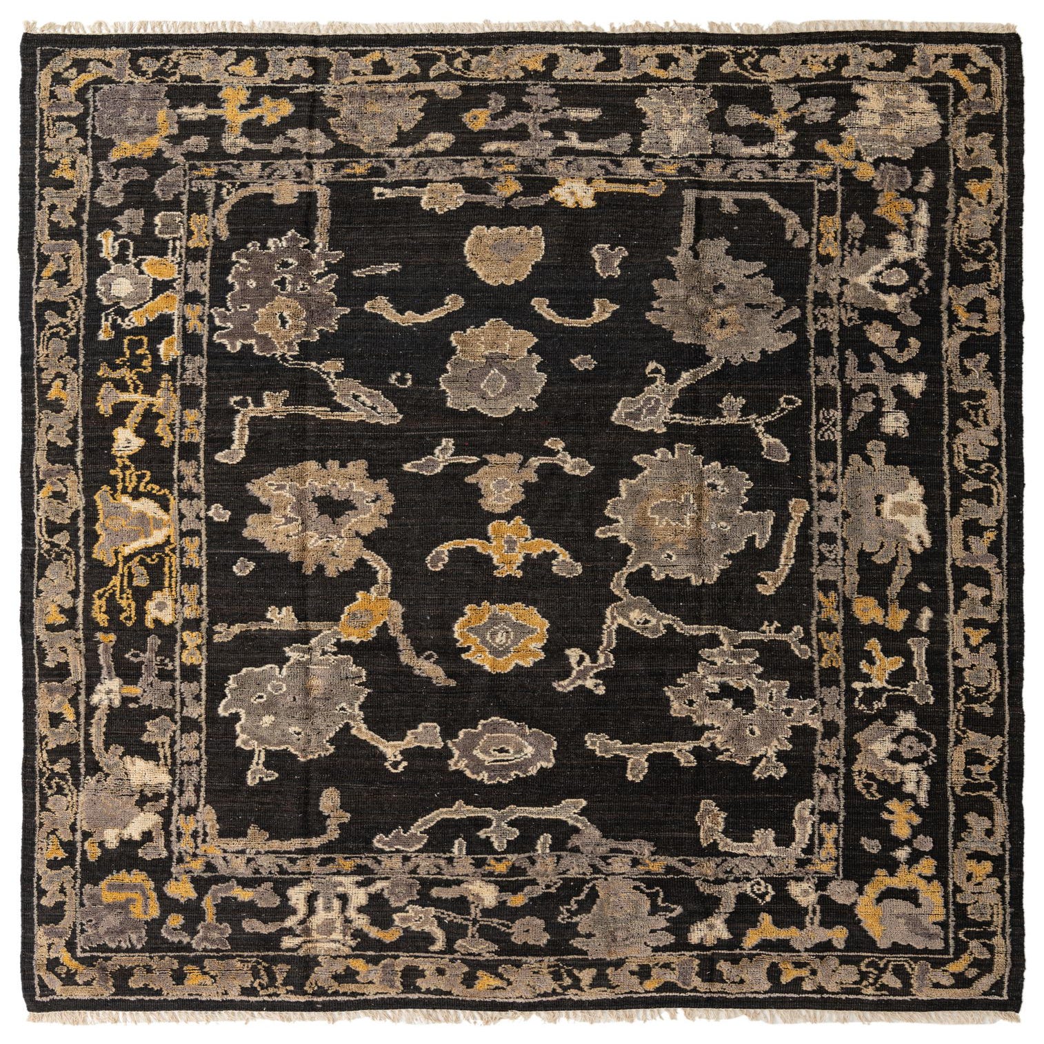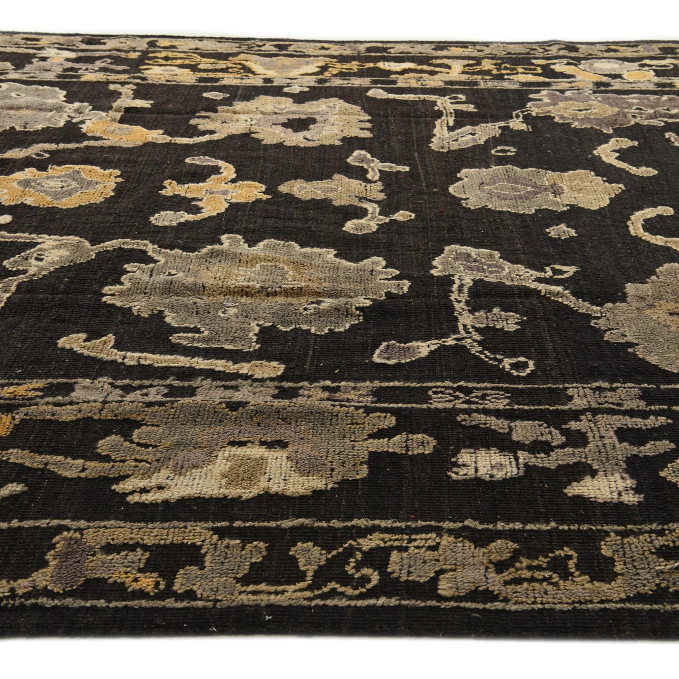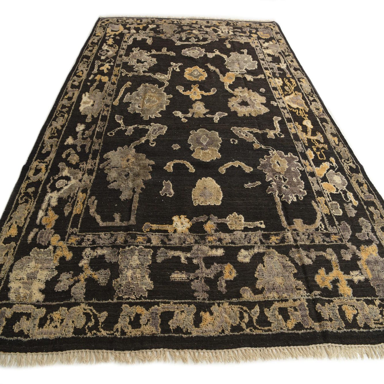 A 9x12 rectangular black wool rug with a modern Oushak pattern in grey and gold tones, featuring a decorative border and fringe.