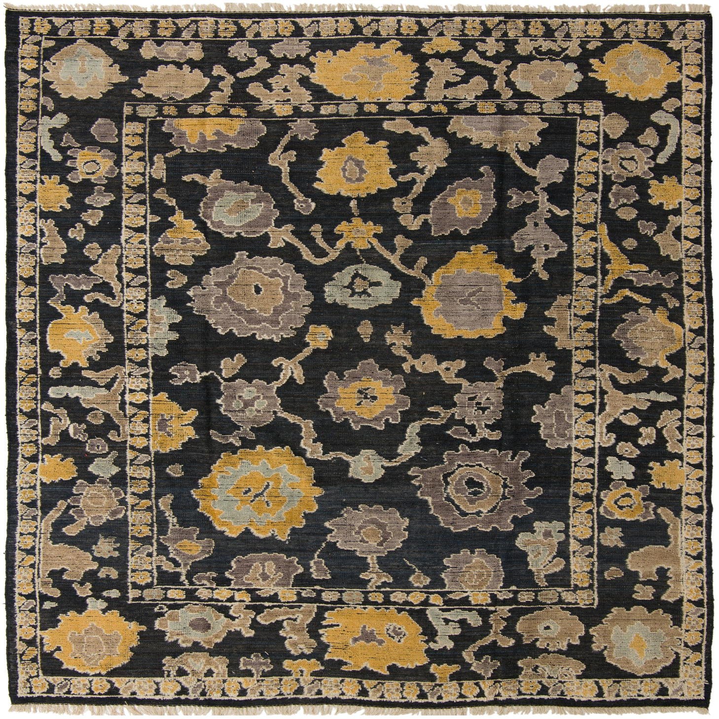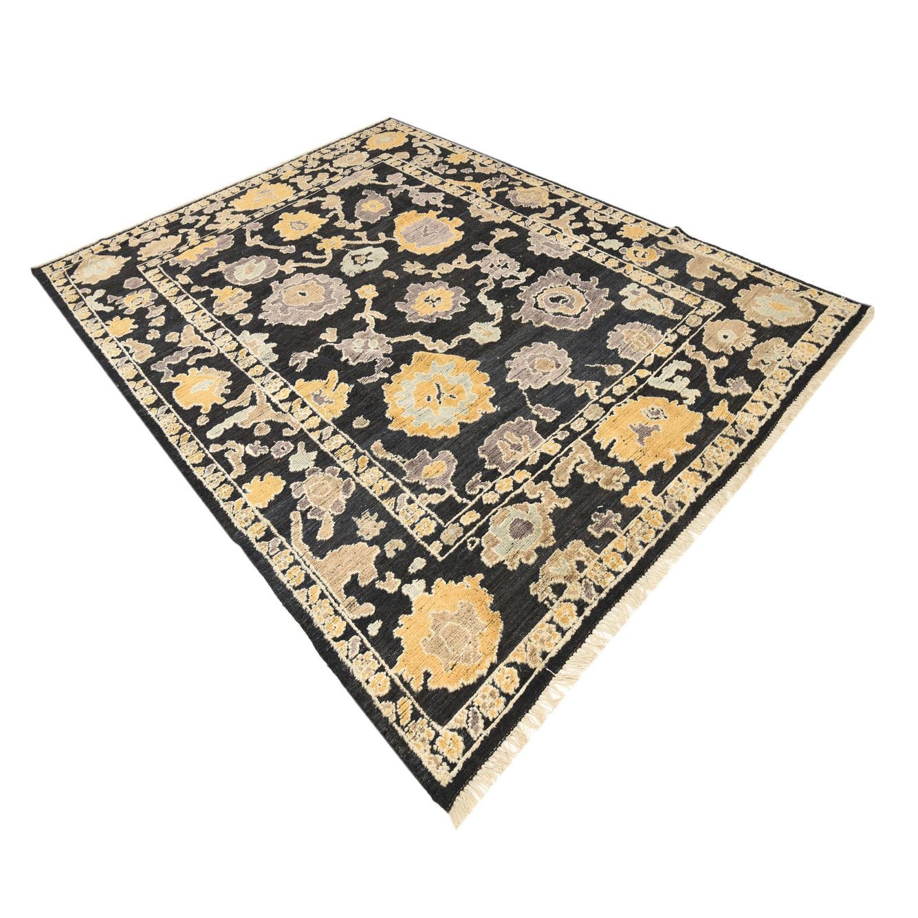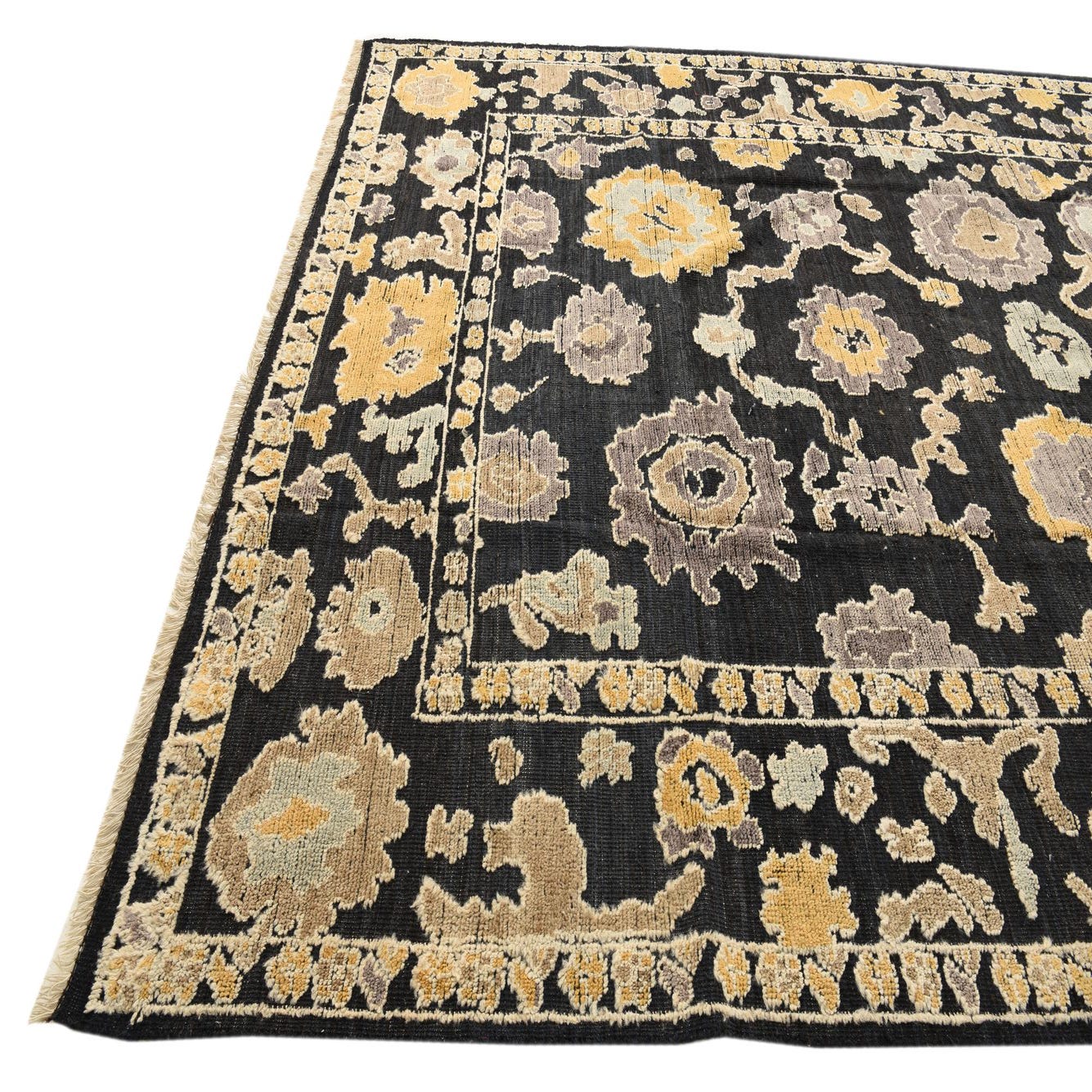 A 9x12 rectangular Oushak wool rug featuring a modern abstract floral pattern in shades of black, gold, and grey.