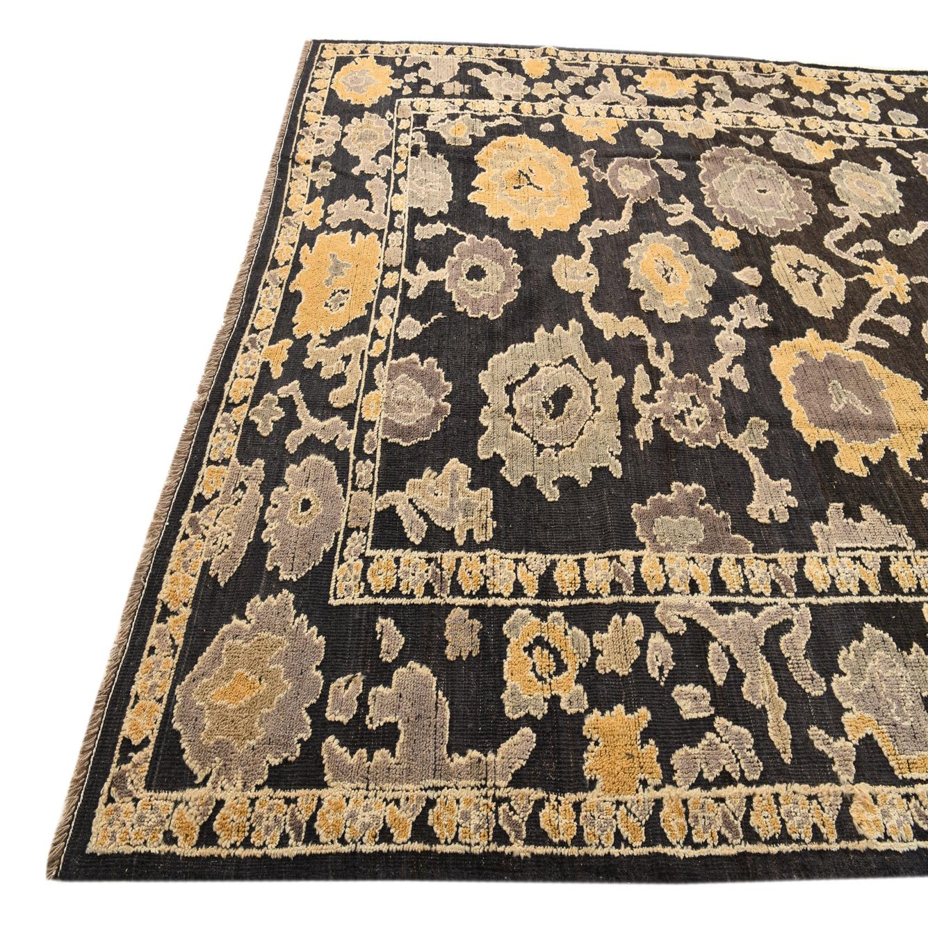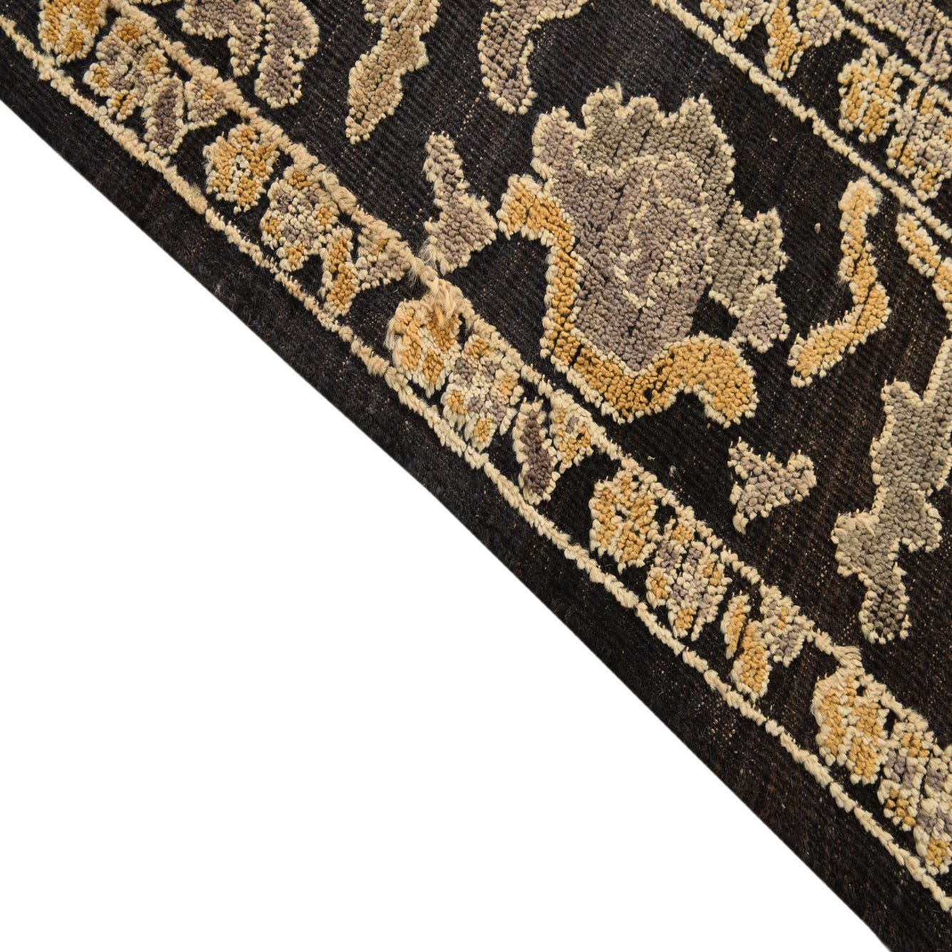 Primary color is Black. Colors in this rug include: Black, Gray, Ivory, Light Brown, Yellow.