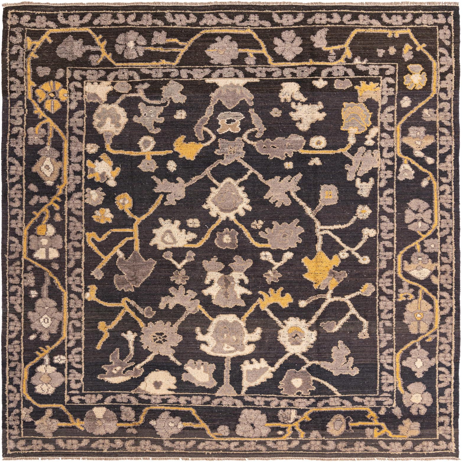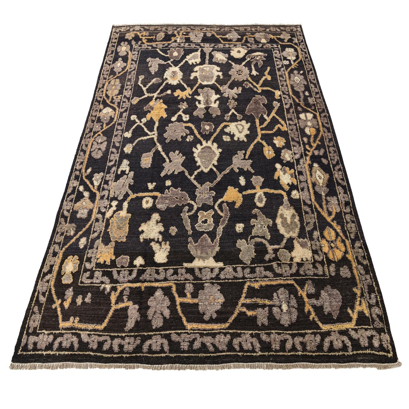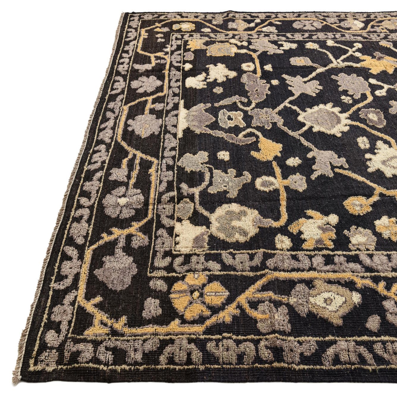 A 9x12 rectangular black modern Oushak wool rug with abstract floral patterns in gray, cream, and yellow.