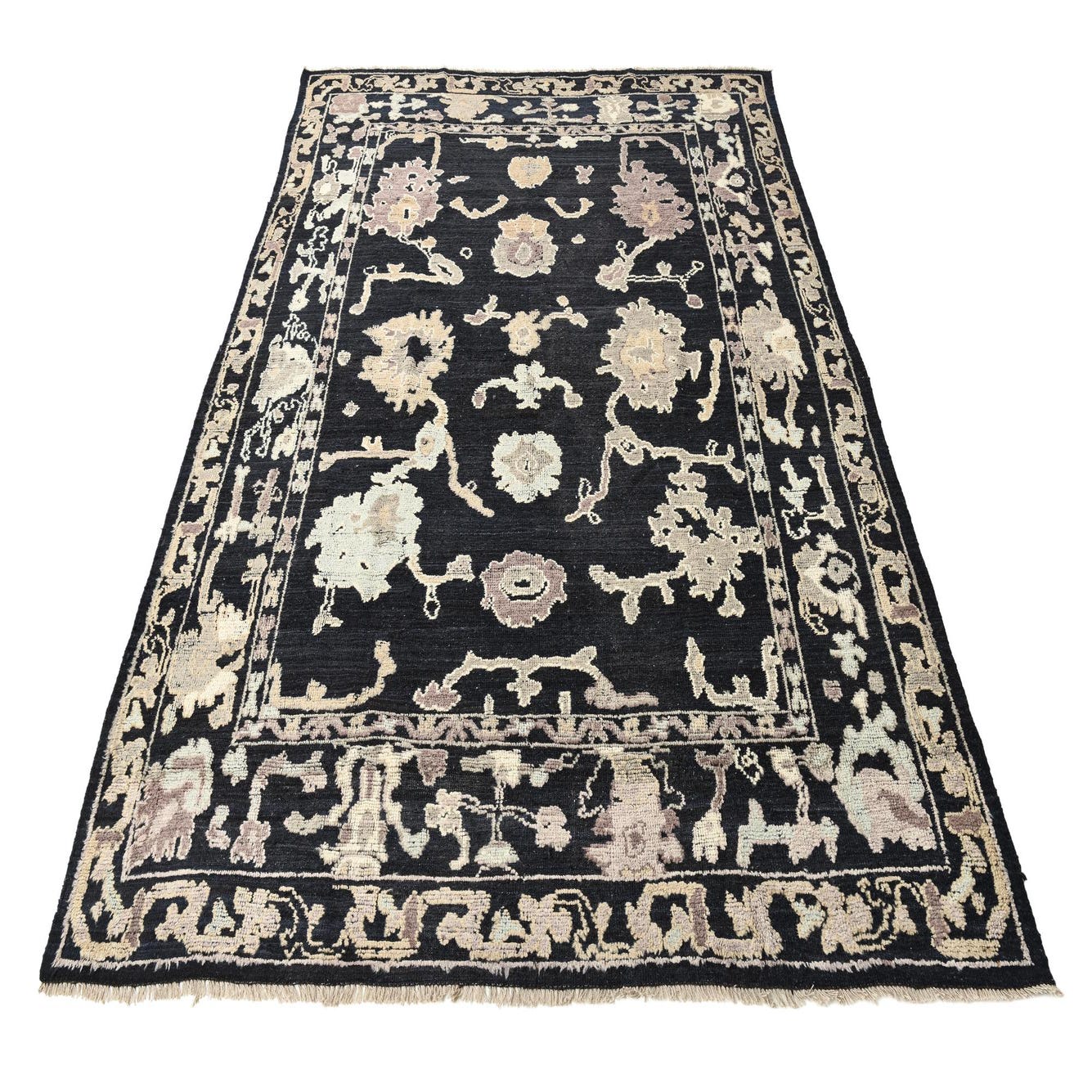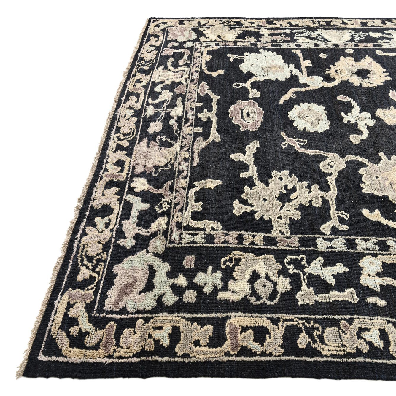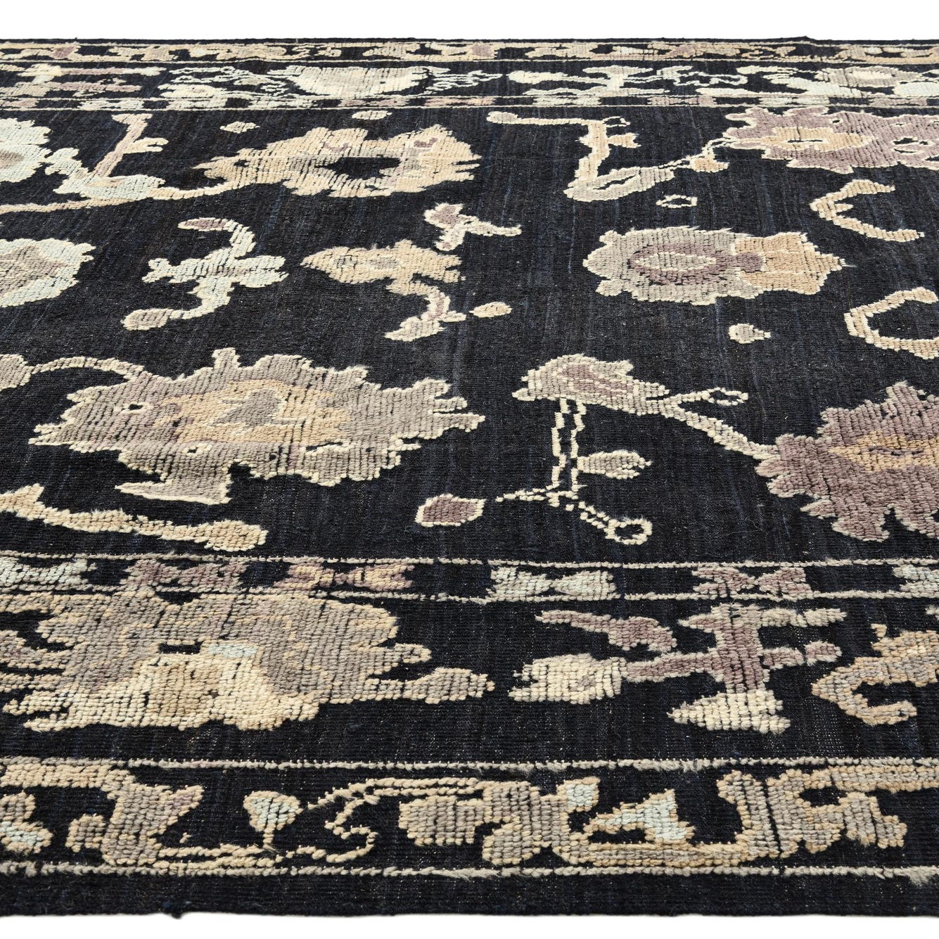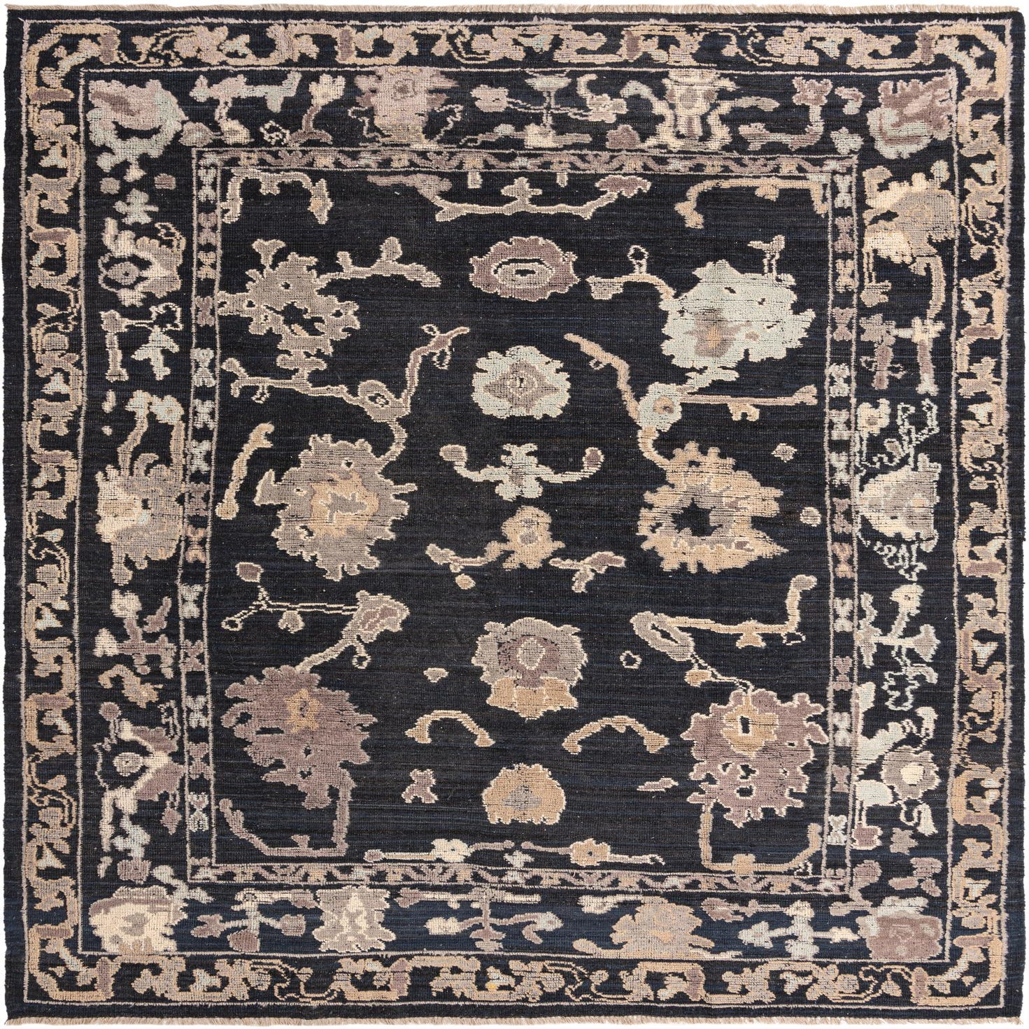 A 9x12 rectangular black Oushak wool rug with an intricate floral and botanical border in beige and brown tones.