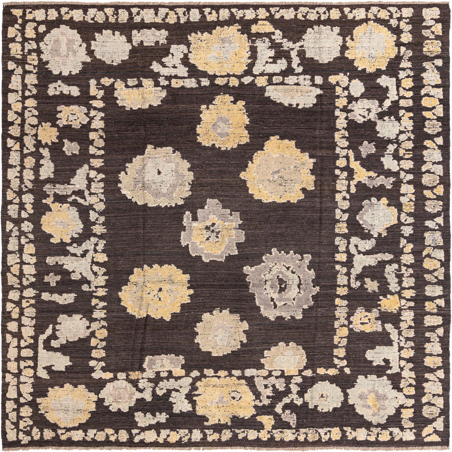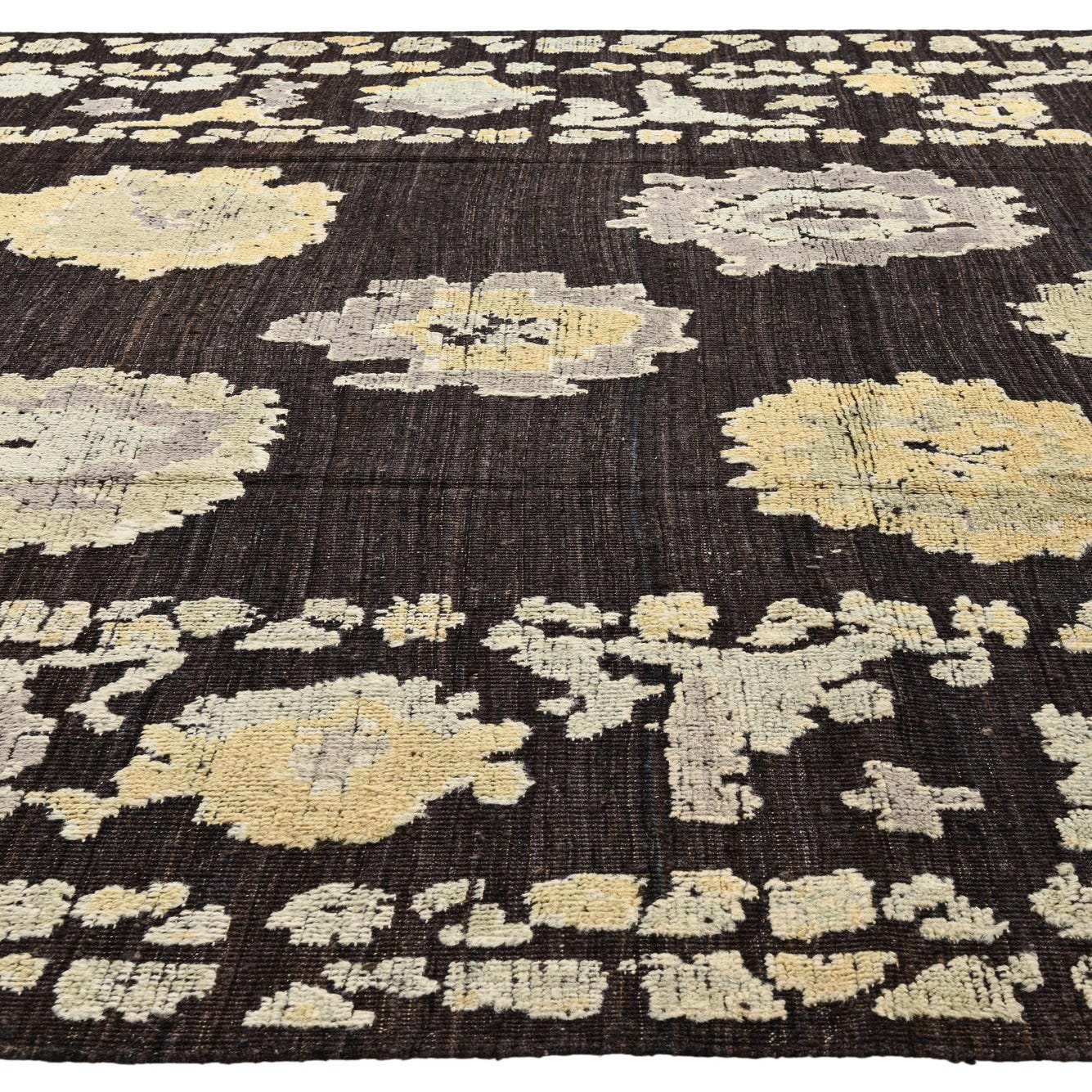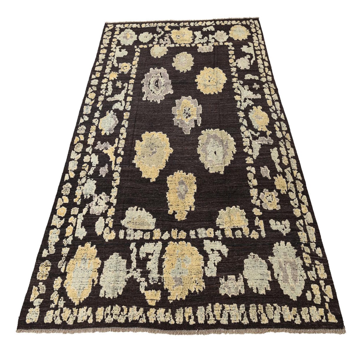 A 9x12 rectangular Oushak rug with a black background and modern floral patterns in light yellow and grey.