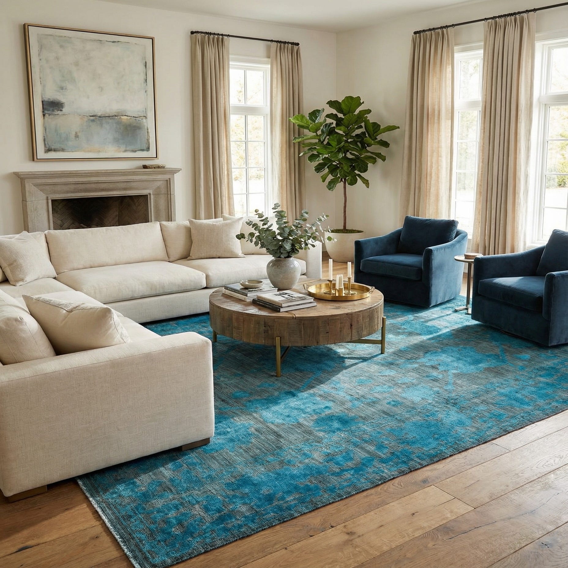 A 9x12 rectangular Oushak rug in black with a modern floral pattern in bright teal blue, suitable for a living room.
