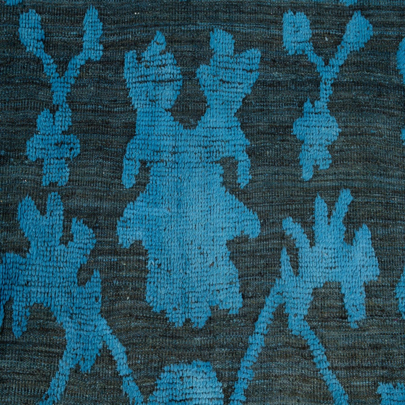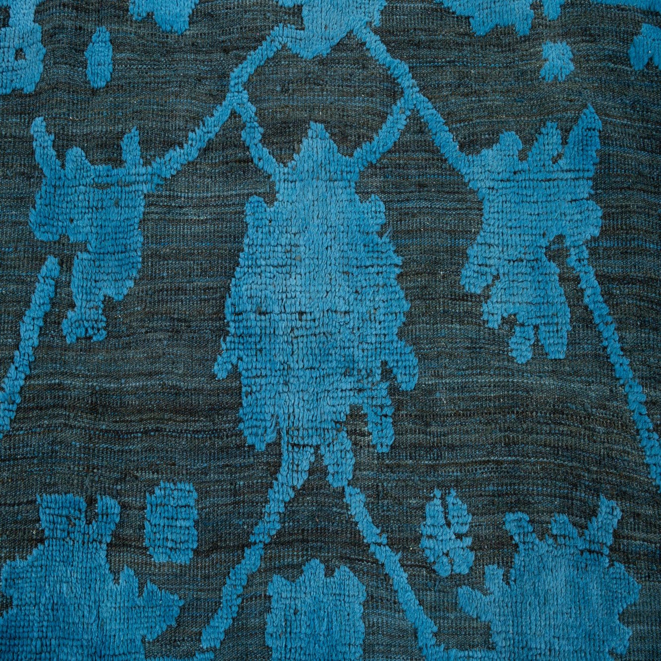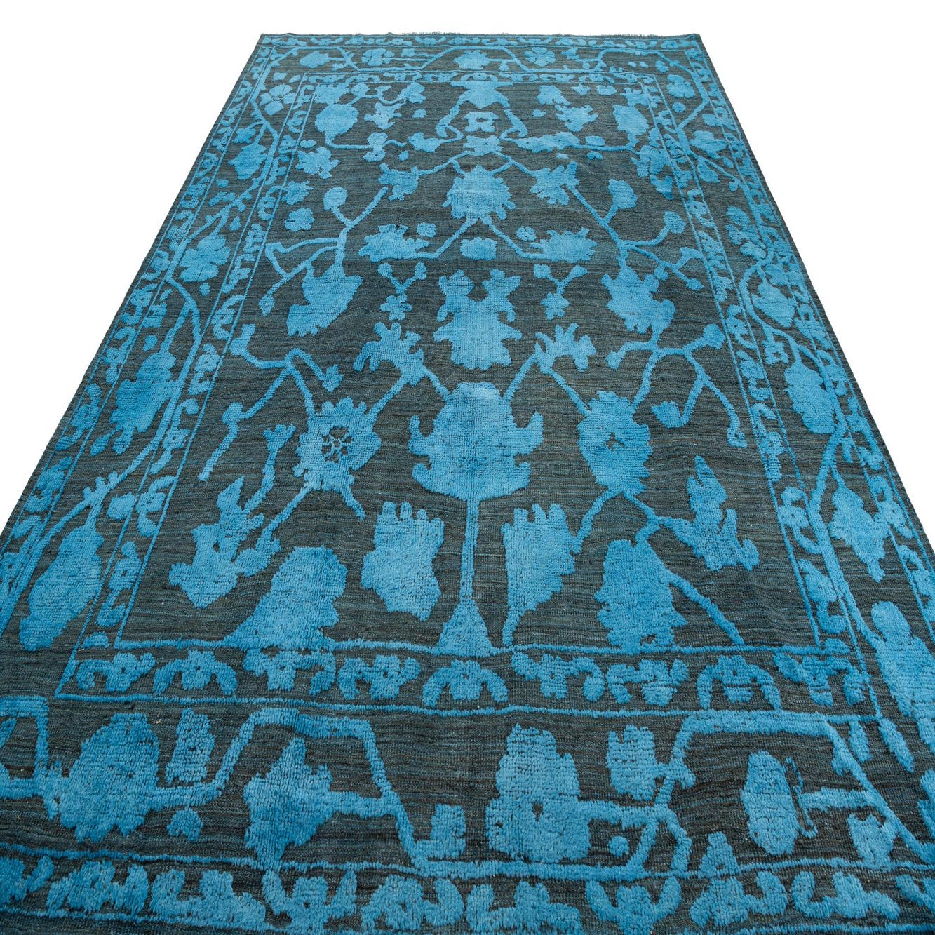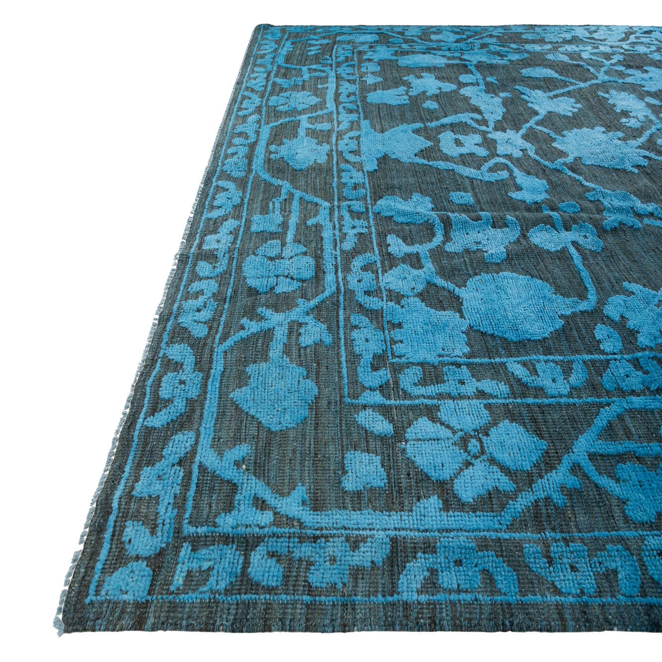A 9x12 rectangular Oushak rug in black with a modern floral pattern in bright blue, suitable for a living room.
