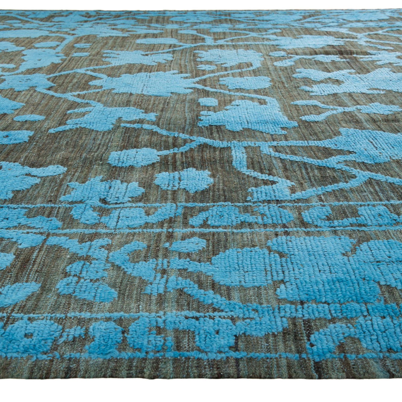 A 9x12 rectangular Oushak rug featuring a modern floral pattern in bright teal blue against a dark charcoal background.