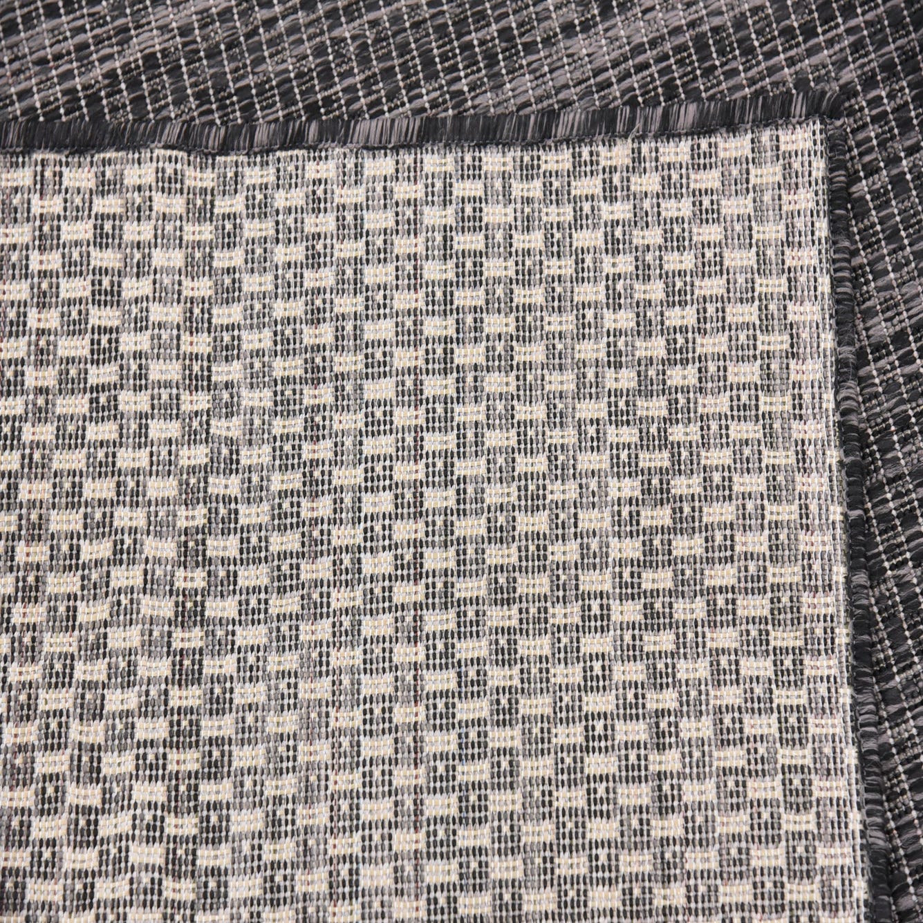 A refined, woven crosshatch pattern in beige sits over a deep black ground, giving the surface a linen-like, tactile appearance. The low-profile, flatweave texture feels firm with a slight nubby hand, offering a clean, even surface underfoot. Machine made from 100% polypropylene, the construction keeps the pattern crisp and the surface smooth to the touch.