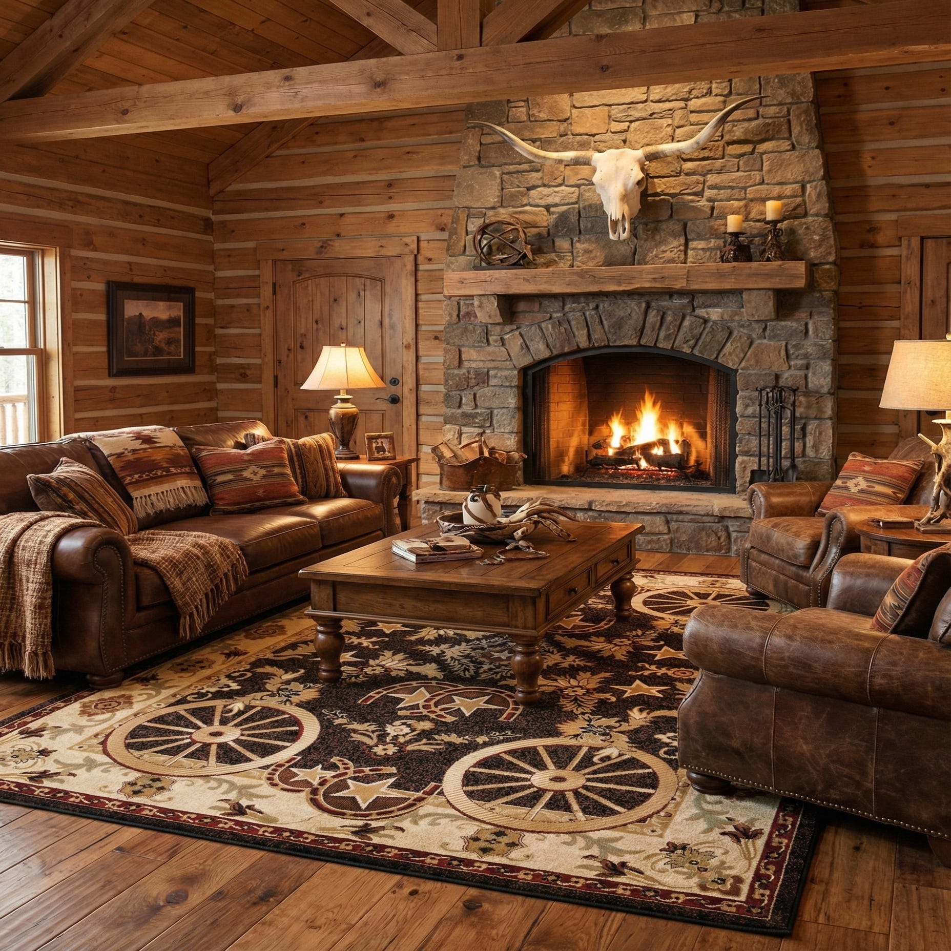 This rug pairs naturally with rustic and farmhouse interiors, complementing leather sofas, reclaimed wood furniture and iron or bronze accents. It can anchor a living room seating area, sit beneath a dining table to add visual warmth, or bring pattern and depth to an entry or den with Western or eclectic décor. Layer it with simpler textiles and neutral upholstery to let the pattern read clearly, or combine with deep, warm woods and red accents for a cohesive, lodge-inspired look.