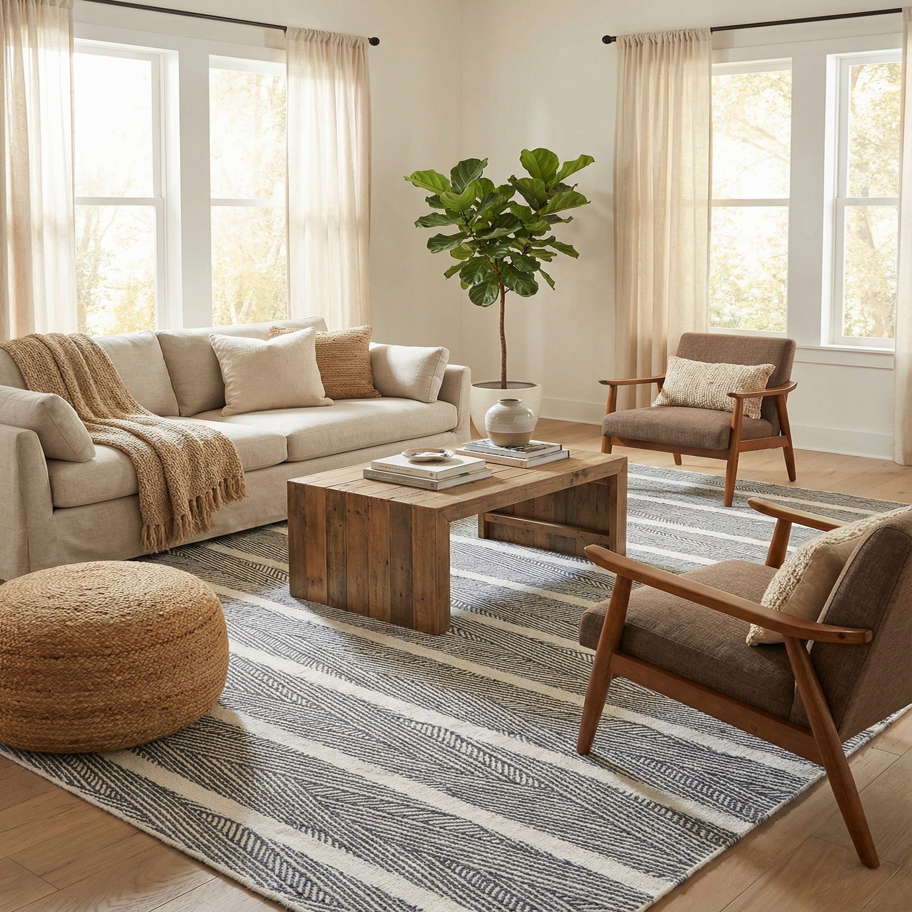Machine made from 100% cotton, the surface has a soft, tactile hand and a low-profile, flatwoven texture that layers well under furniture or in high-traffic areas. Use it to ground a living room seating group, define a dining area under a table, or add a graphic layer at the foot of a bed. It pairs especially well with light woods, matte metals, and neutral upholstery, and works in contemporary, transitional, or modern farmhouse interiors that favor clean lines and contrasting tones.