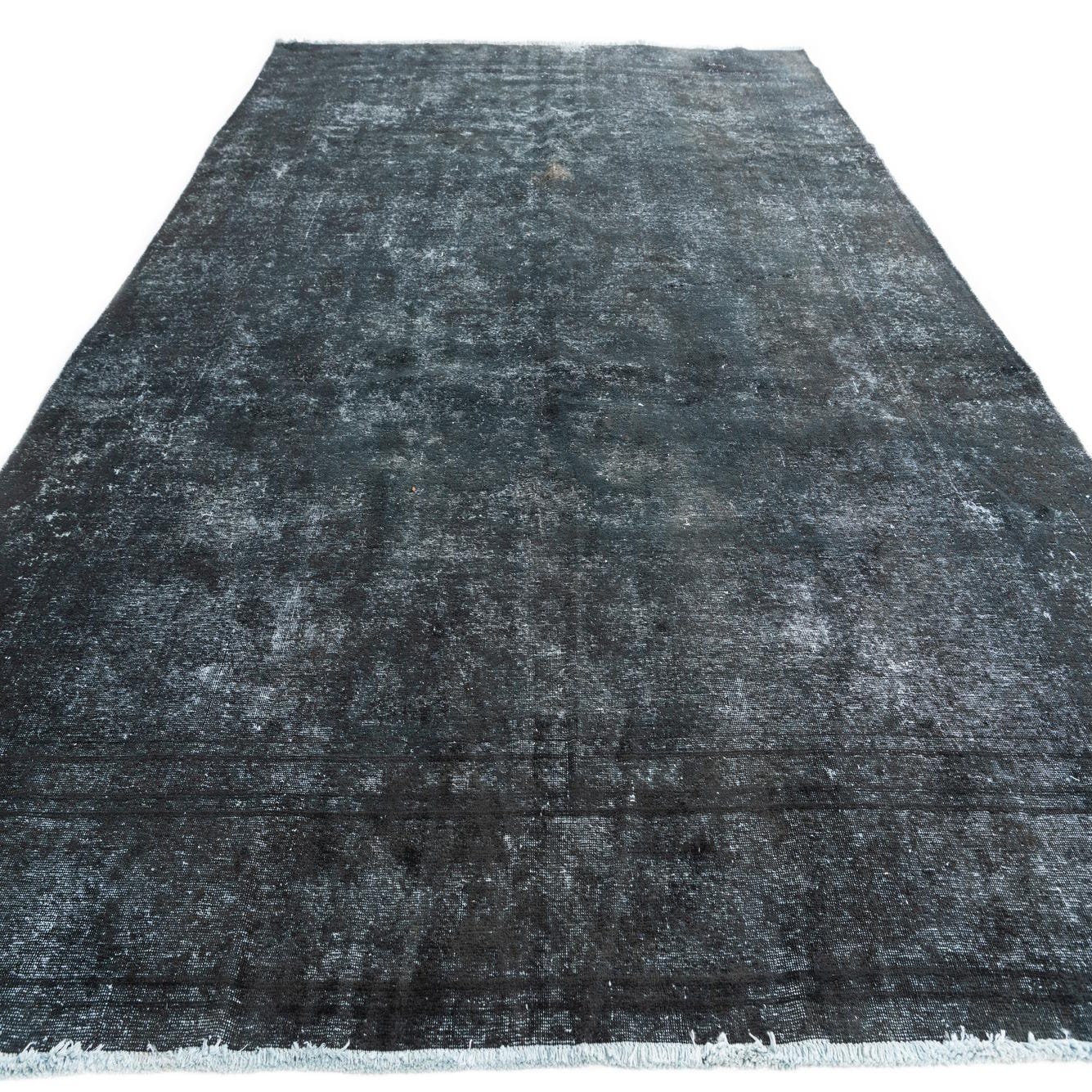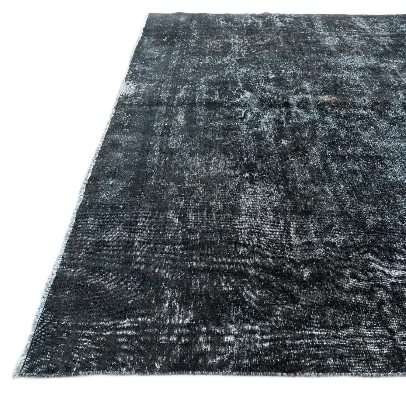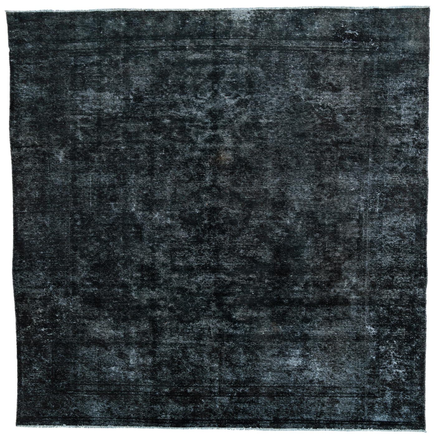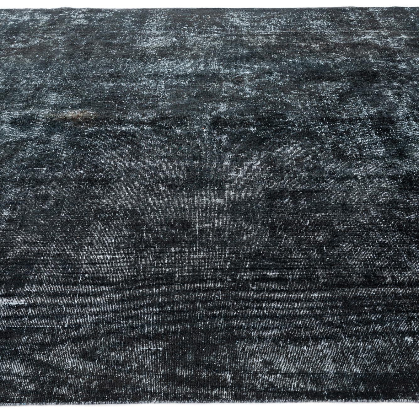 A large 9x12 rectangular black wool area rug with a faded vintage Persian pattern, suitable for a living room.