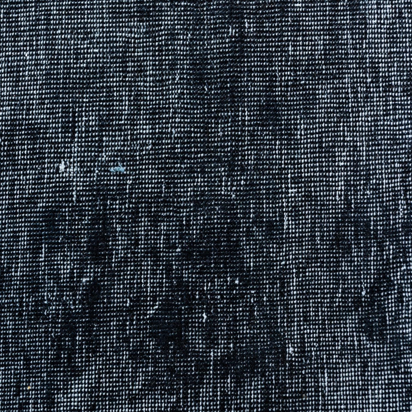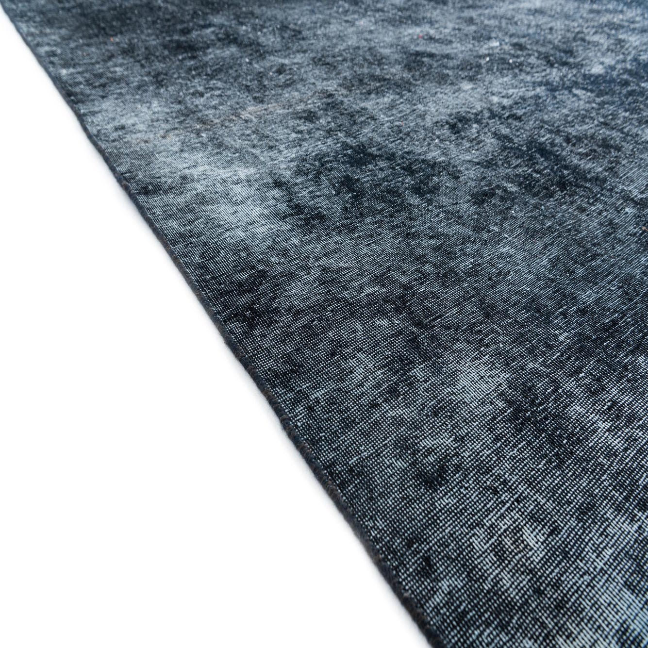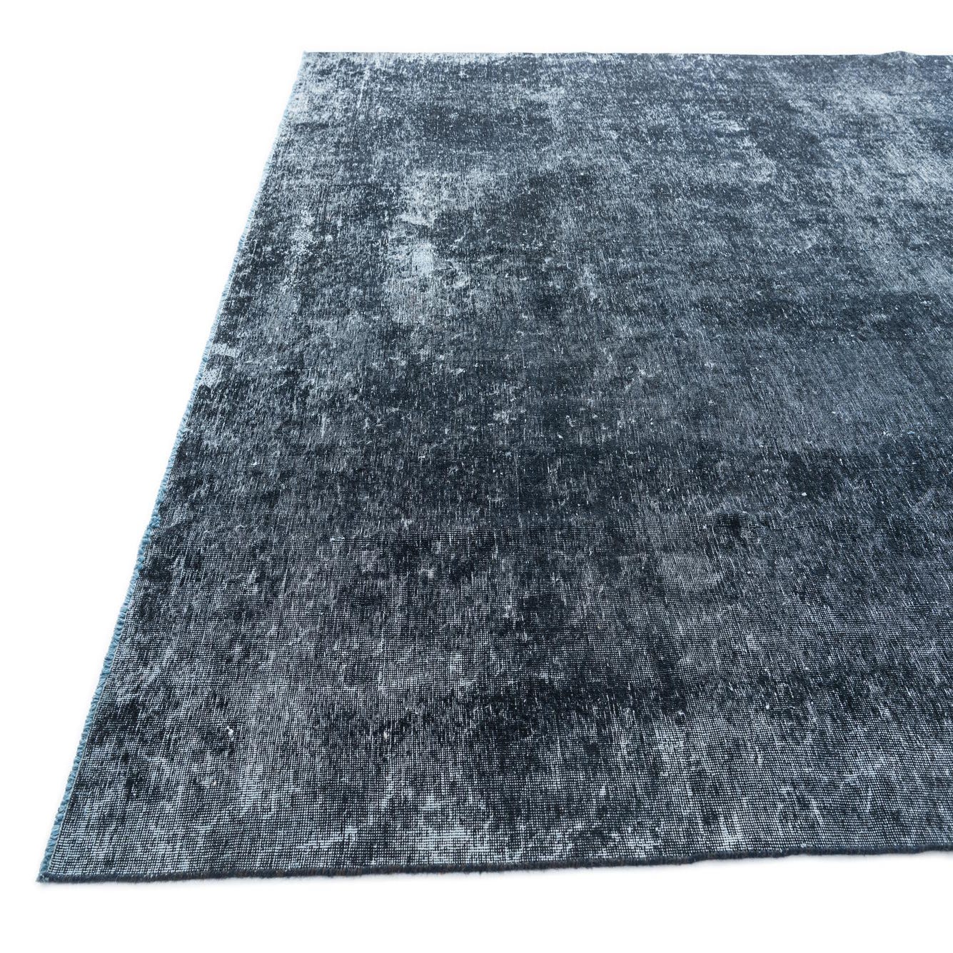 A predominantly black ground gives this hand-knotted, 100% wool rug a strong, grounding presence while deep navy blue and subtle ivory highlights create a softly variegated surface. The pattern is intentionally understated—broad tonal shifts and a gently worn, overdyed effect replace distinct motifs, resulting in a calm, vintage-inspired look. The wool pile has a soft, velvety hand with slight variations in sheen where the fibers catch the light, offering tactile depth without a thick, lofty profile.