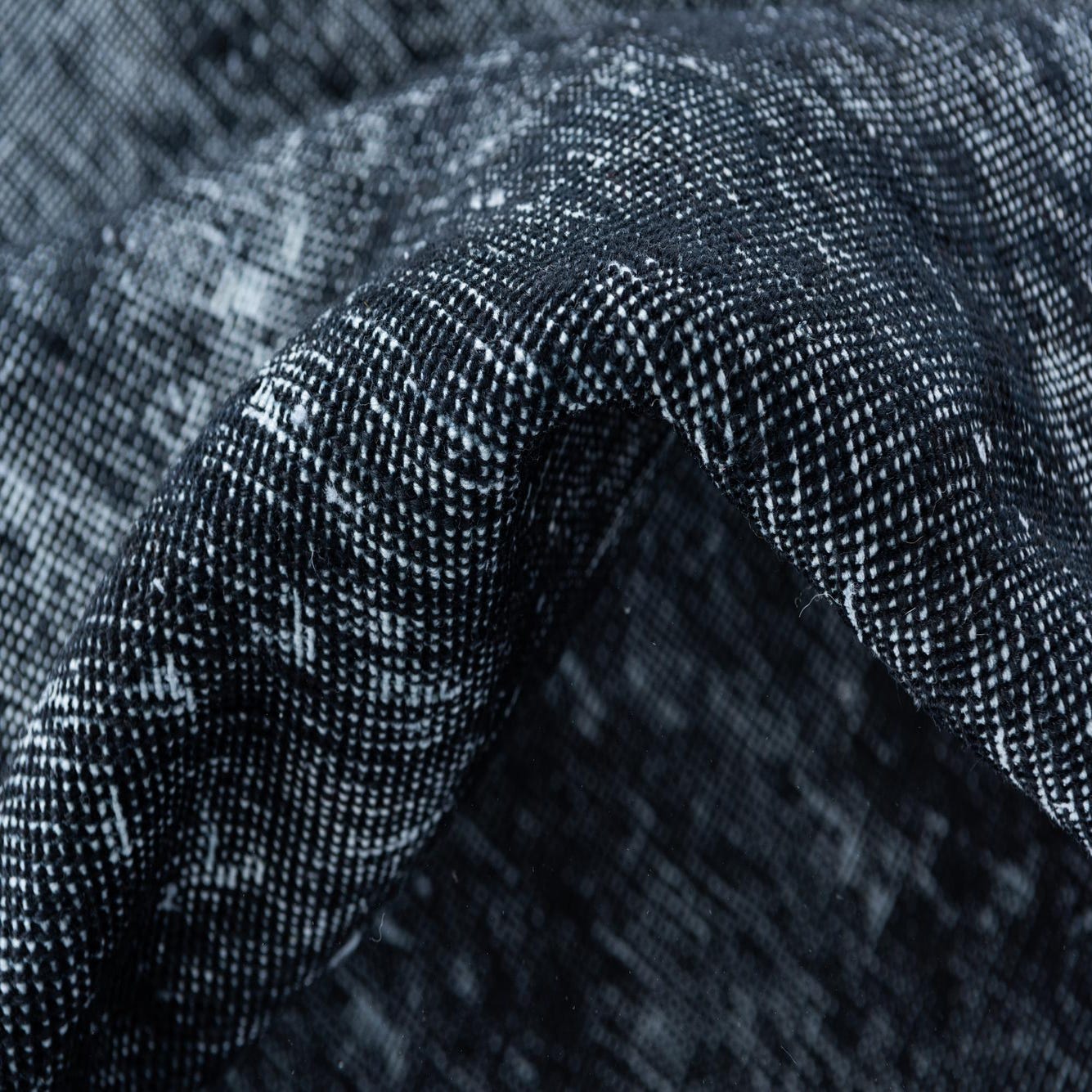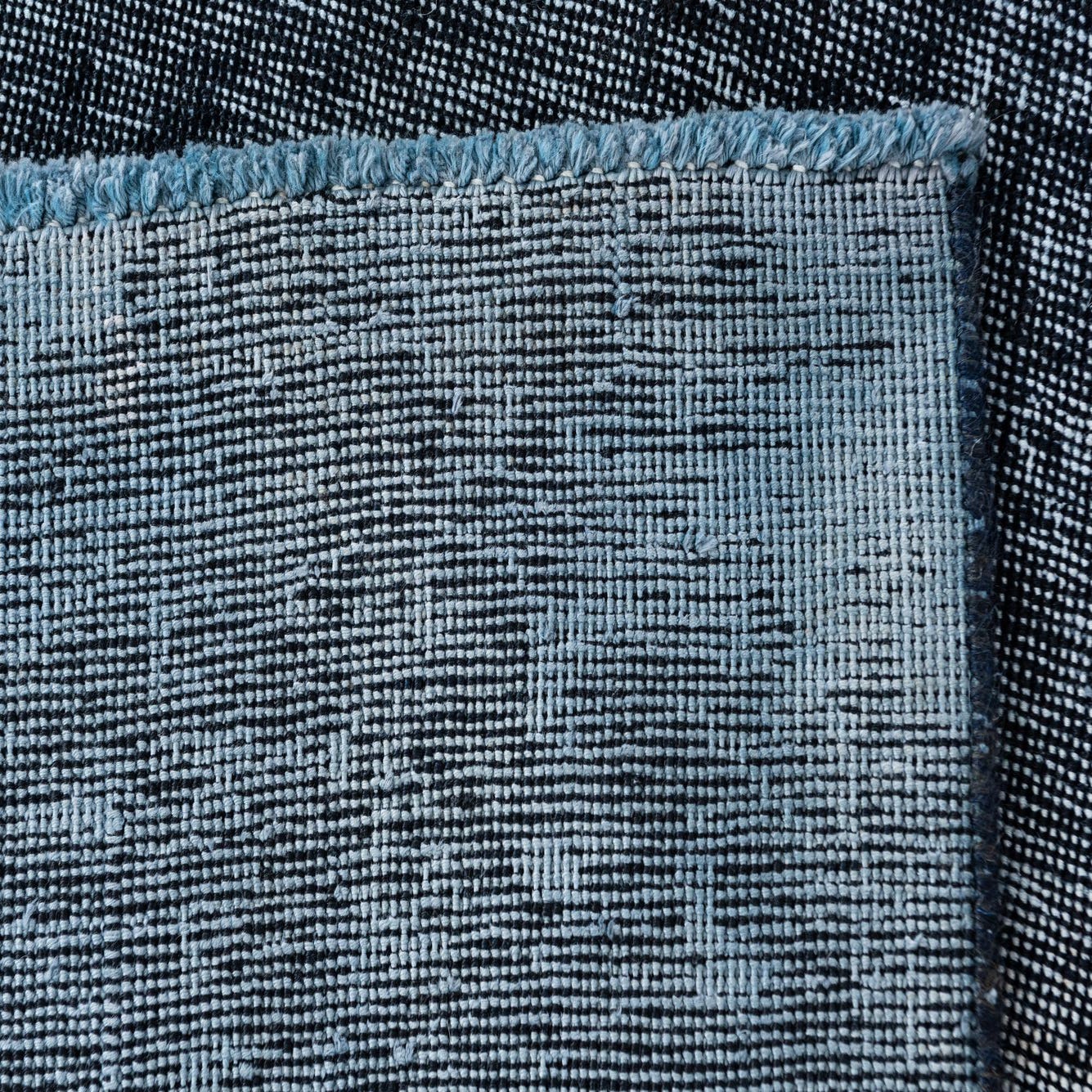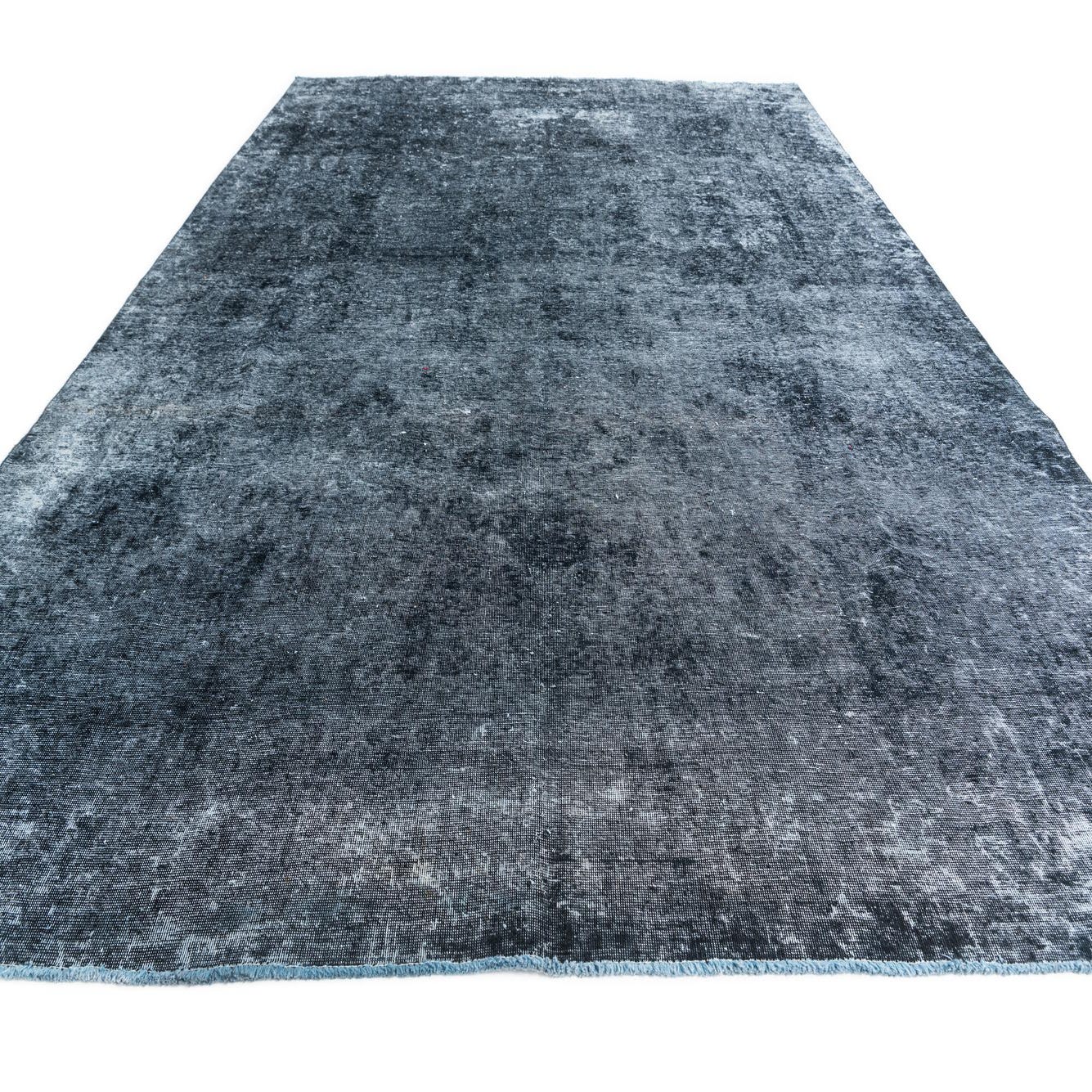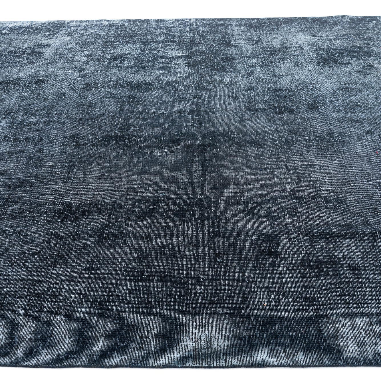 A predominantly black ground gives this hand-knotted, 100% wool rug a strong, grounding presence while deep navy blue and subtle ivory highlights create a softly variegated surface. The pattern is intentionally understated—broad tonal shifts and a gently worn, overdyed effect replace distinct motifs, resulting in a calm, vintage-inspired look. The wool pile has a soft, velvety hand with slight variations in sheen where the fibers catch the light, offering tactile depth without a thick, lofty profile.