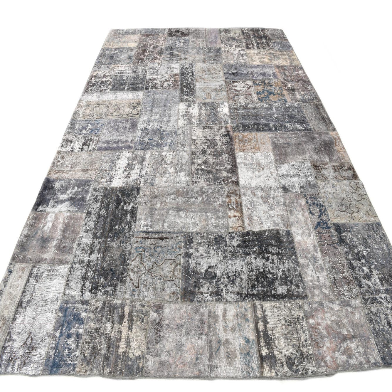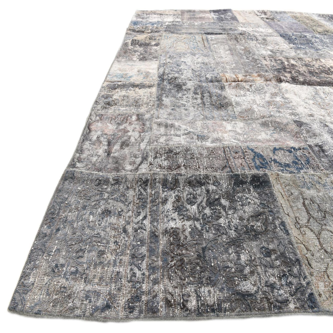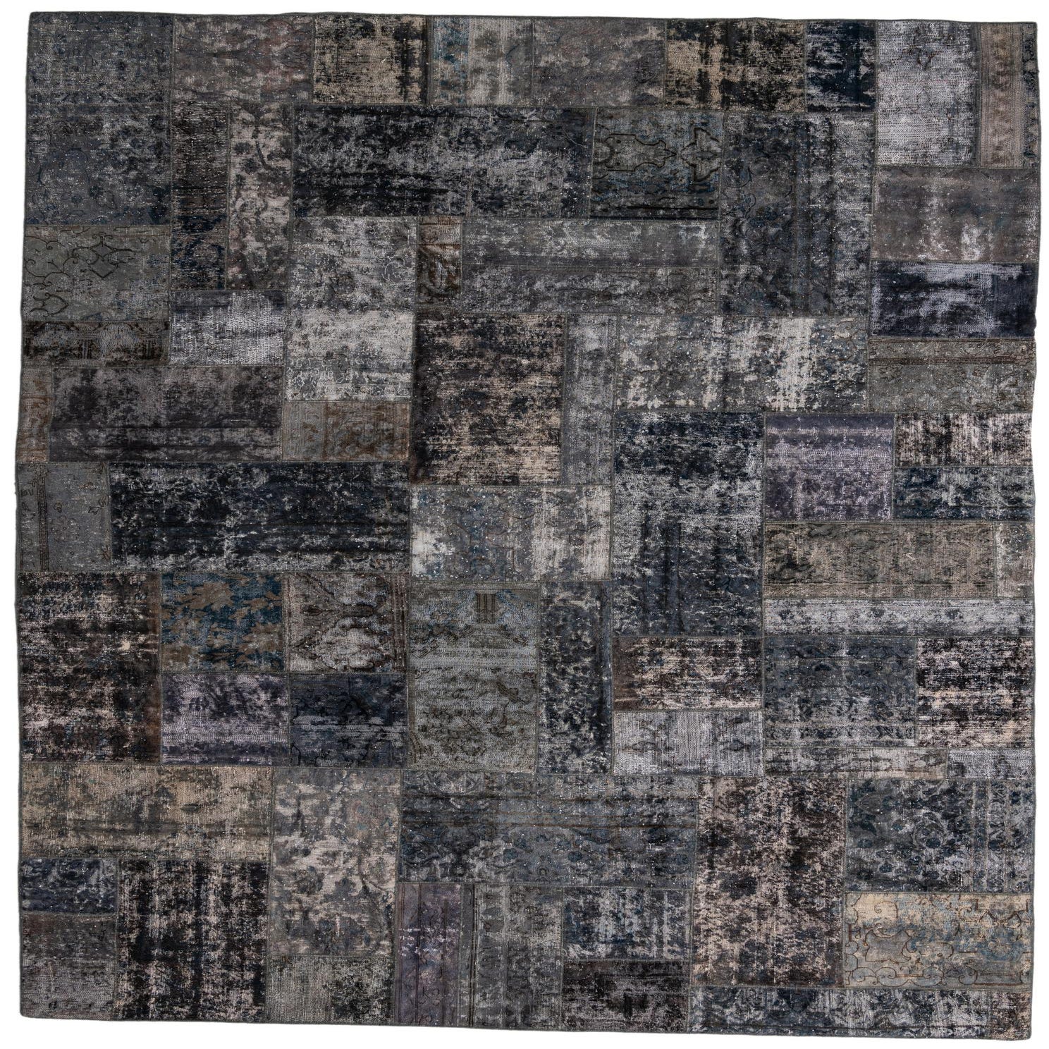 Part of the Ultra Vintage collection, this hand-knotted 9x12 rug is crafted from 100% wool, offering a dense and plush feel underfoot. The rug showcases a deep black background, overlaid with an intricate patchwork of designs and color blocks, weaving together an array of hues including black, blue, brown, gray, ivory, light blue, navy blue, olive, and turquoise. The texture provides a subtle, tactile experience, while the pattern implies a storied past with a modern twist.