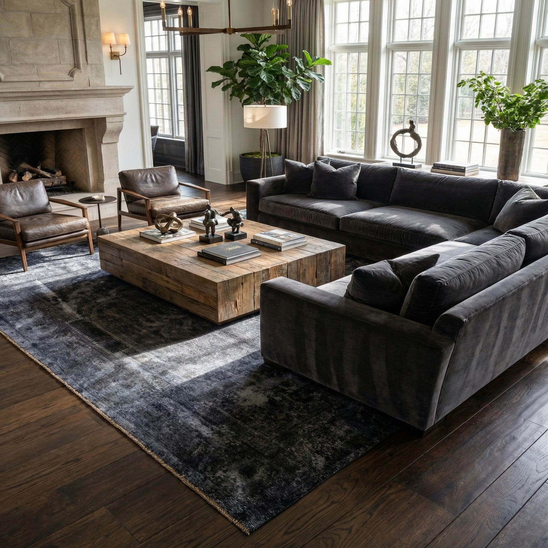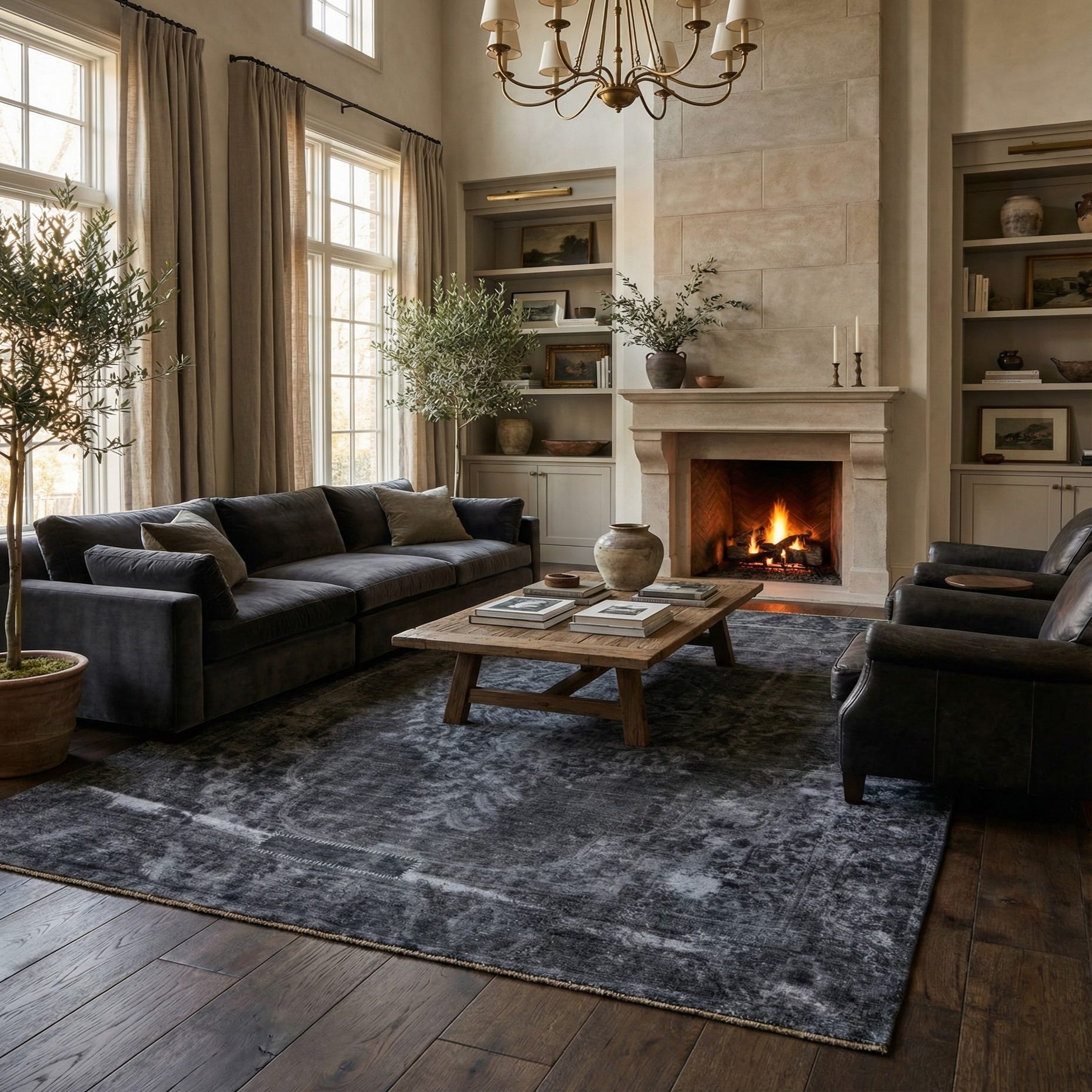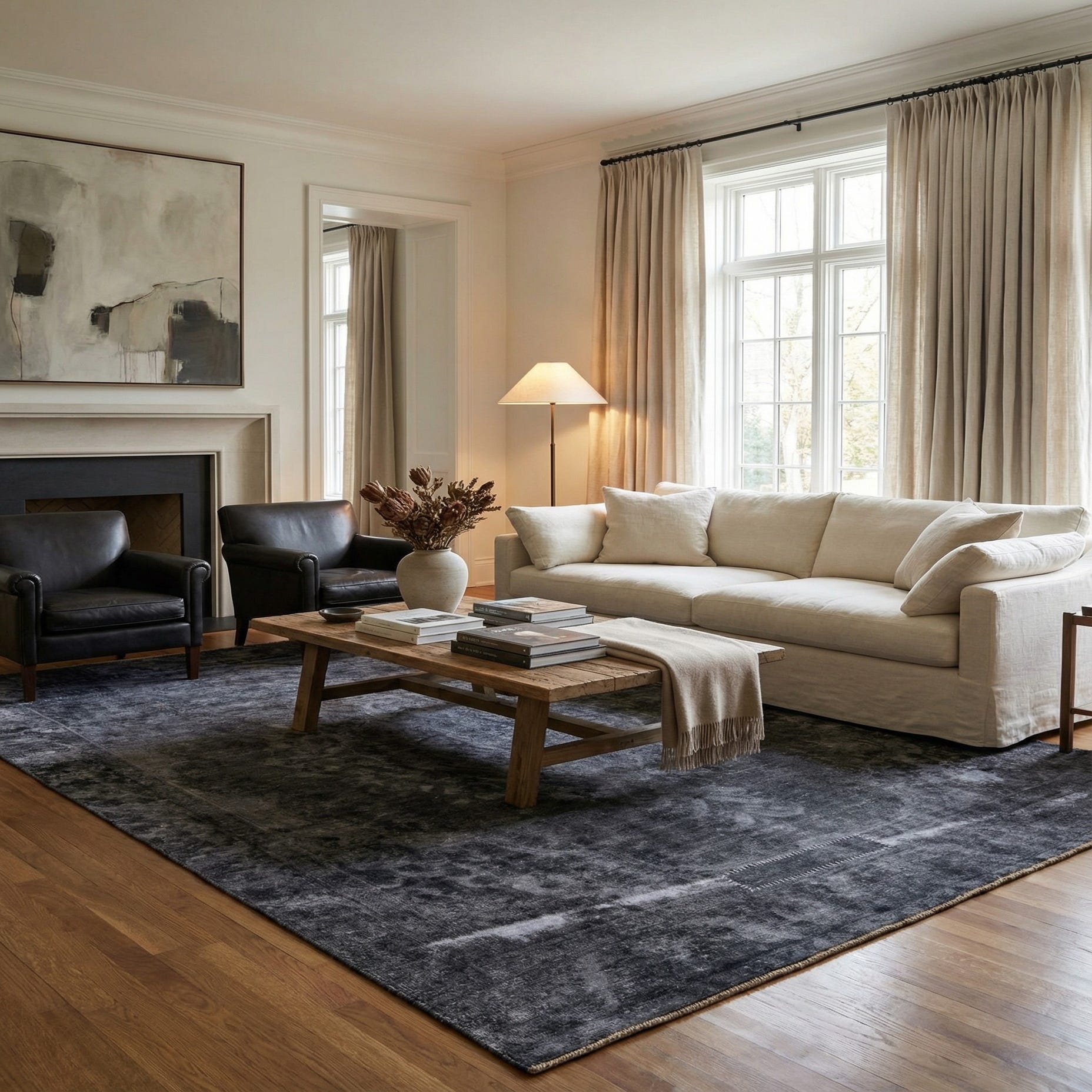 The wool pile has a low, velvety hand that feels soft underfoot and displays subtle sheen as you move around the room. Use this piece to anchor a living area beneath a sectional or seating group, ground a dining table in a contemporary or industrial space, or add a moody layer to a master bedroom. It pairs especially well with leather and raw wood furnishings, matte metal accents, and neutral textiles in charcoal, slate, or natural tones.