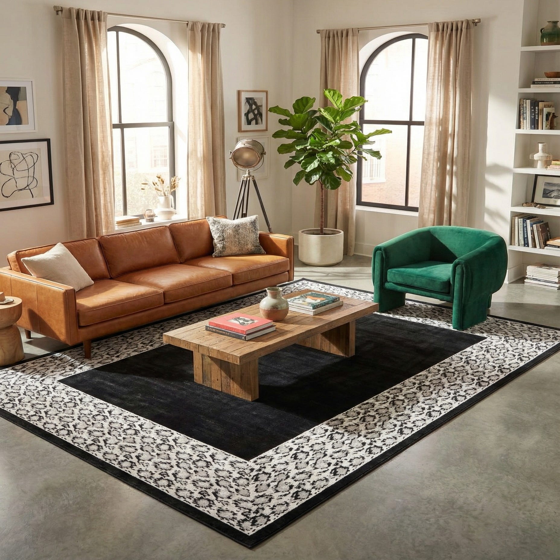 The Vince Camuto 9x12 rug boasts a contemporary design, incorporating a bold black background with a striking ivory and gray pattern. The border features an intricate, ornamental motif that lends a sense of sophistication and visual interest. Machine-woven from 60% polypropylene and 40% polyester, this rug offers durability while maintaining a soft texture underfoot.