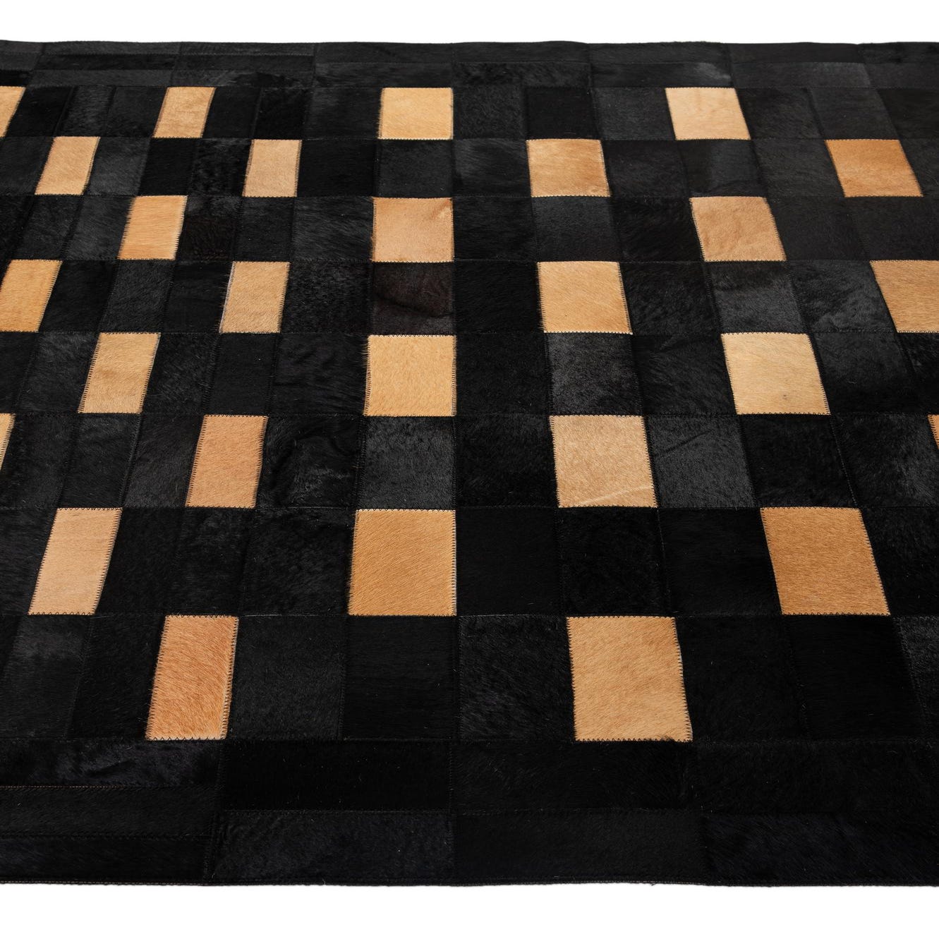 Hand-made from cowhide and leather, this patchwork rug pairs a deep black field with warm beige rectangular insets arranged in a precise, grid-like pattern. The alternating blocks create a rhythmic, modern geometry while a narrow black-hide border frames the composition. Running your hand across the surface reveals the low, hair-on-hide nap and the subtle sheen of cured leather; stitched seams give a tactile definition where each panel meets, adding structure without bulk.