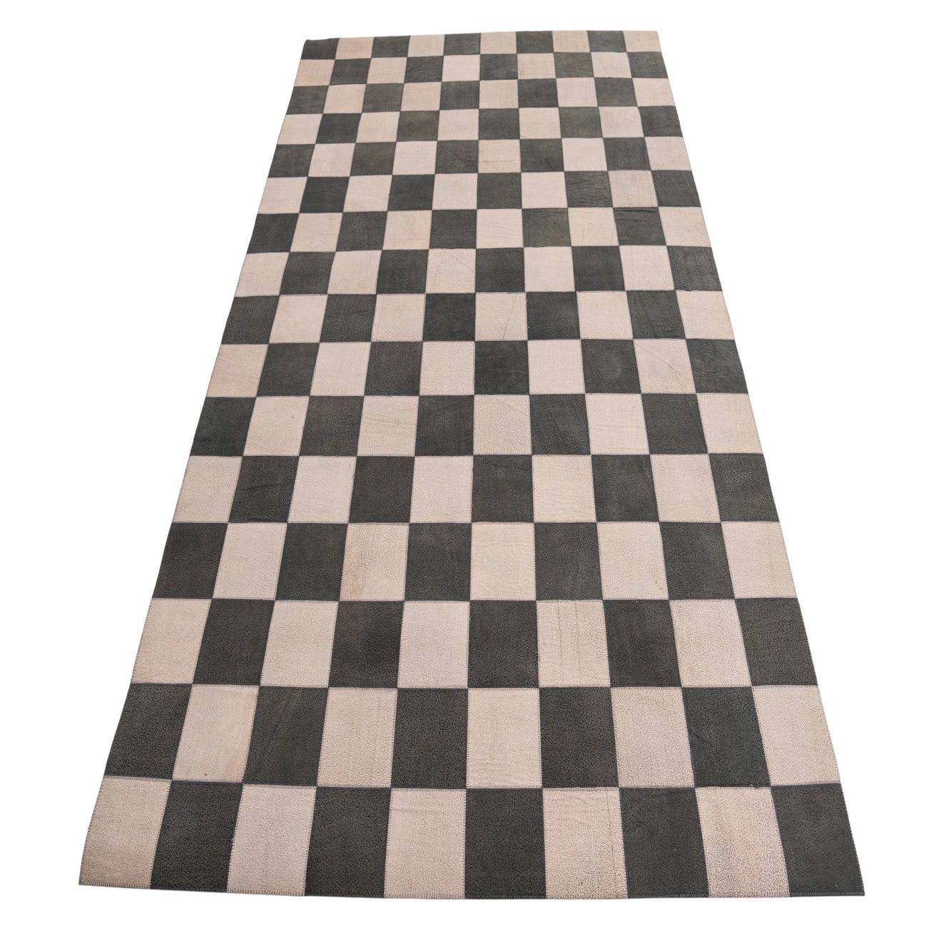 A 5x8 rectangular black and white checkered rug made from cowhide and leather, ideal for a living room.
