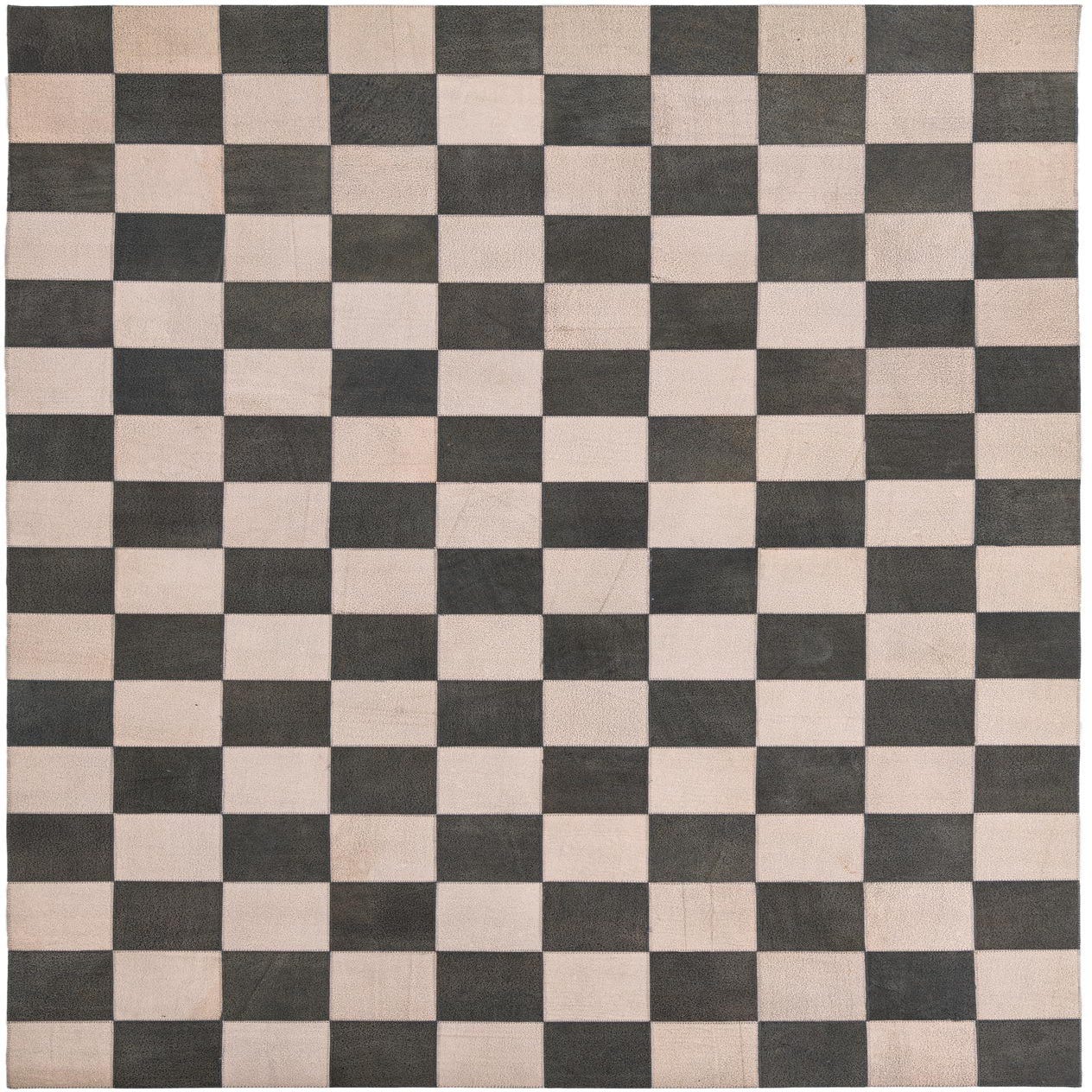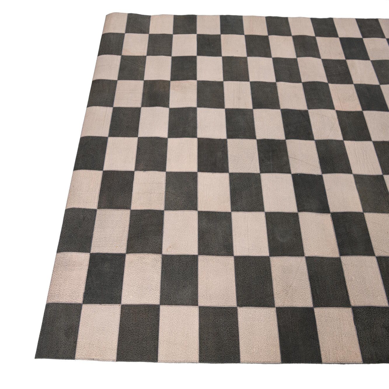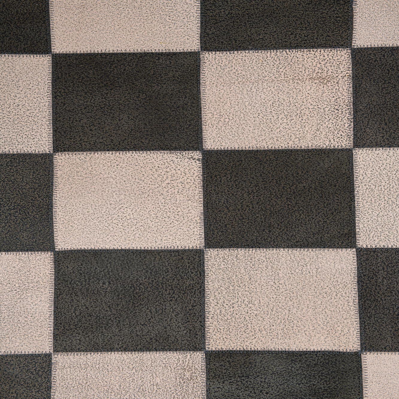 A bold checkerboard layout gives this hand-made rug a strong graphic presence, alternating clean black and warm beige squares in a precise, even grid. Each square is crafted from cowhide and leather, creating a subtle contrast between the soft, slightly textured hair-on-hide sections and the smoother leather panels. The surface has a tactile quality—pleasantly supple underfoot with natural variations in tone and grain that emphasize the handcrafted construction.