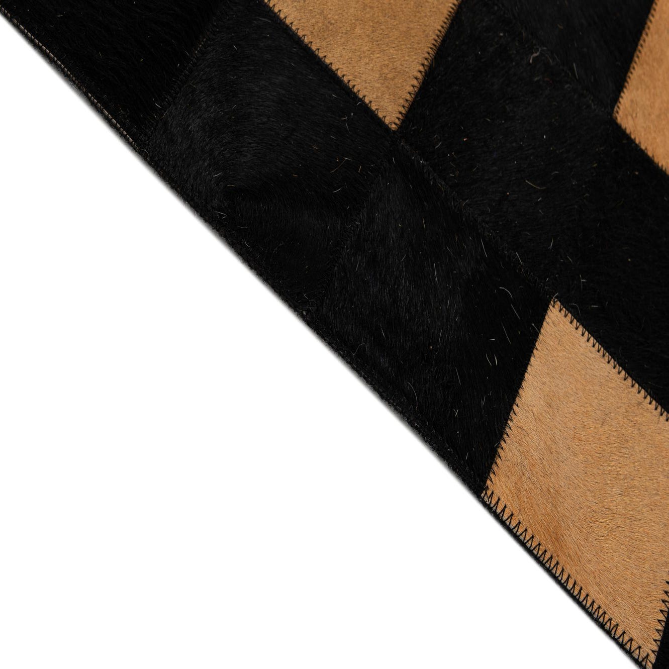 A rectangular 8x10 black and tan cowhide rug with a modern checkerboard patchwork pattern, suitable for a living room.