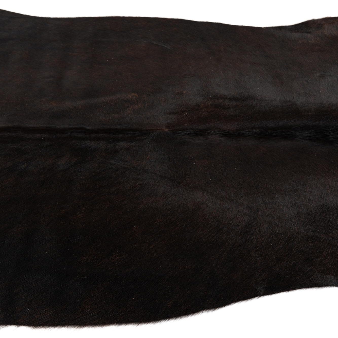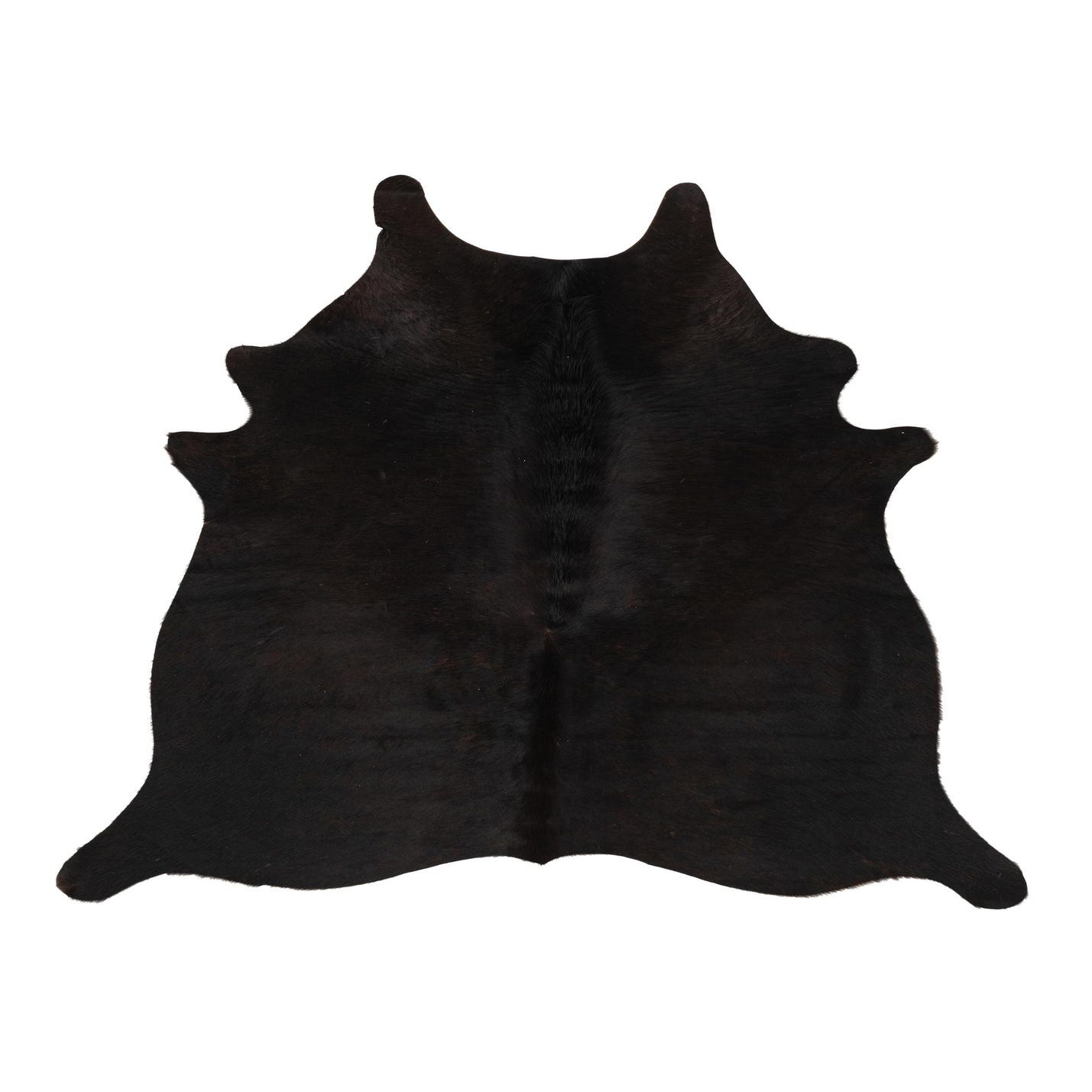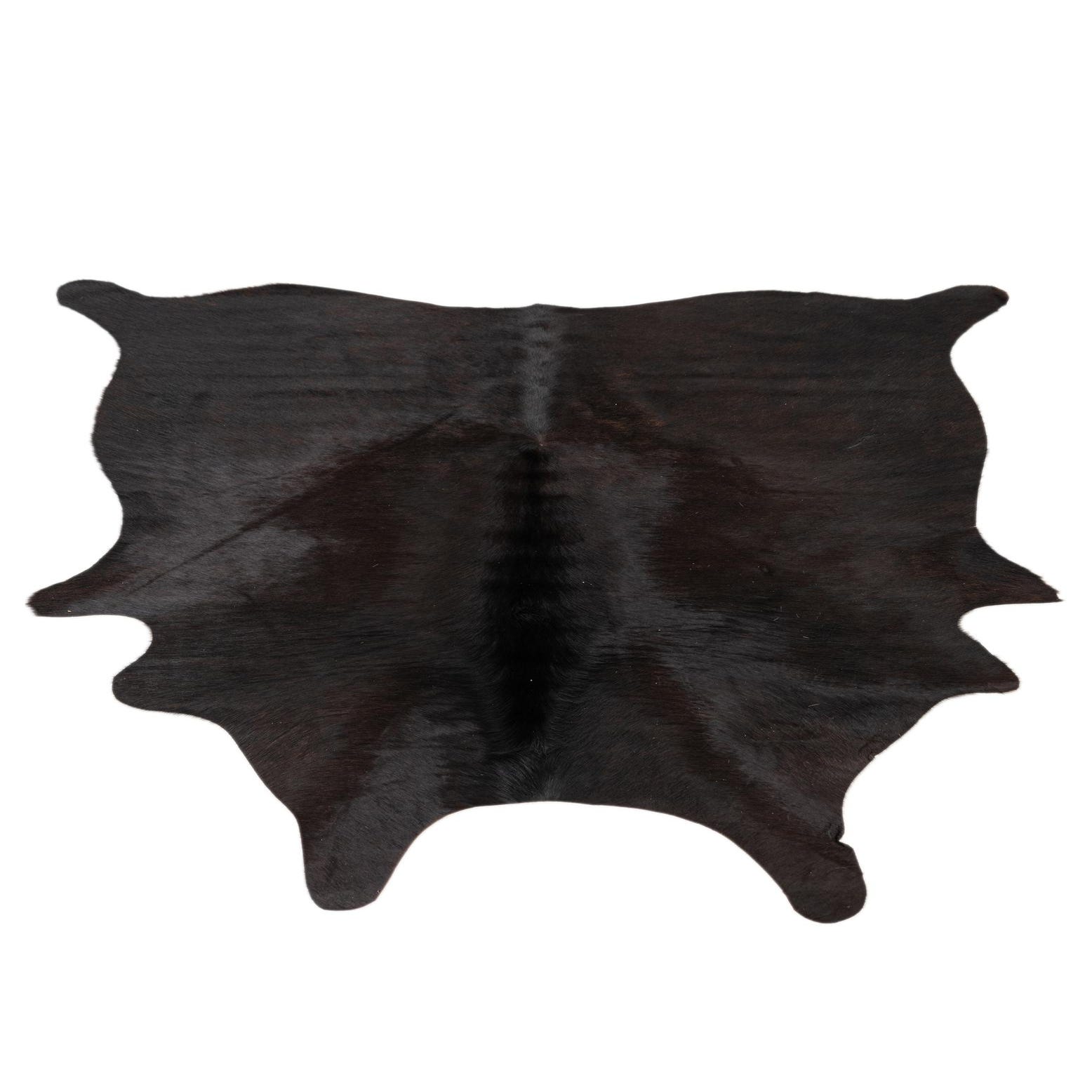 A 4' 9 x 4' 11 black and brown cowhide leather rug with an irregular, natural shape, suitable for modern indoor spaces.