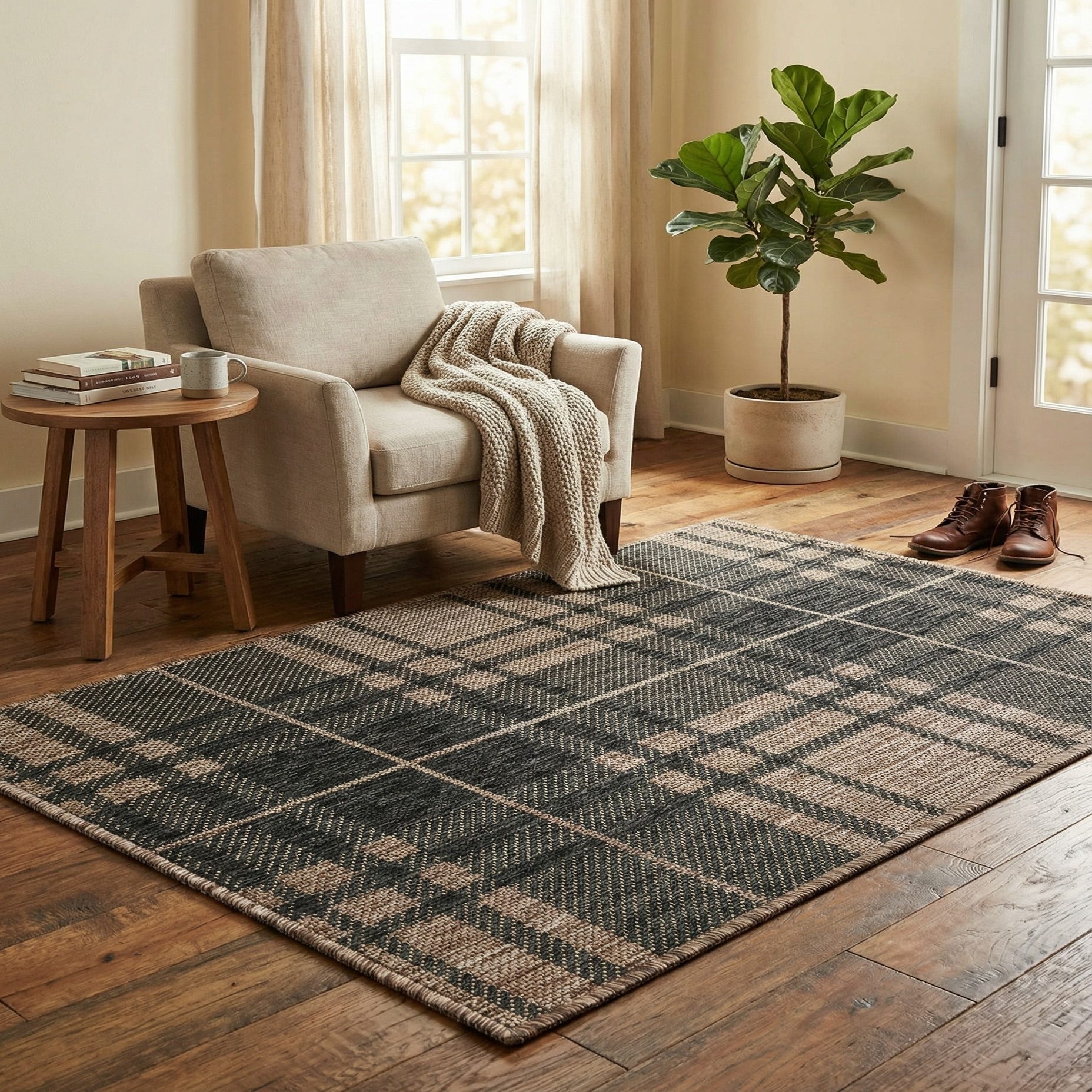 A 2x3 rectangular Rugs.com Outdoor Checkered rug featuring a modern black and brown plaid pattern with a flatweave texture.