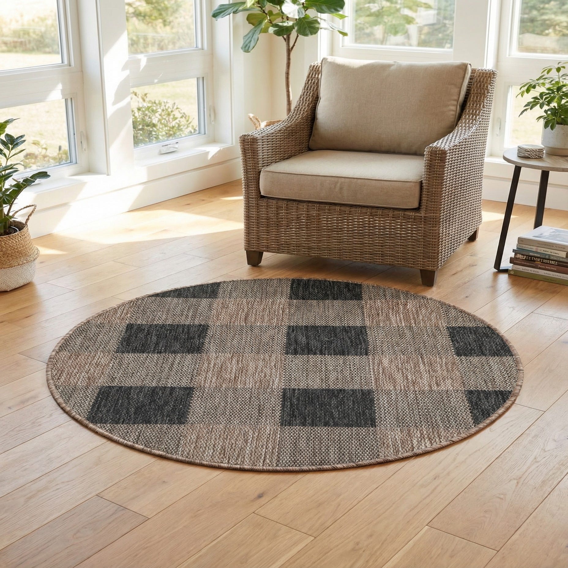 This round shape is ideal for centering a bistro table, anchoring a small outdoor seating area, or adding definition to a covered porch or sunroom. The neutral black-and-brown palette pairs easily with natural wood, metal frames, woven wicker, and muted textiles, making it a good match for casual contemporary, modern farmhouse, or industrial-inspired outdoor setups.