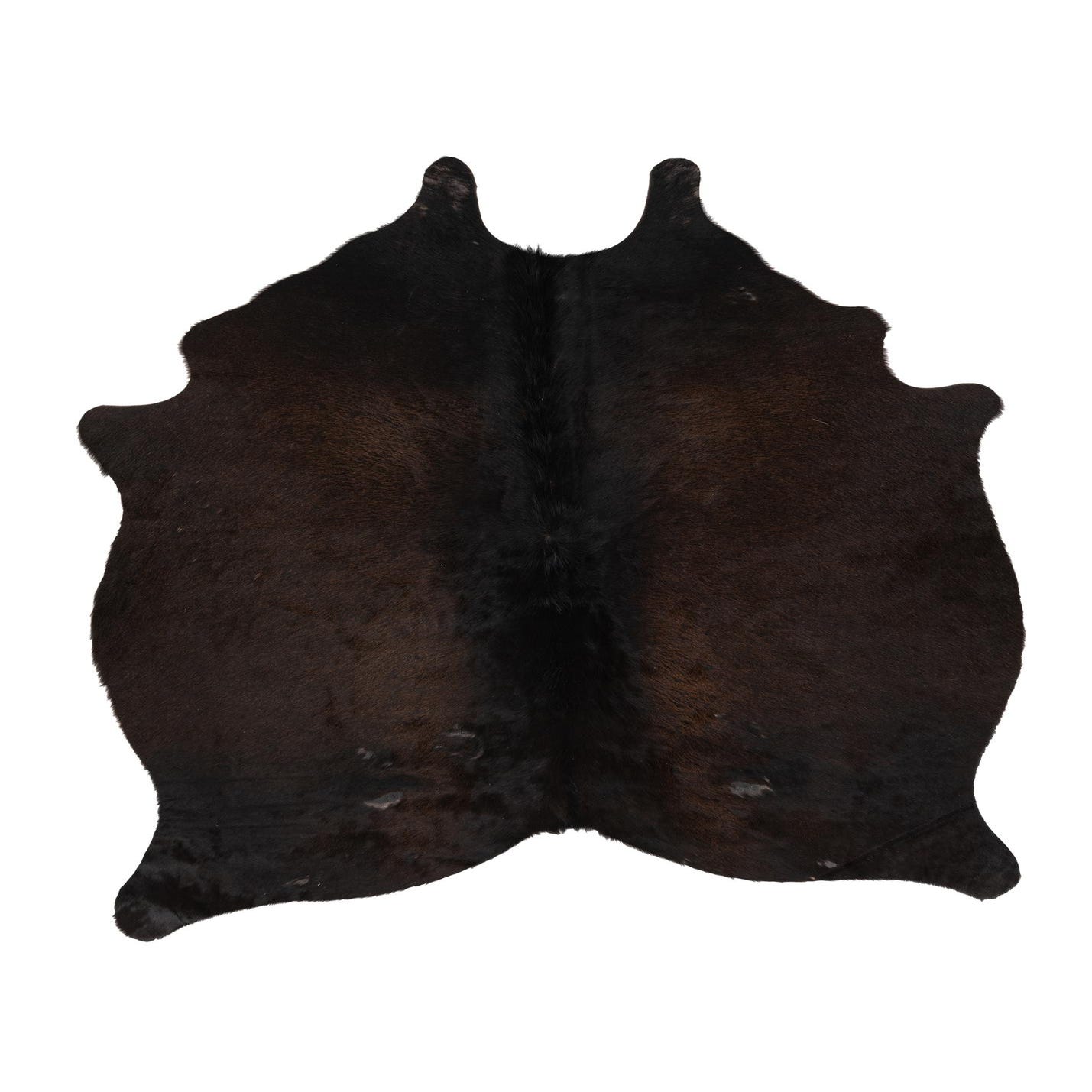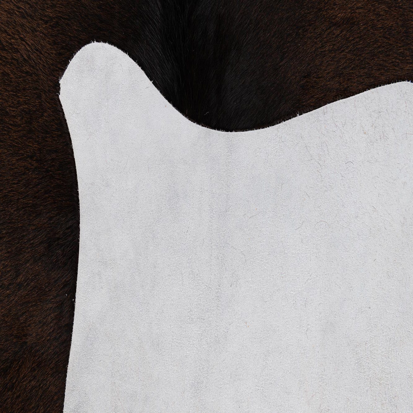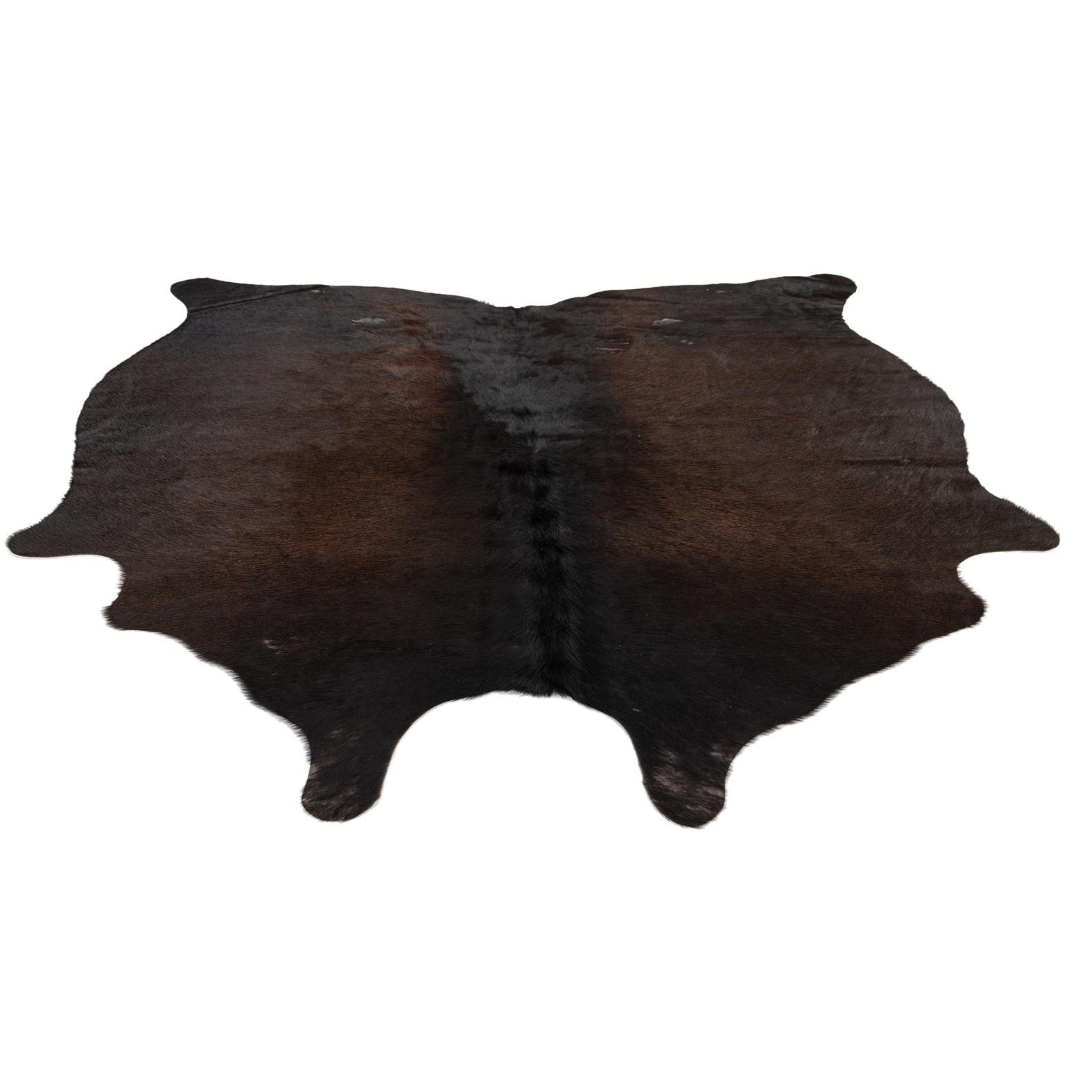 Handmade from cowhide and leather, this hair-on-hide rug shows deep black and rich brown tones across an organic, freeform silhouette. The surface has a smooth, tactile hair-on finish with a subtle natural sheen and a slightly denser, darker stripe along the center that accentuates the hide’s inherent markings. Irregular edges and gentle color variation create a relaxed, authentic pattern that reads as natural and unstructured rather than geometric.