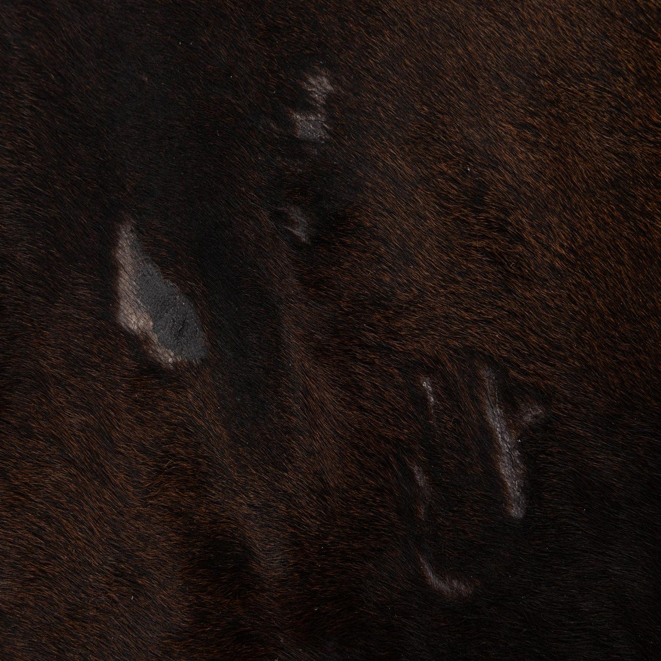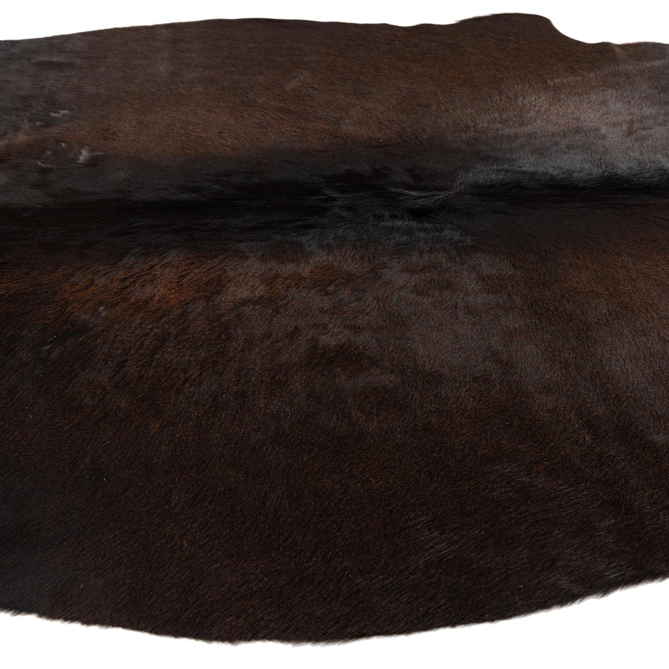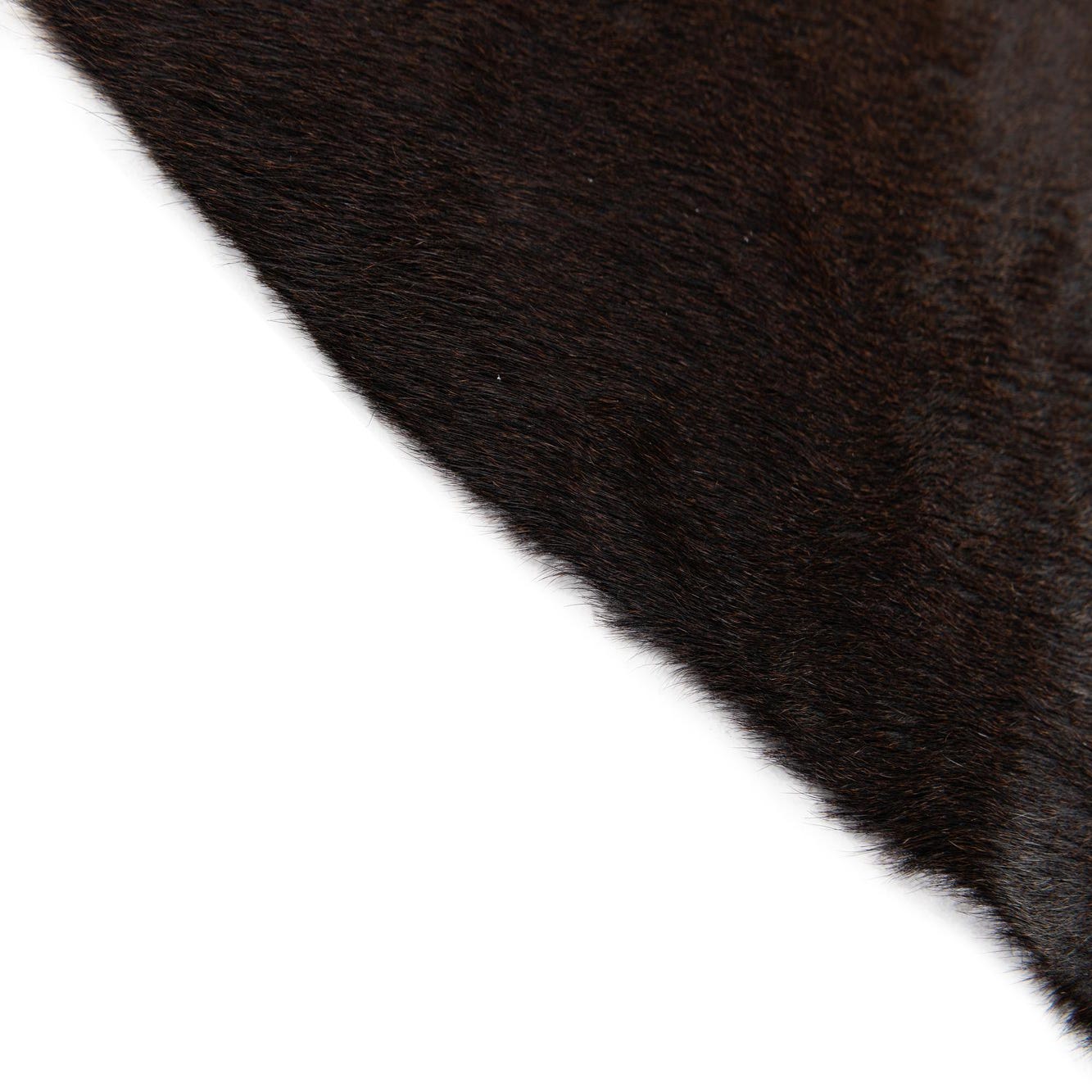 Handmade from cowhide and leather, this hair-on-hide rug shows deep black and rich brown tones across an organic, freeform silhouette. The surface has a smooth, tactile hair-on finish with a subtle natural sheen and a slightly denser, darker stripe along the center that accentuates the hide’s inherent markings. Irregular edges and gentle color variation create a relaxed, authentic pattern that reads as natural and unstructured rather than geometric.