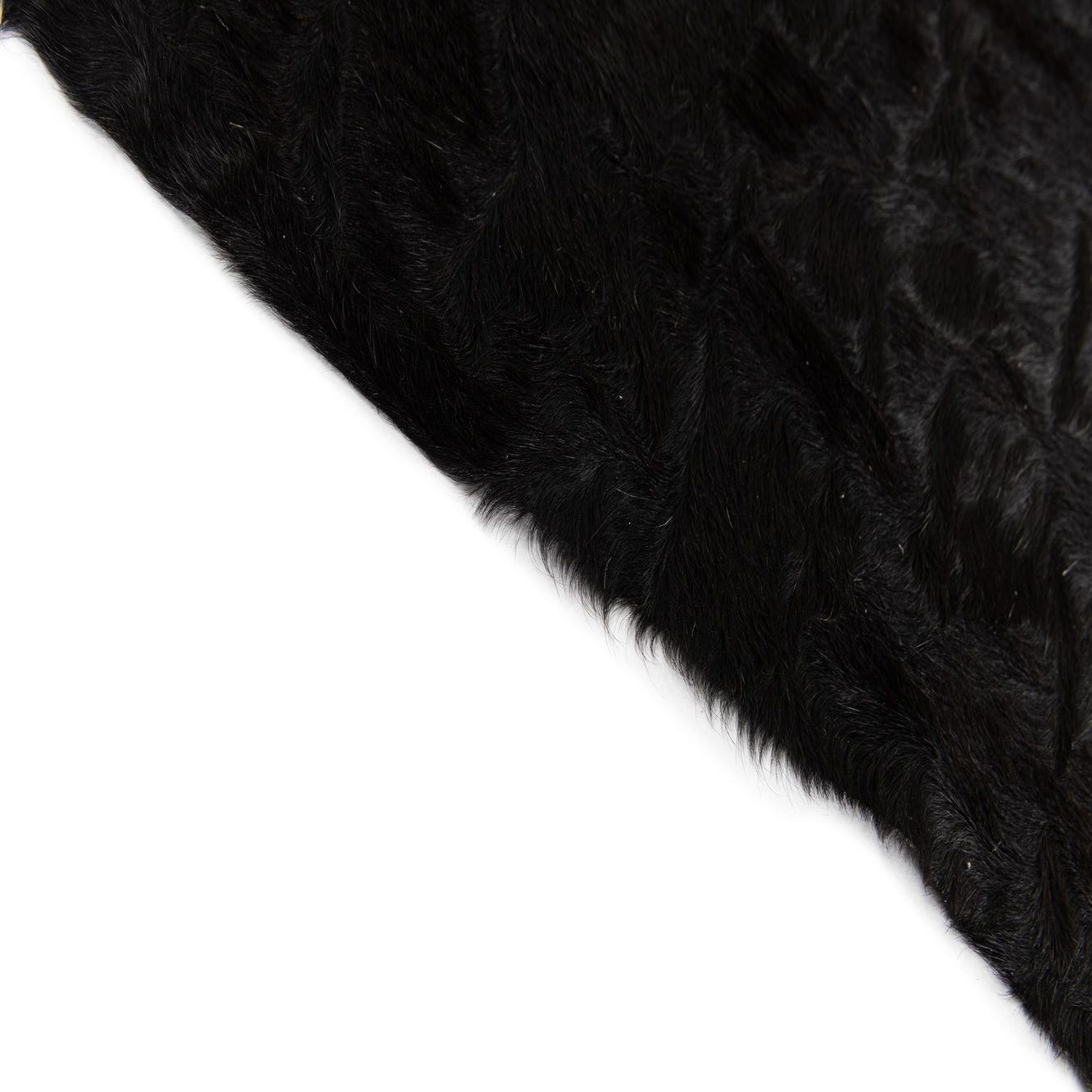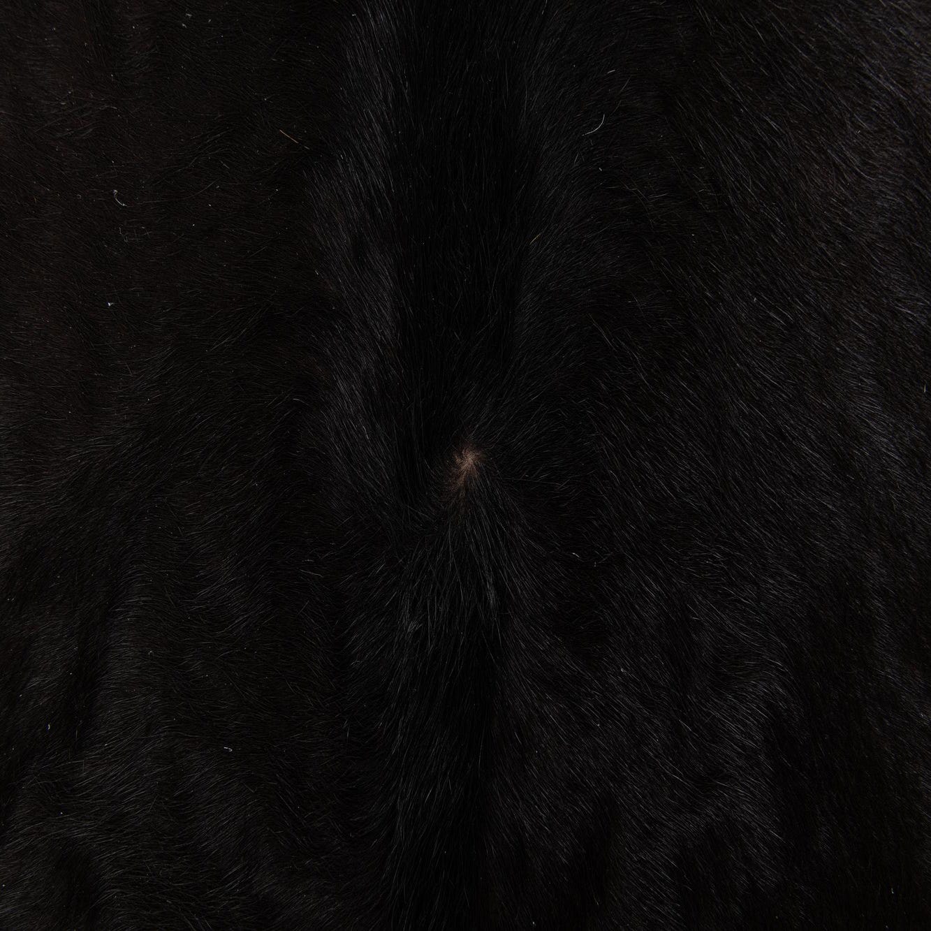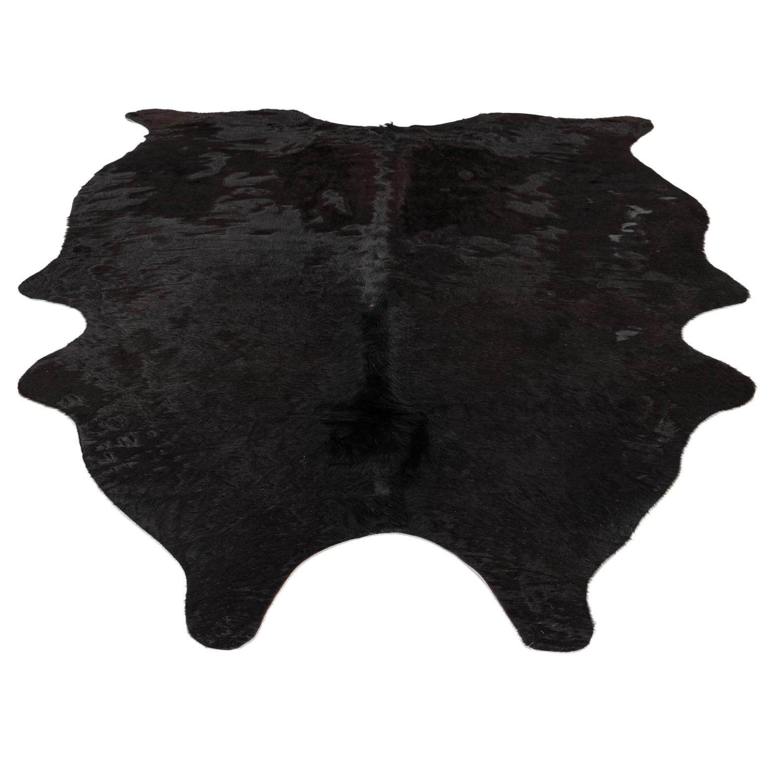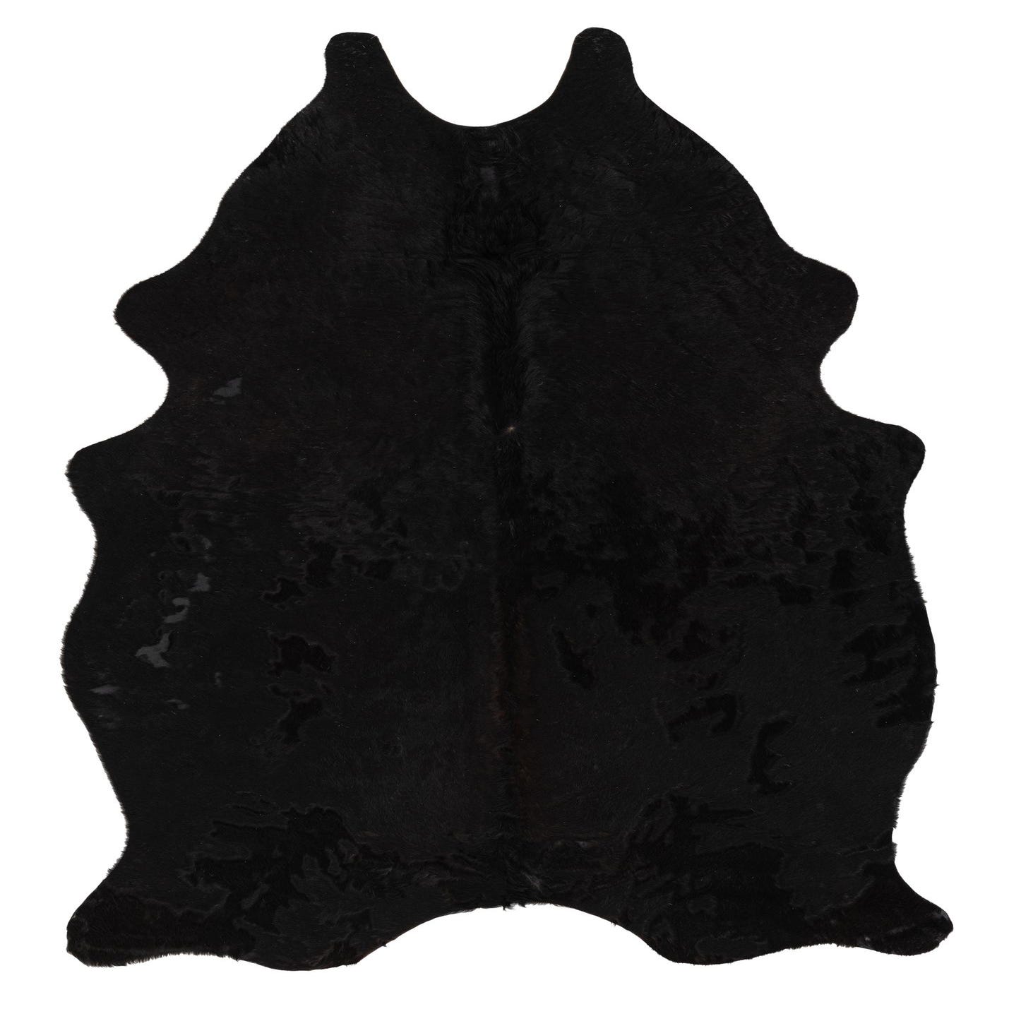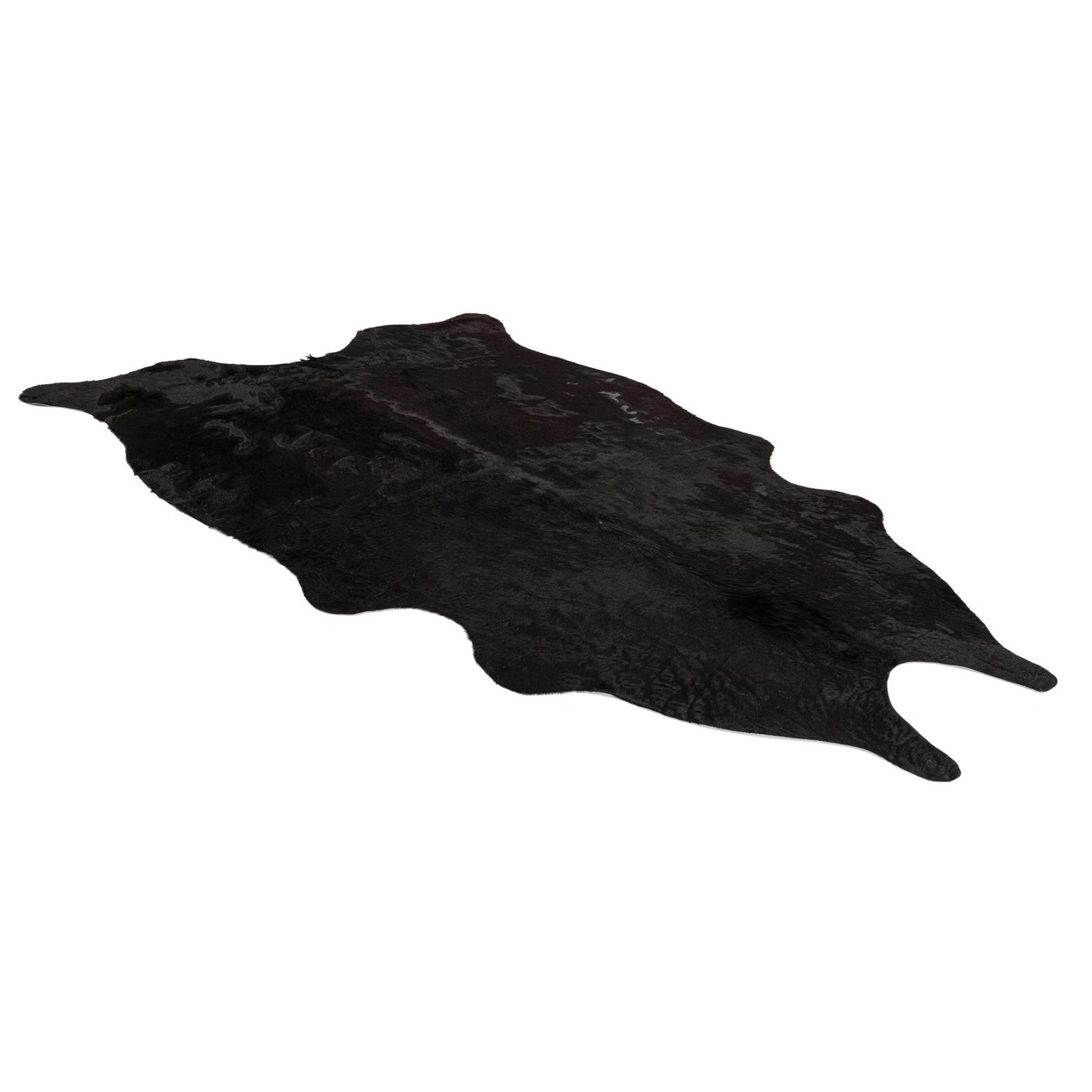 A 4x6 black cowhide leather rug with a natural, irregular shape, showcasing its textured, flat pile.
