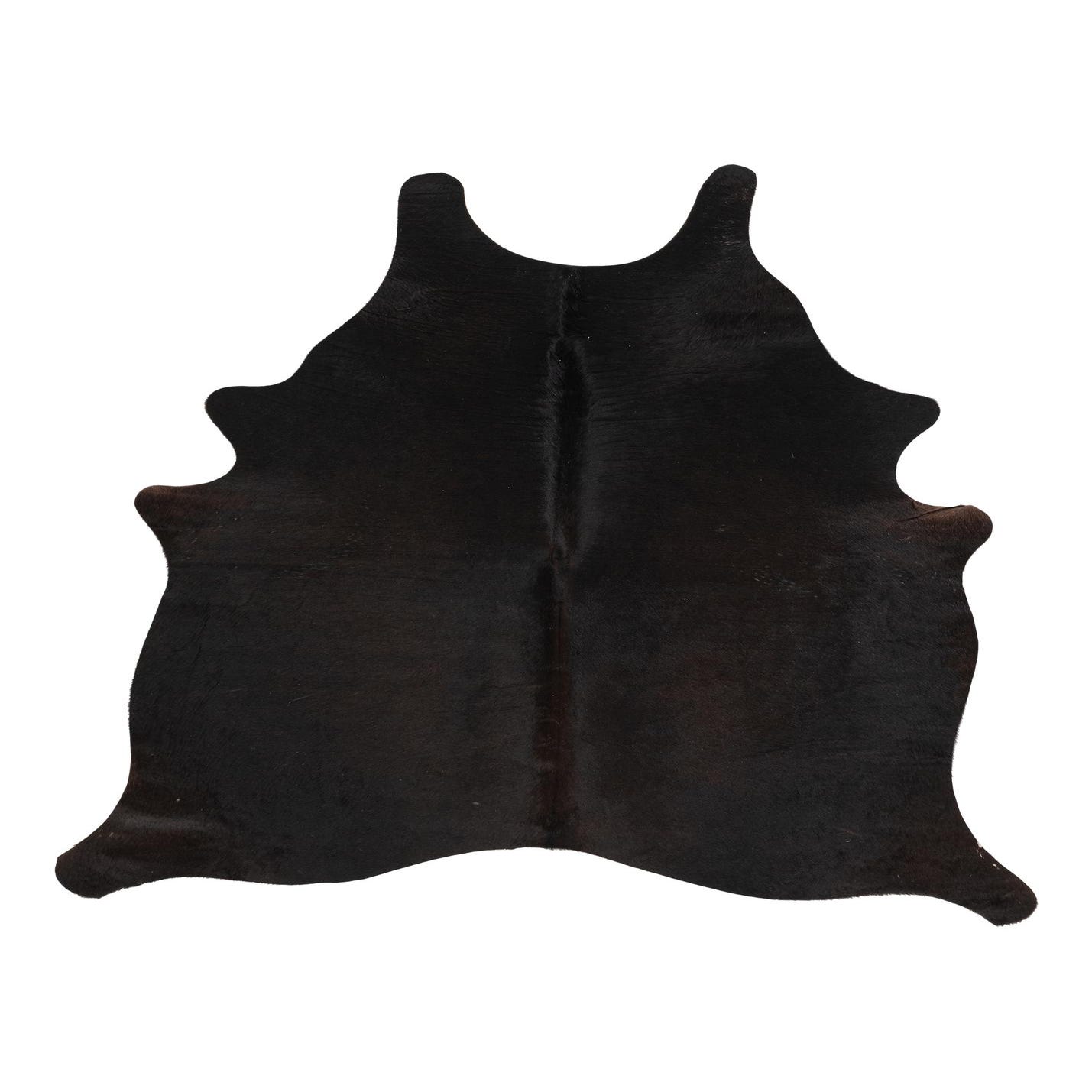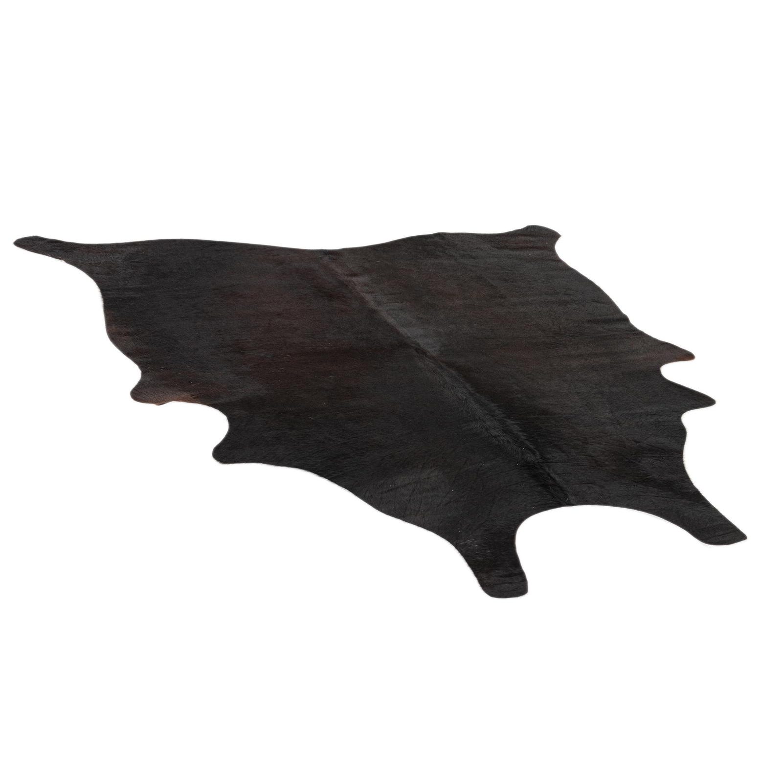 A 4' 9 x 5' 0 freeform black cowhide rug with a natural, irregular shape and short, textured pile.