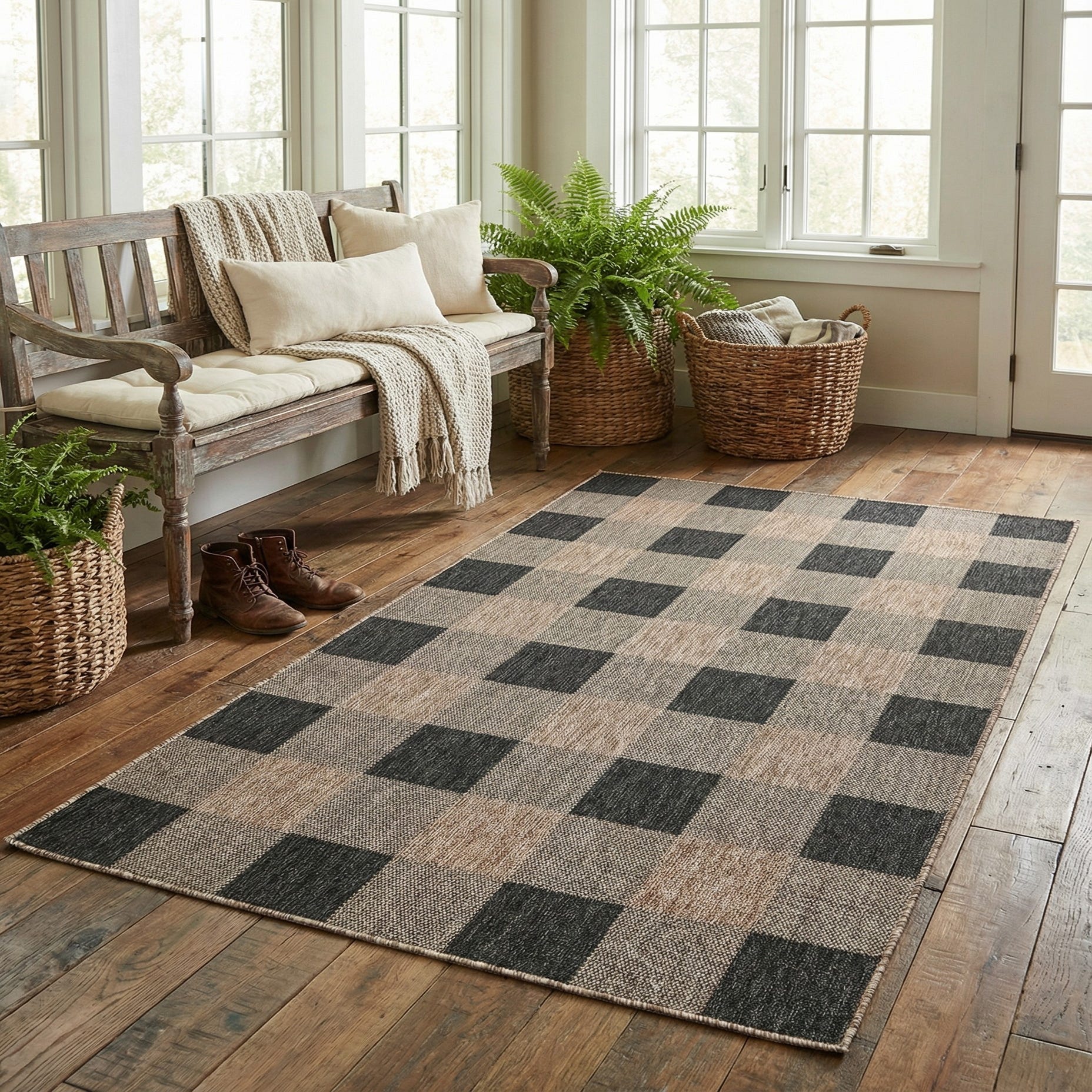 A bold checkered pattern in matte black and warm brown creates a clean, graphic look that anchors both indoor and outdoor spaces. The alternating squares show subtle tonal variation from the woven yarns, giving the design depth without added pile. Machine-made of 100% polypropylene, the rug has a low-profile, tightly woven texture that lays flat and feels firm yet slightly textured underfoot, with neat, finished edges.