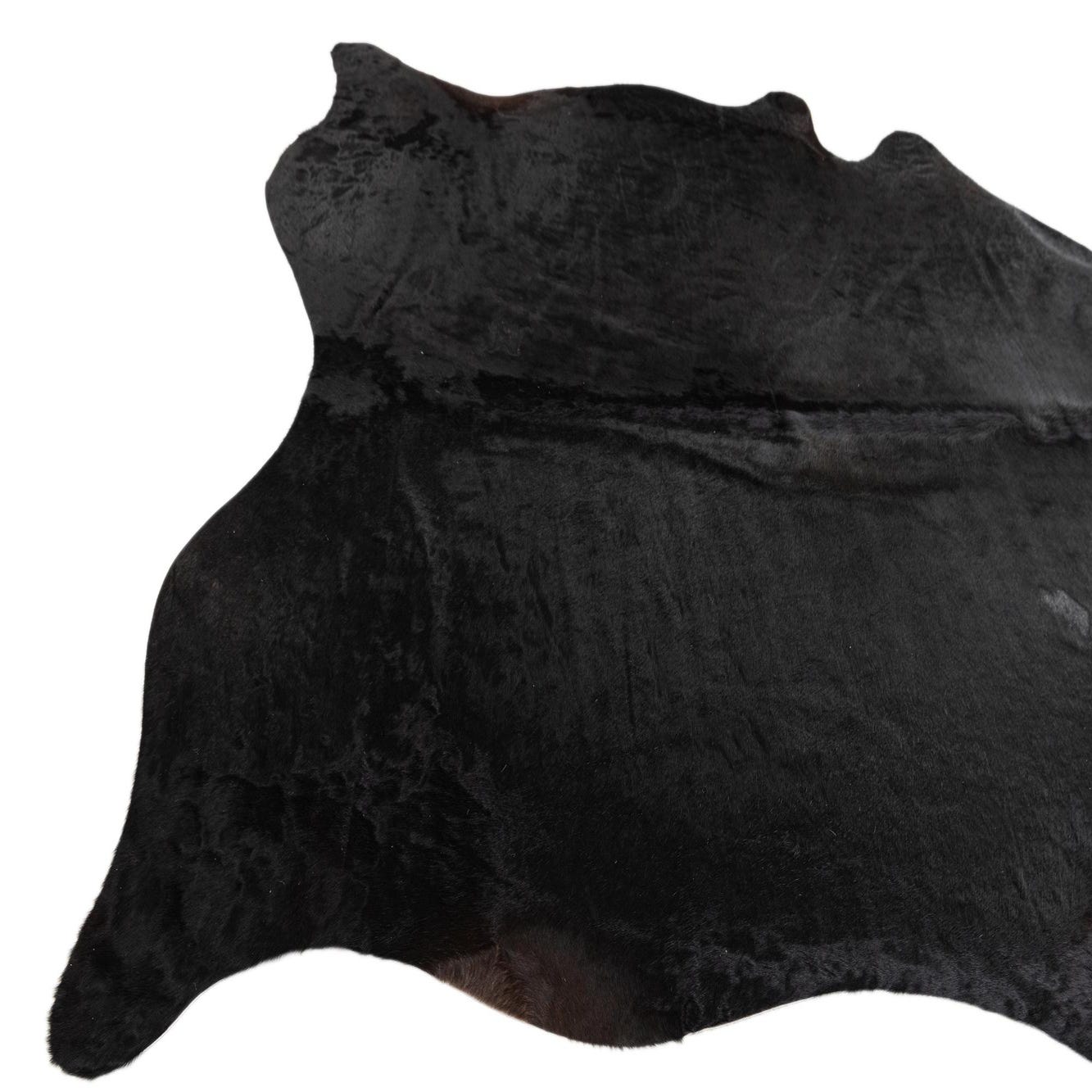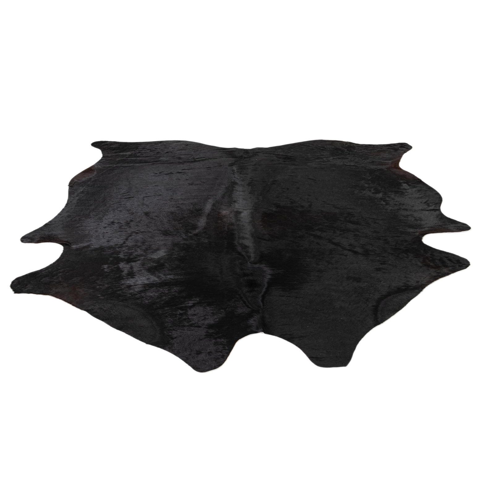 A 6x9 rectangular black cowhide rug with a natural, irregular shape and flat pile, perfect for a modern living room.