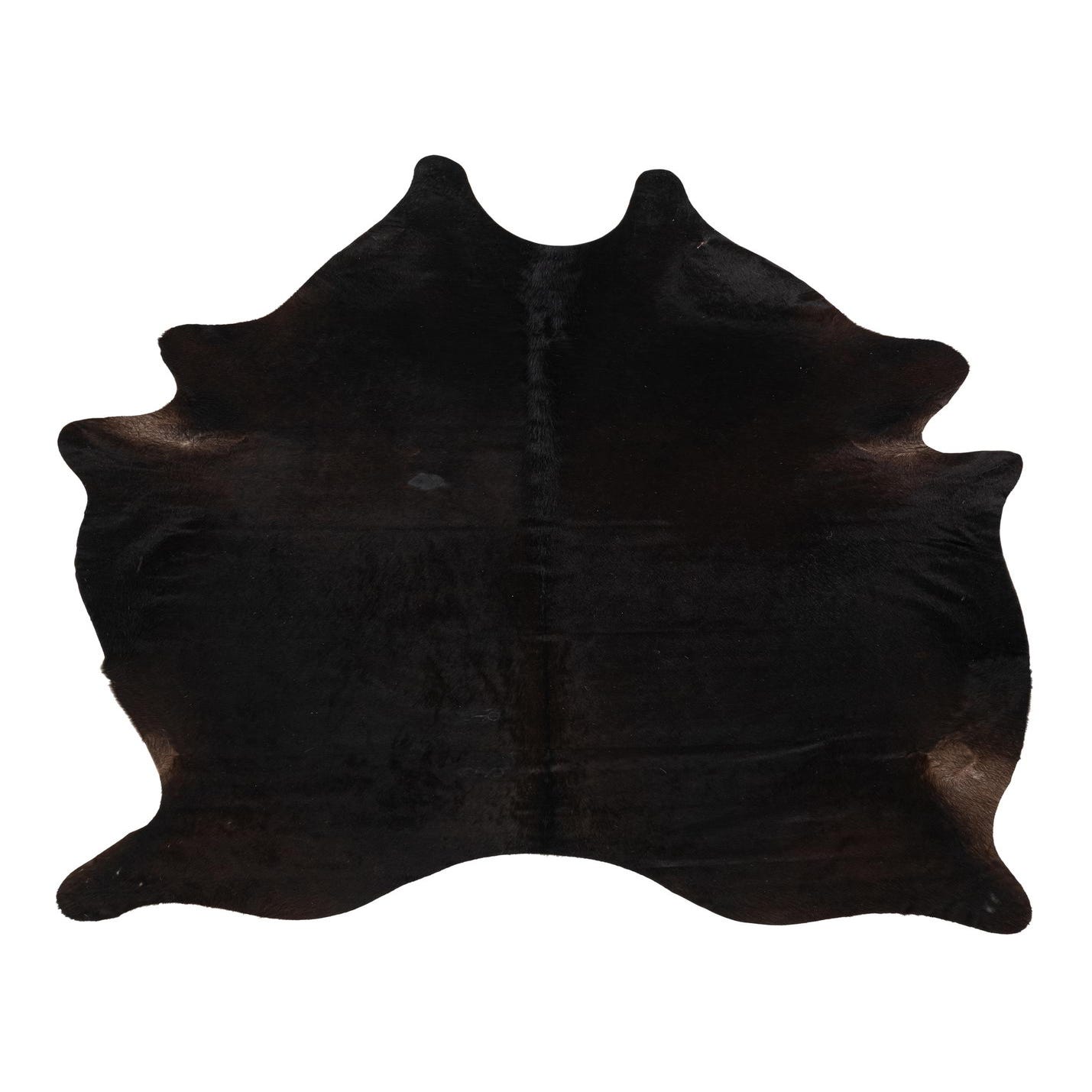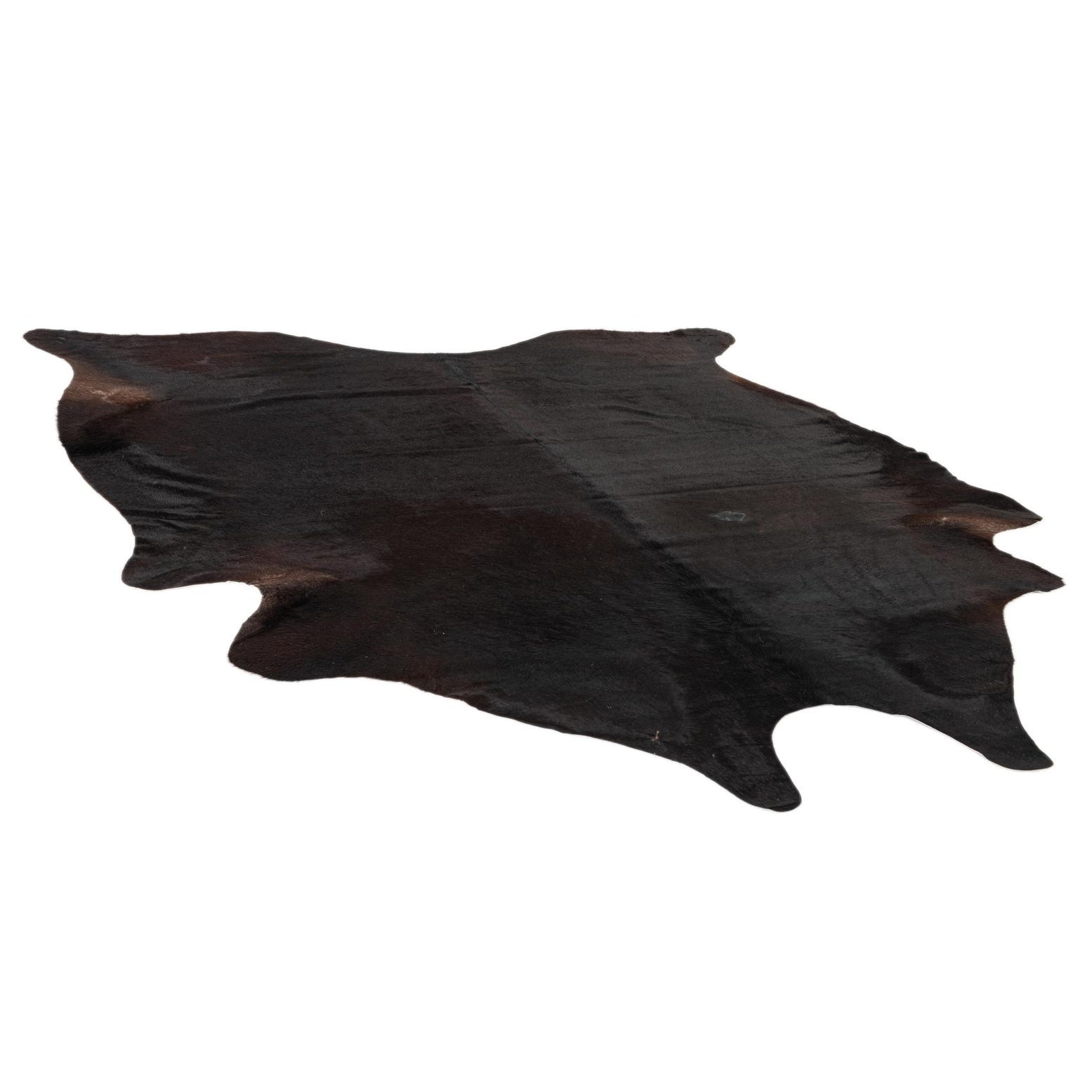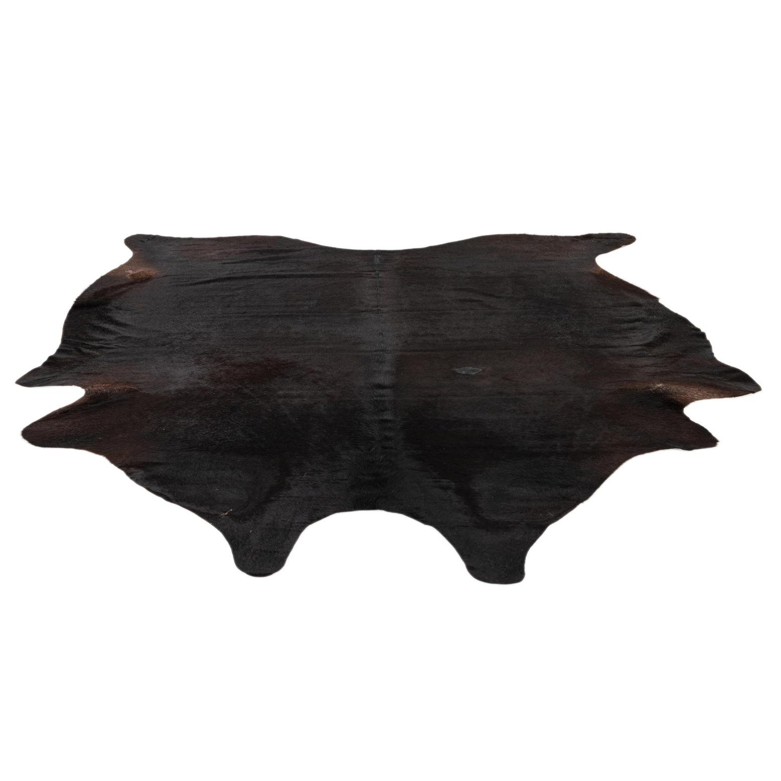 A 6x9 rectangular black cowhide rug with a natural, irregular shape, ideal for a modern living room.