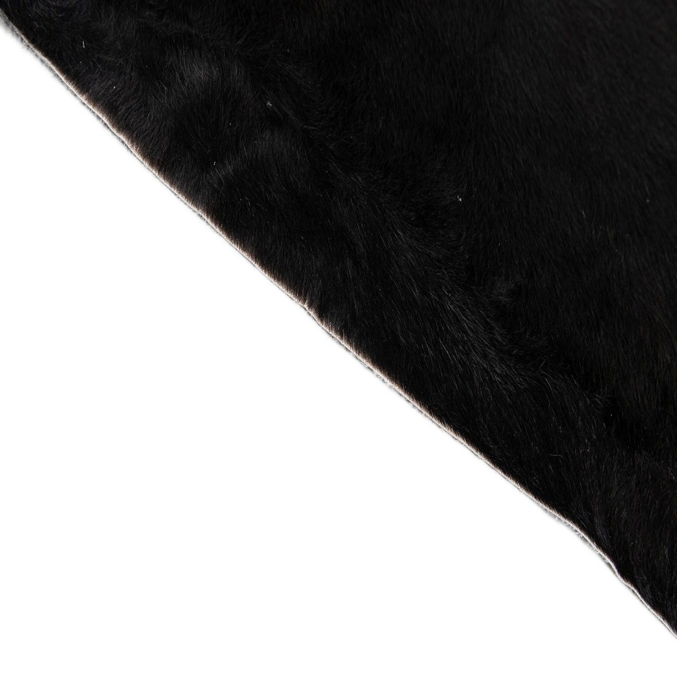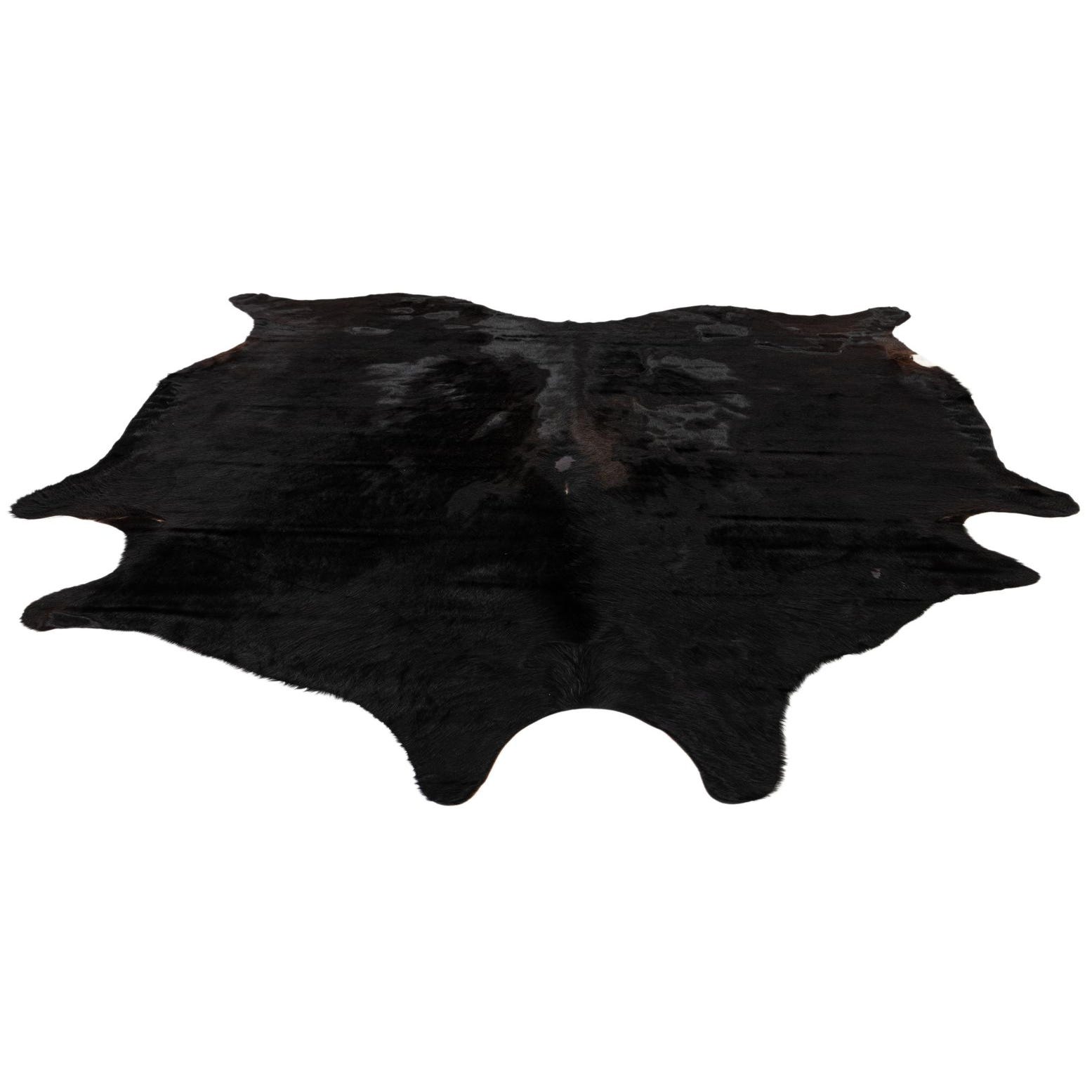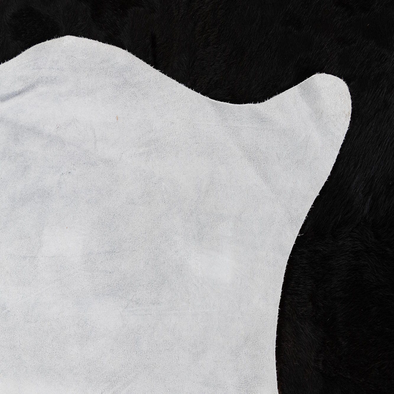 A luxurious 6' 6 x 6' 11 black cowhide leather rug with natural, irregular edges, showcasing its modern style.