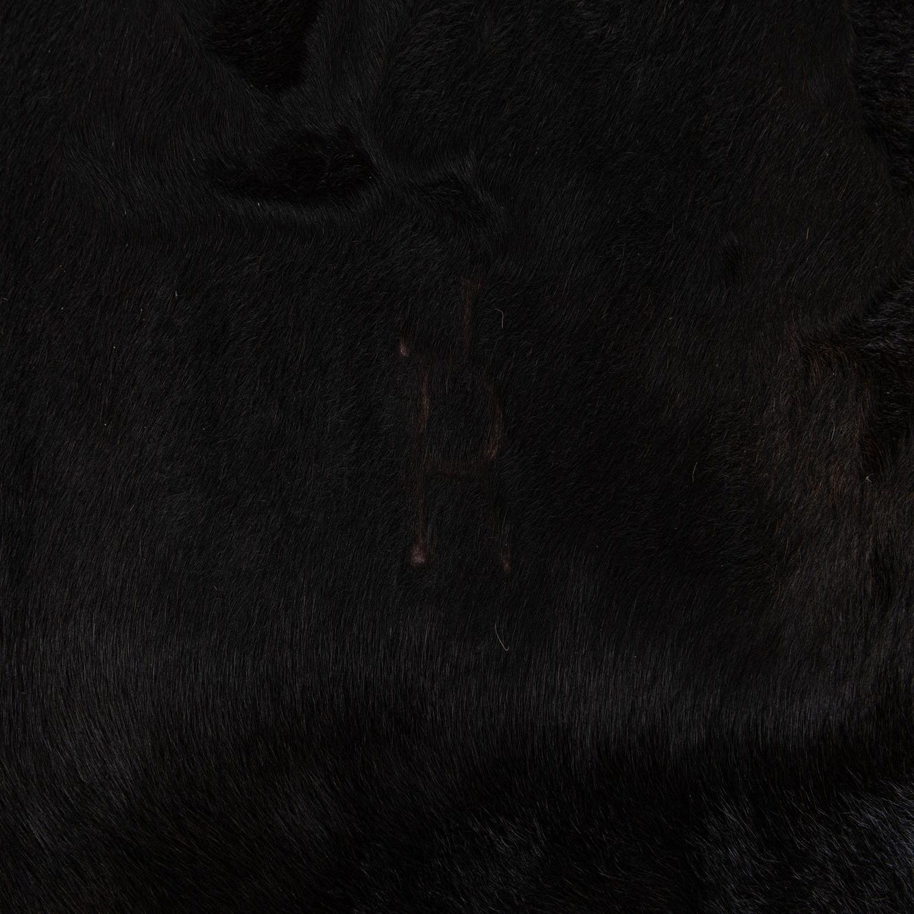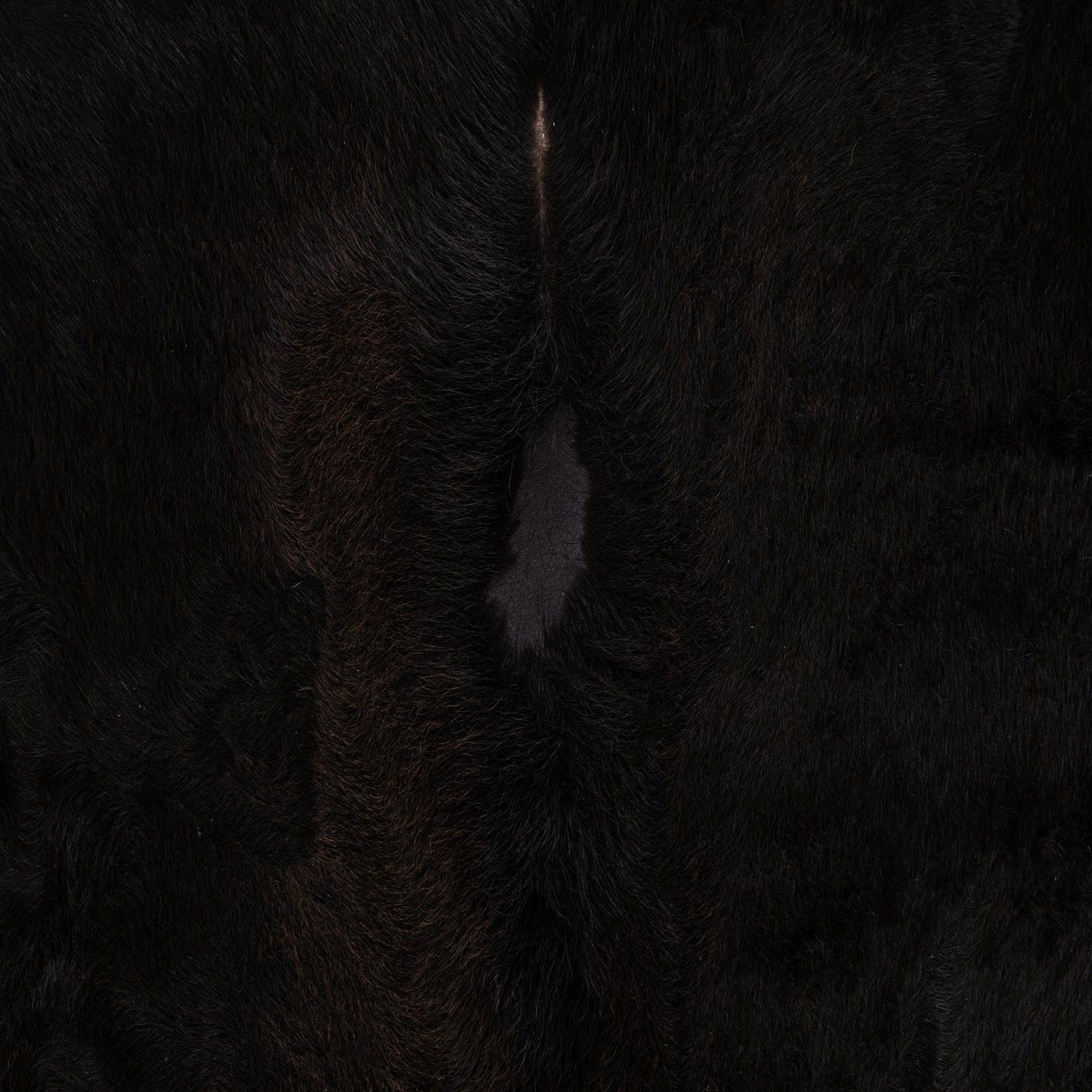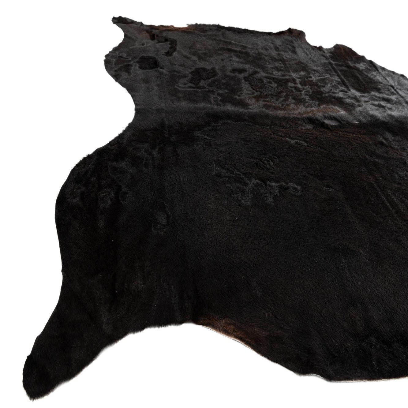 A luxurious 6' 6 x 6' 11 black cowhide leather rug with natural, irregular edges, showcasing its modern style.