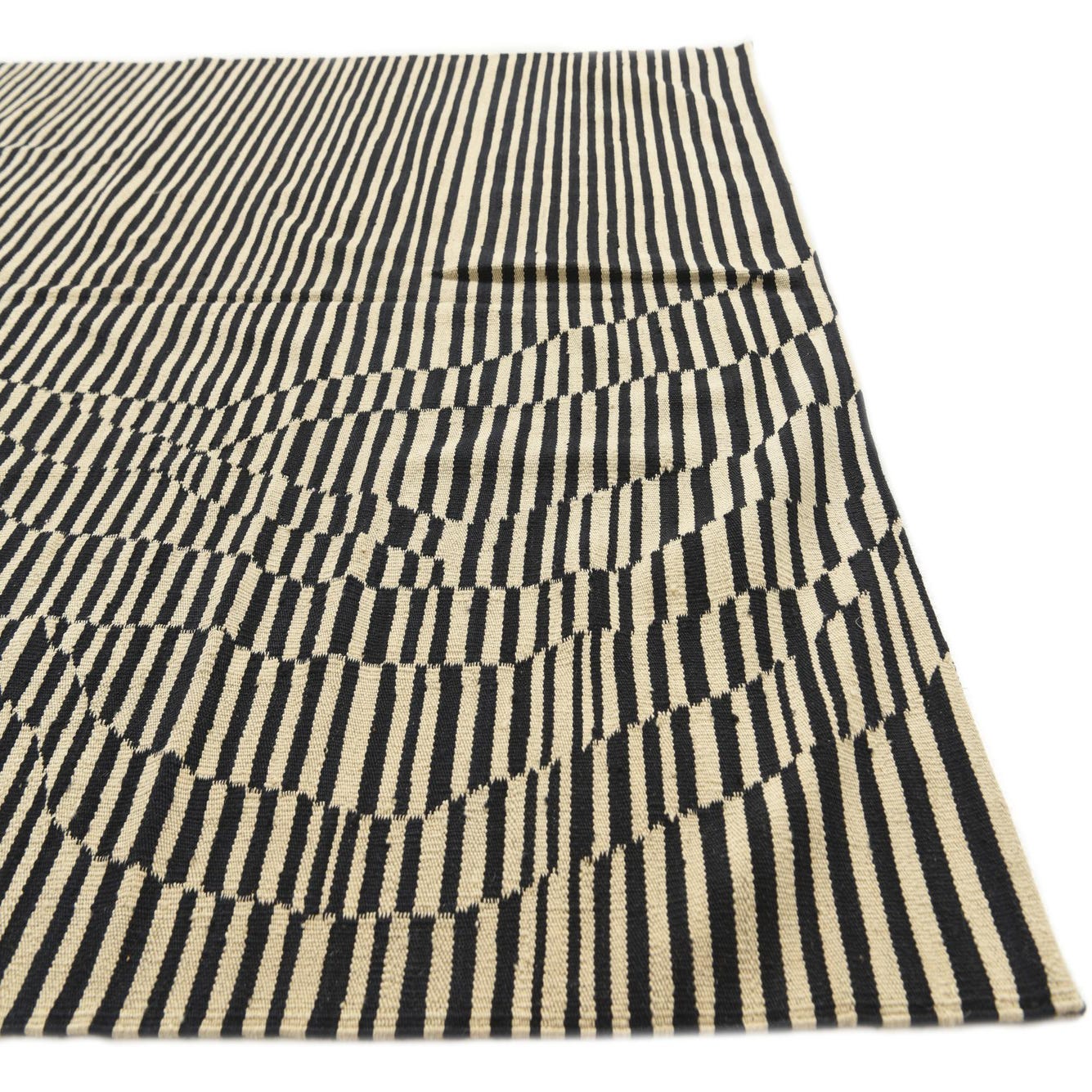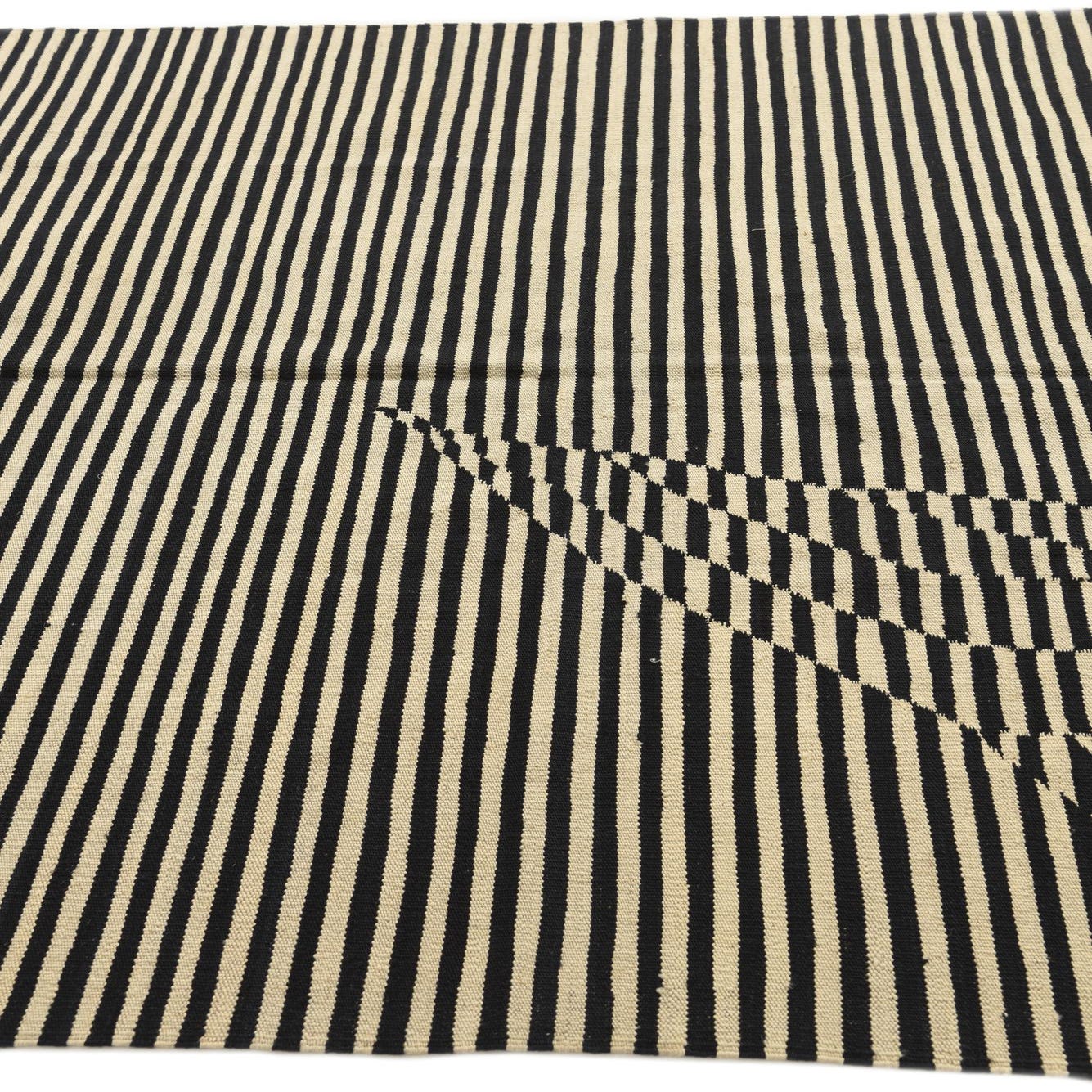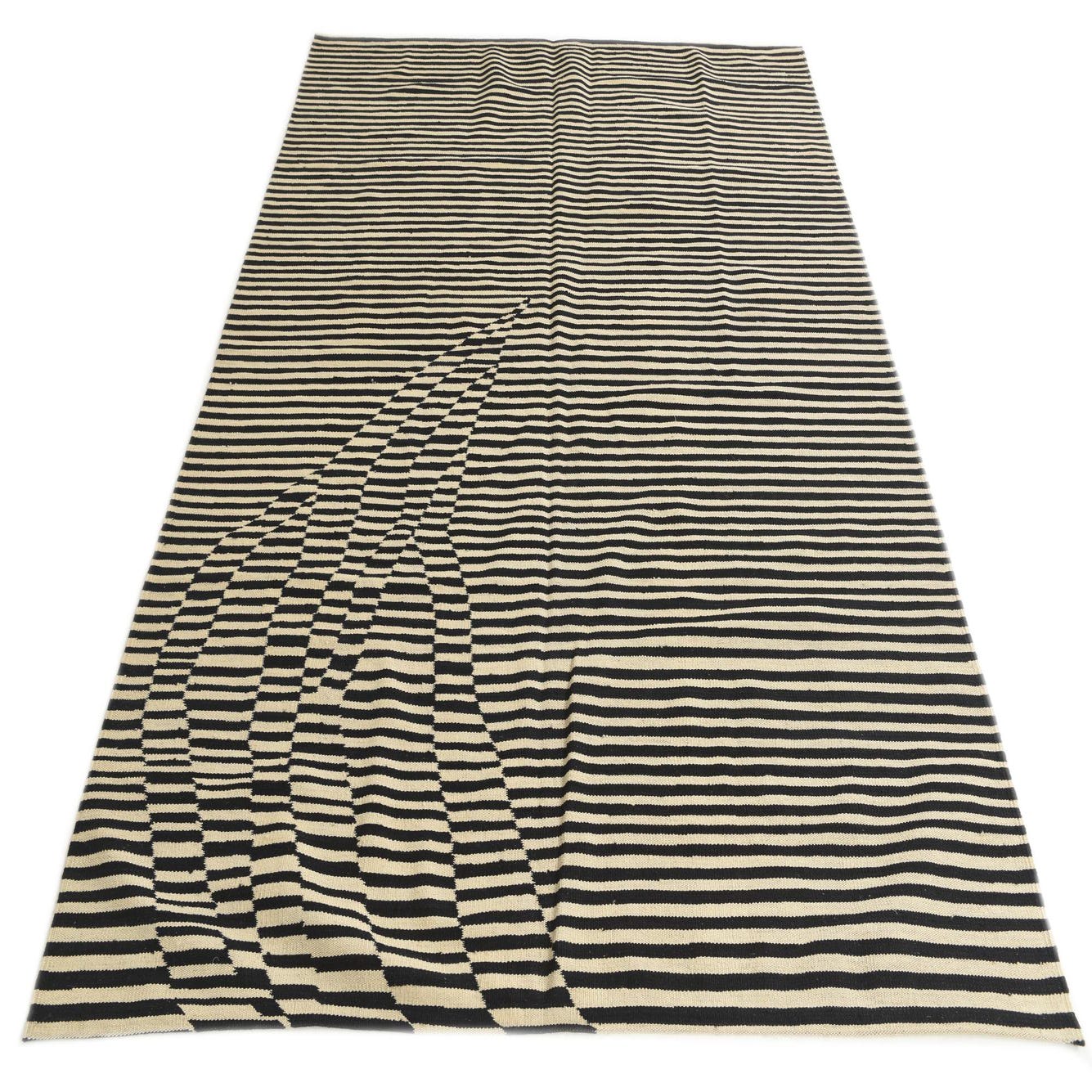 Part of the Kilim Modern collection, this hand-woven wool rug brings a dynamic visual impact to any room. The design showcases a striking linear pattern, punctuated by a playful distortion that gives the illusion of movement. Its color palette consists of bold black and cream stripes, offering a timeless contrast that is both versatile and impactful.